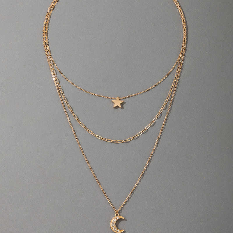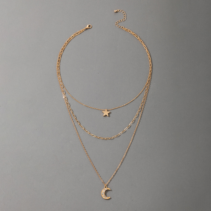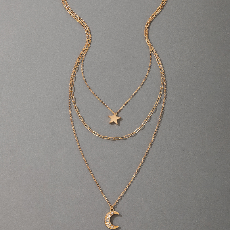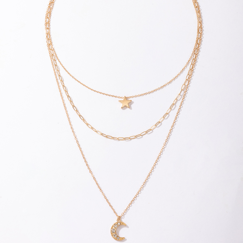 Fleepmart Classical Crystal Star Moon Pendant Necklace for Women Gold Multi-layer Cuban Chain Female Wedding Jewelry Collar