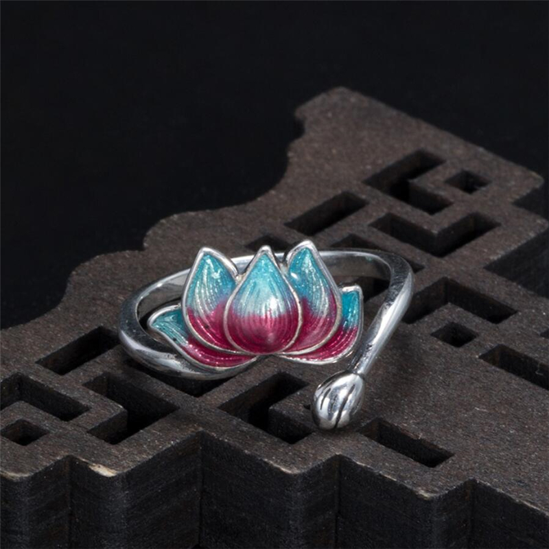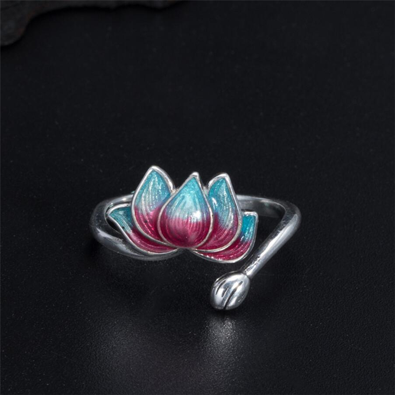 Fleepmart Color Drip Glaze Lotus Creativity Cool 925 Sterling Silver Female Resizable Opening Rings