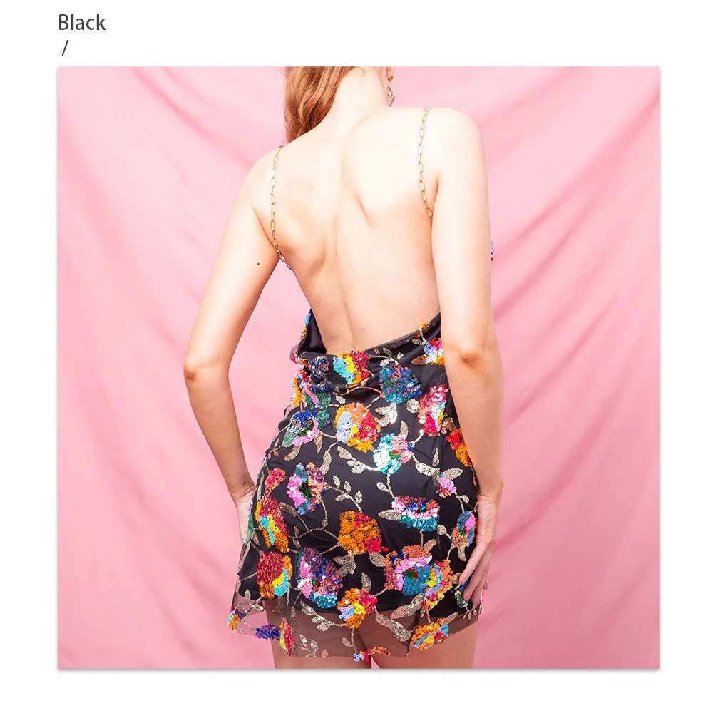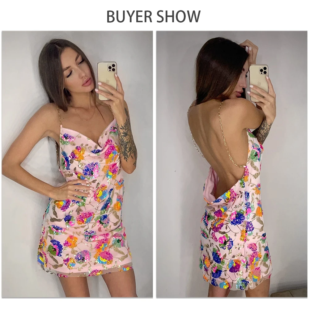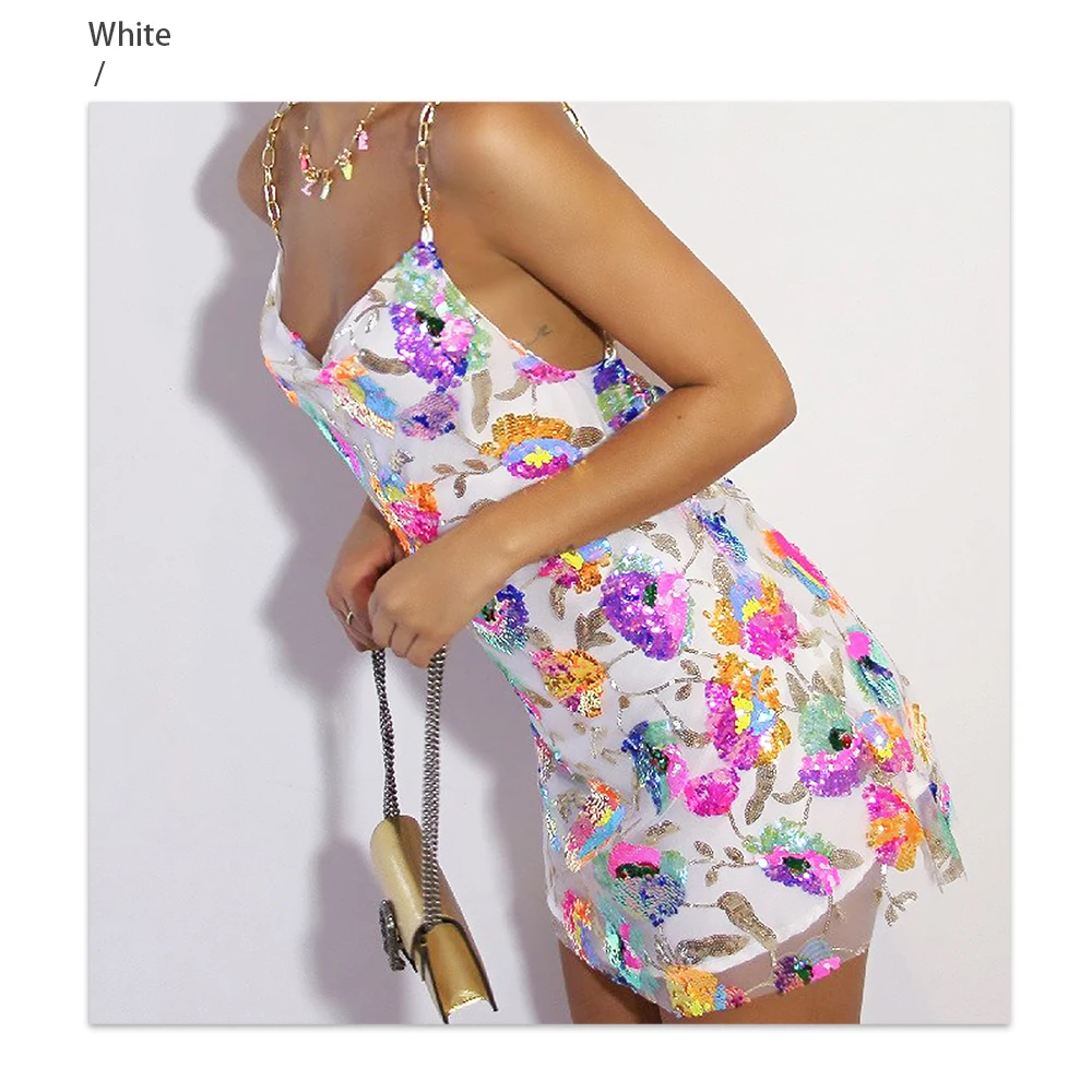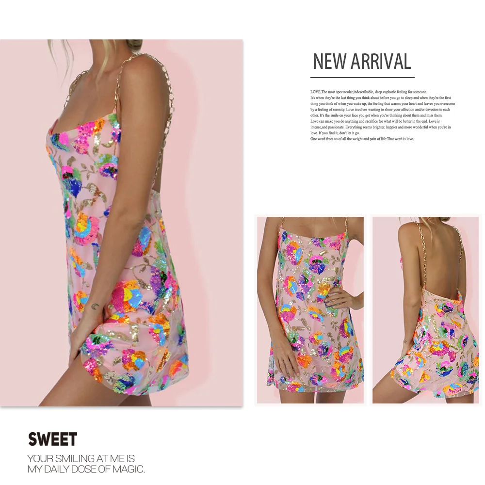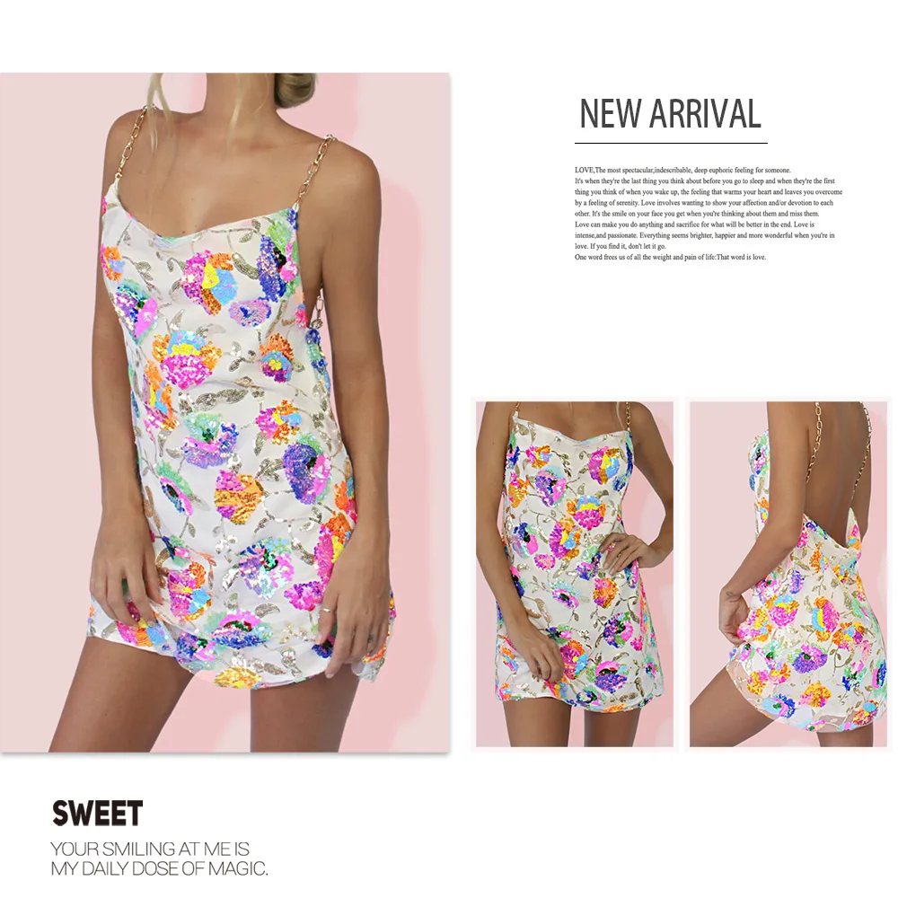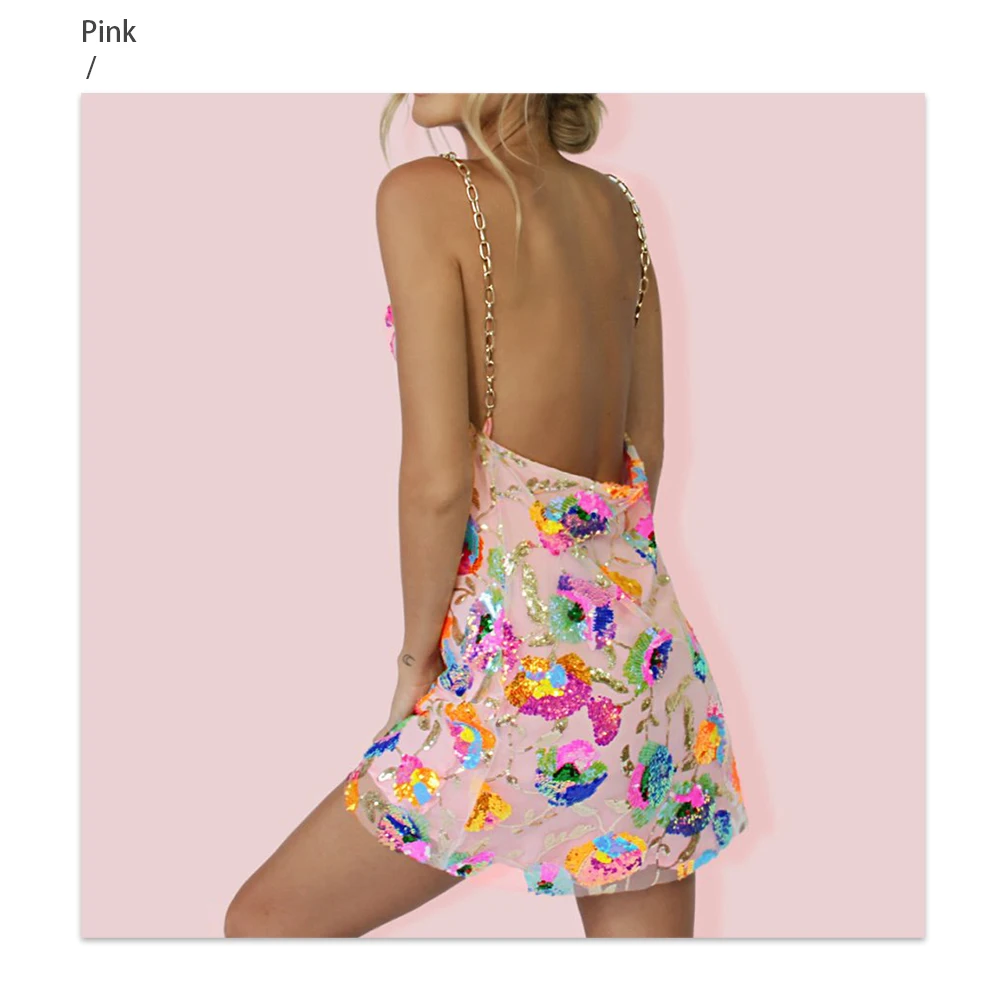 Fleepmart Color Floral Sexy Backless Sequin Summer Dress Leaf Shine Reflective Slip Chain Straps Mini Beach Dresses Woman Party Prom