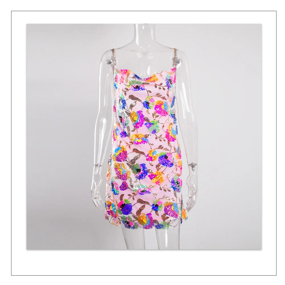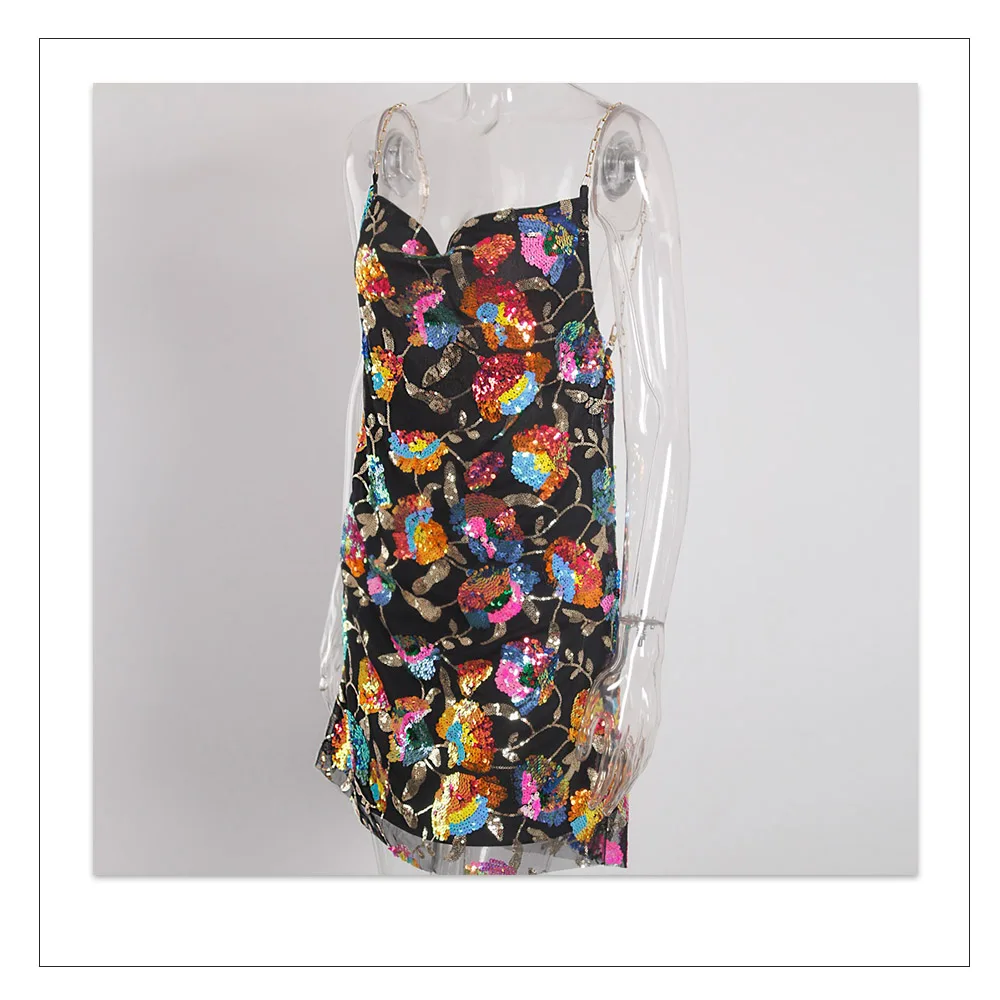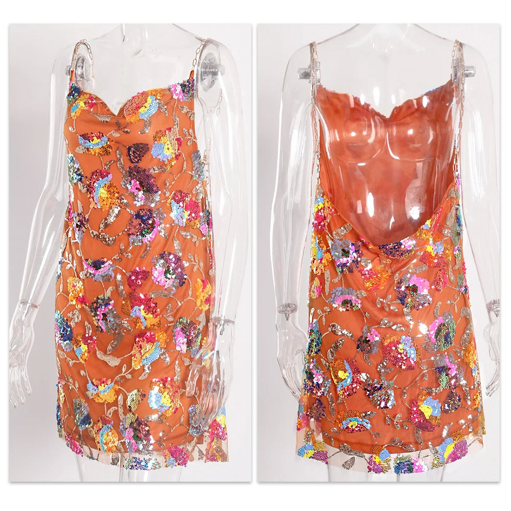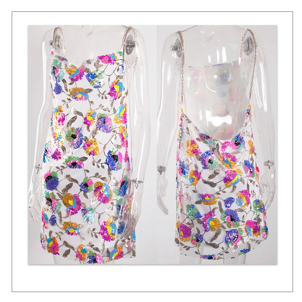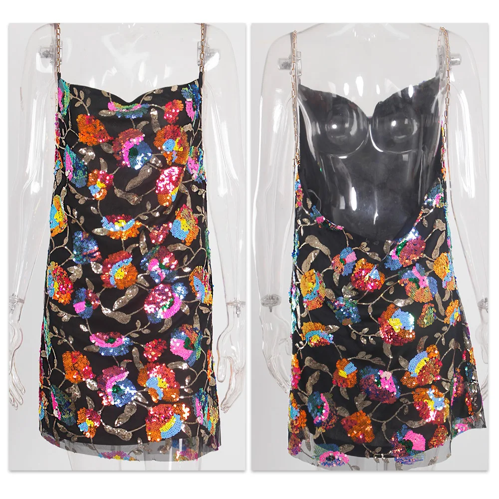 Fleepmart Color Floral Sexy Backless Sequin Summer Dress Leaf Shine Reflective Slip Chain Straps Mini Beach Dresses Woman Party Prom