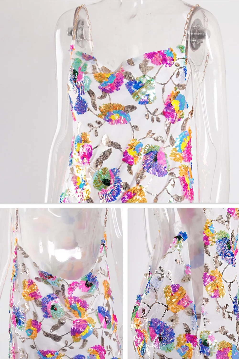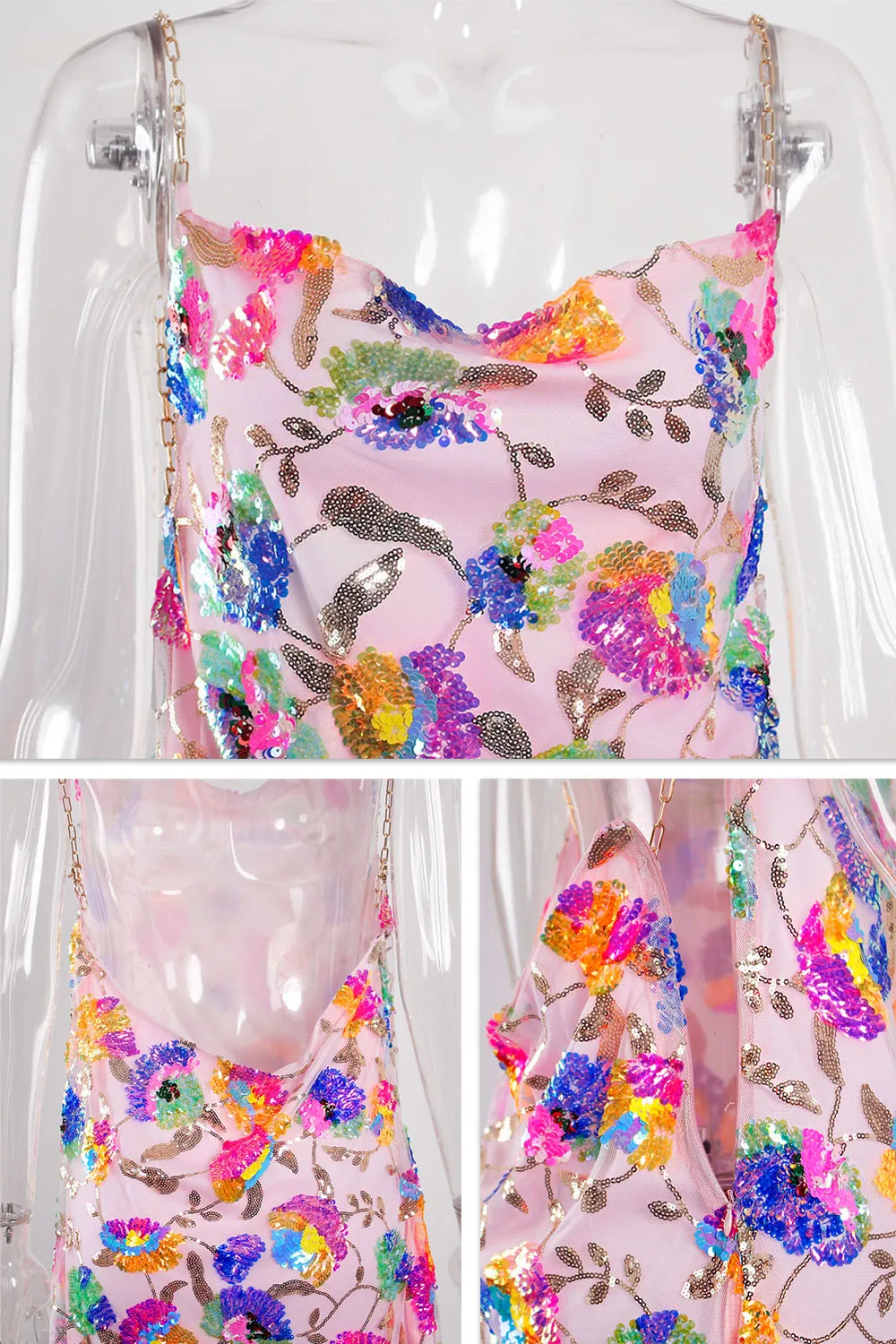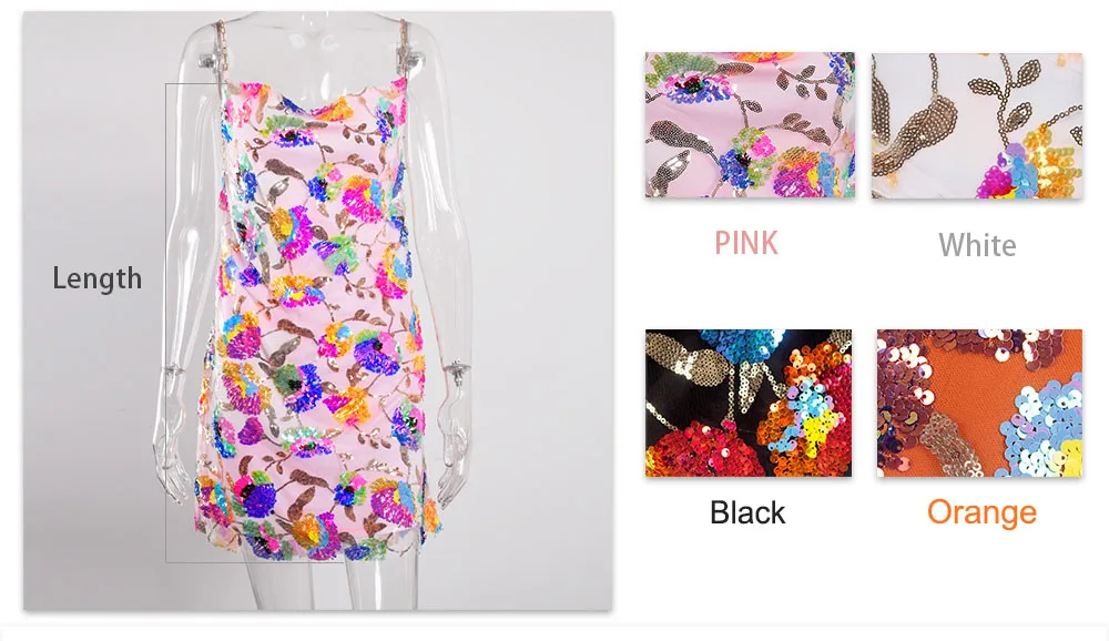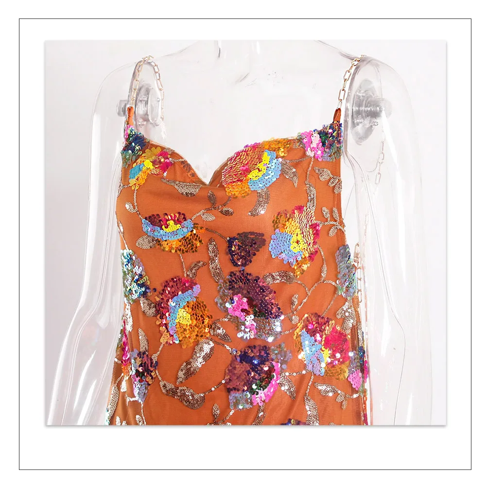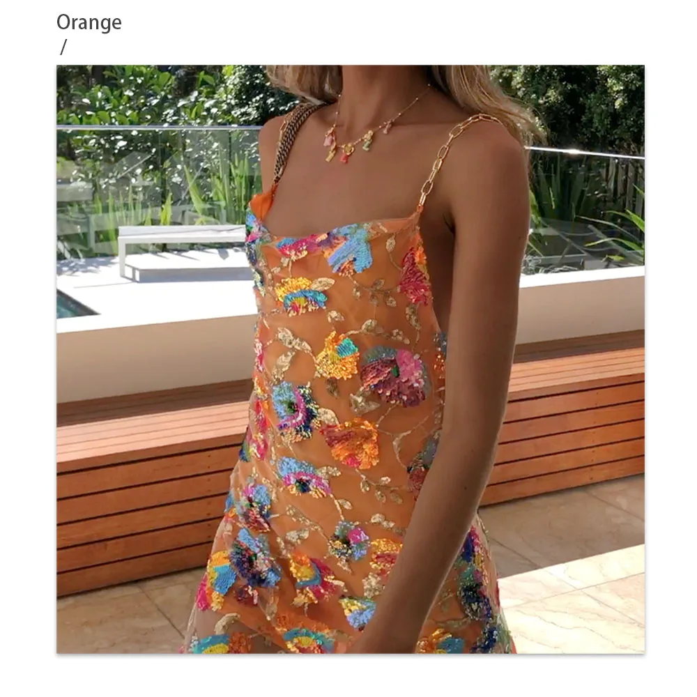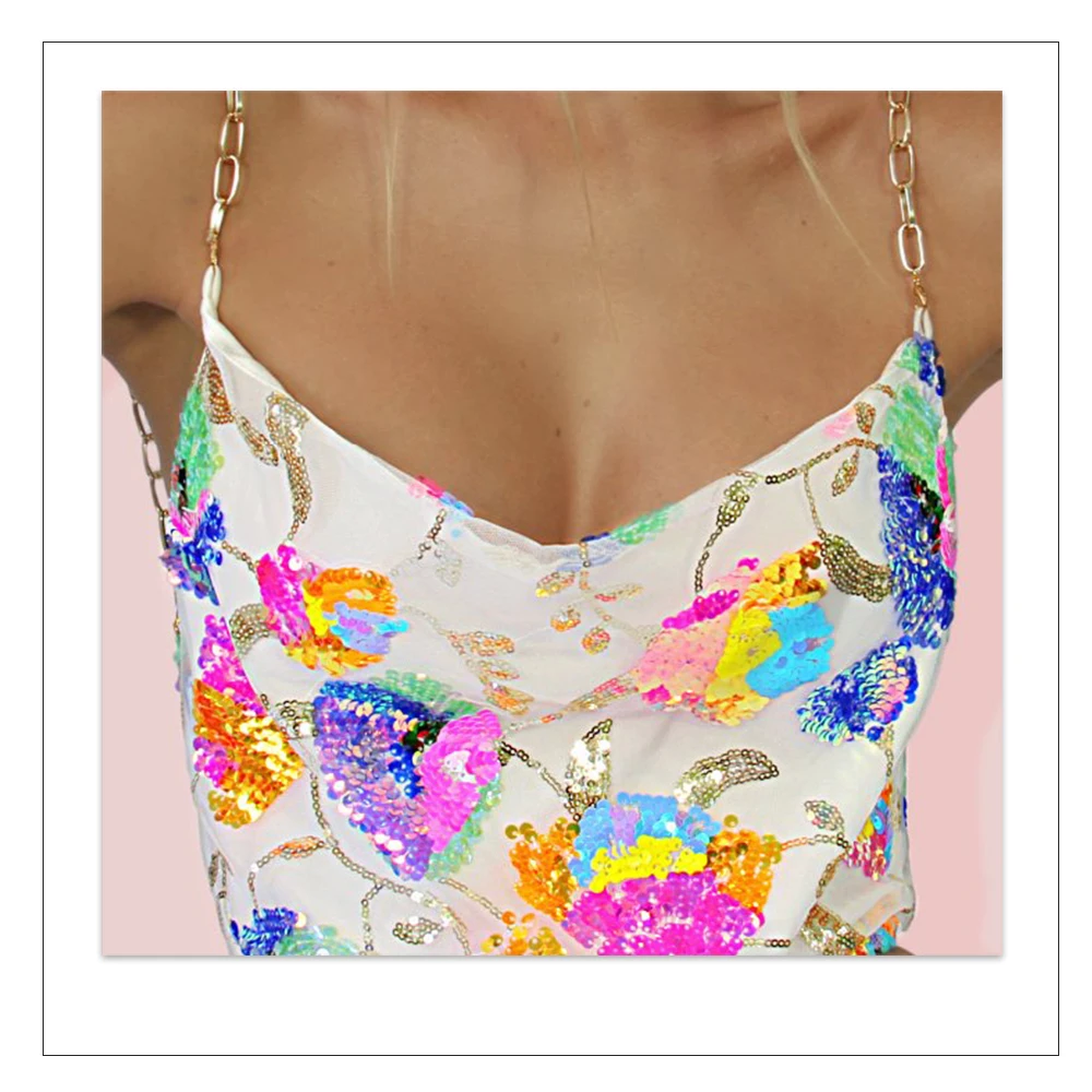 Fleepmart Color Floral Sexy Backless Sequin Summer Dress Leaf Shine Reflective Slip Chain Straps Mini Beach Dresses Woman Party Prom