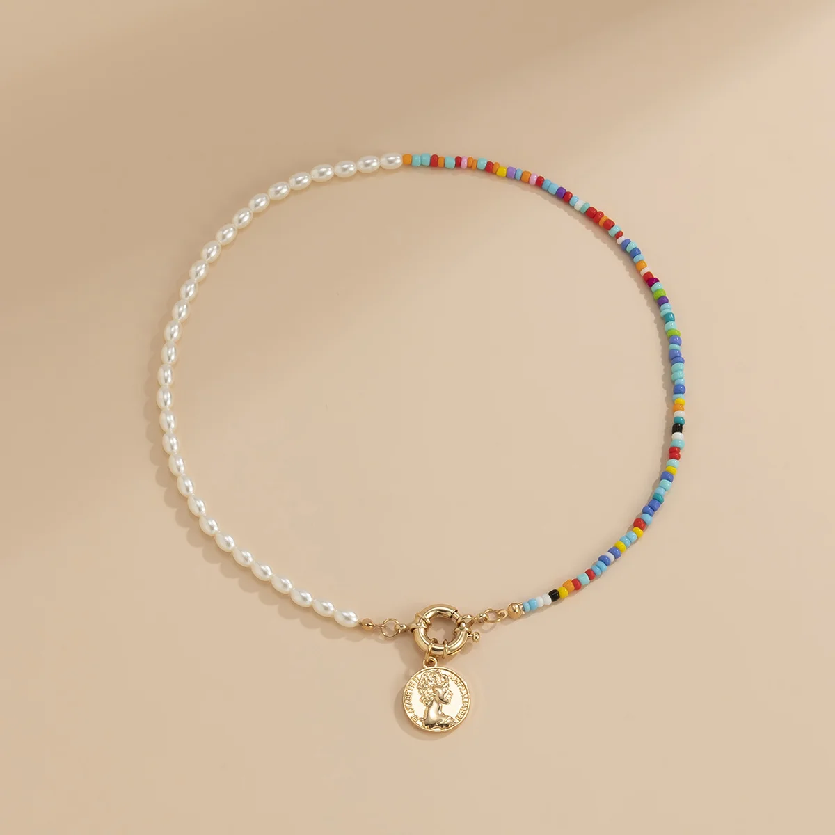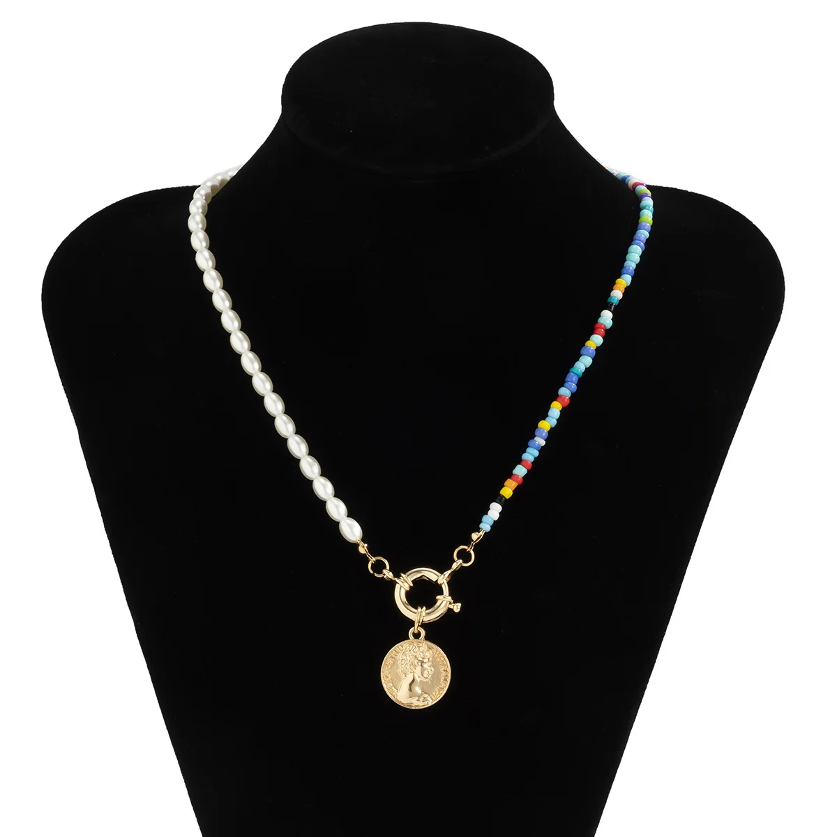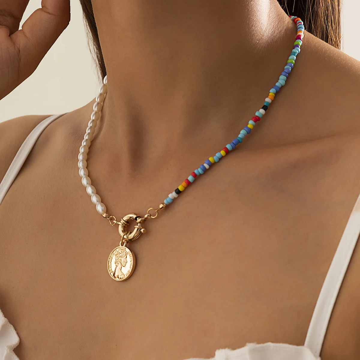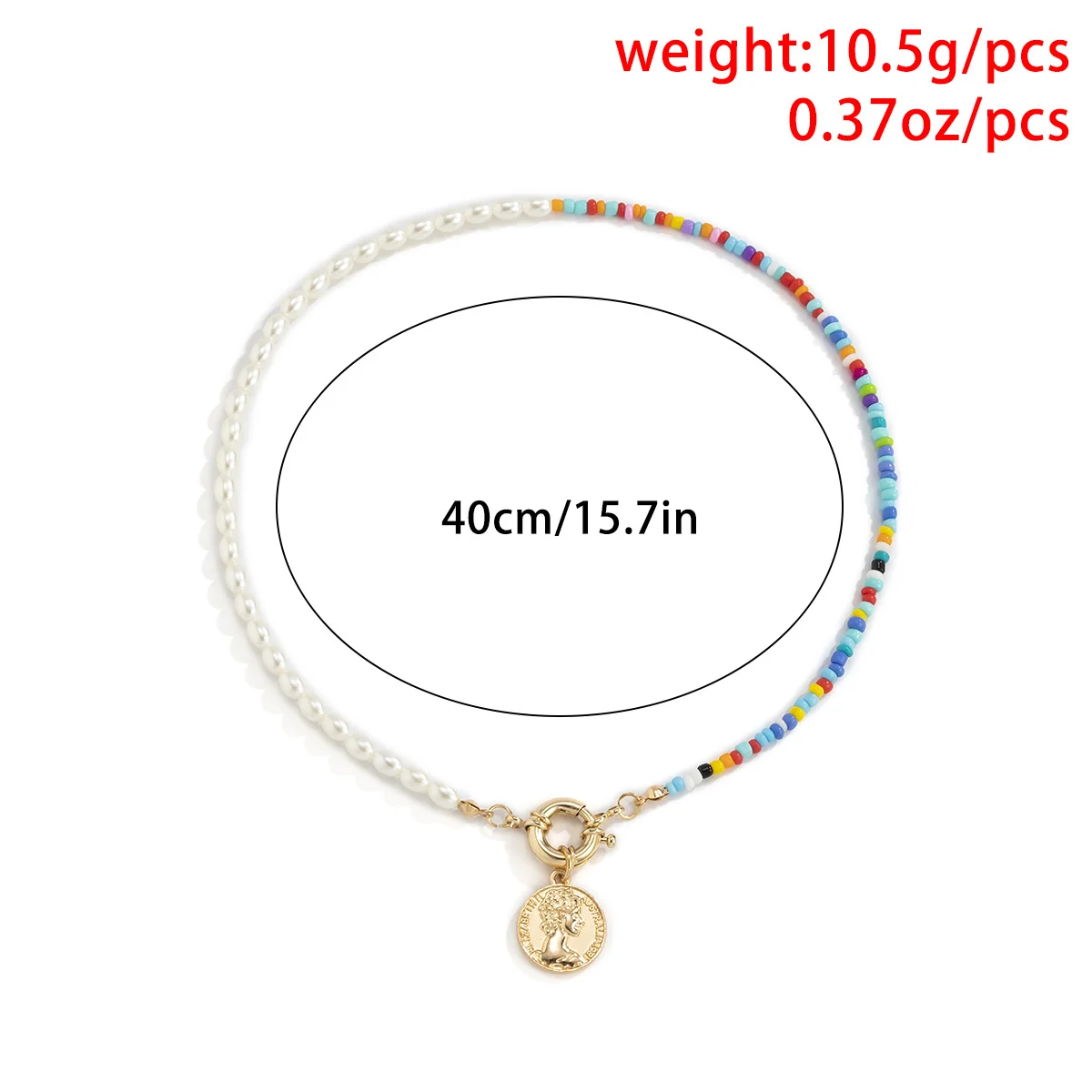 fleepmart Colorful Rainbow Seed Beaded Chain Imitation Pearl Choker Necklaces Carved Coin Portrait Pendant Necklaces Jewelry