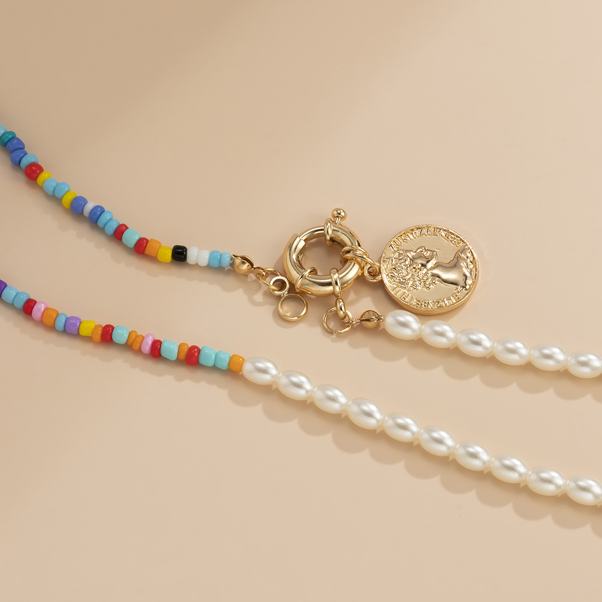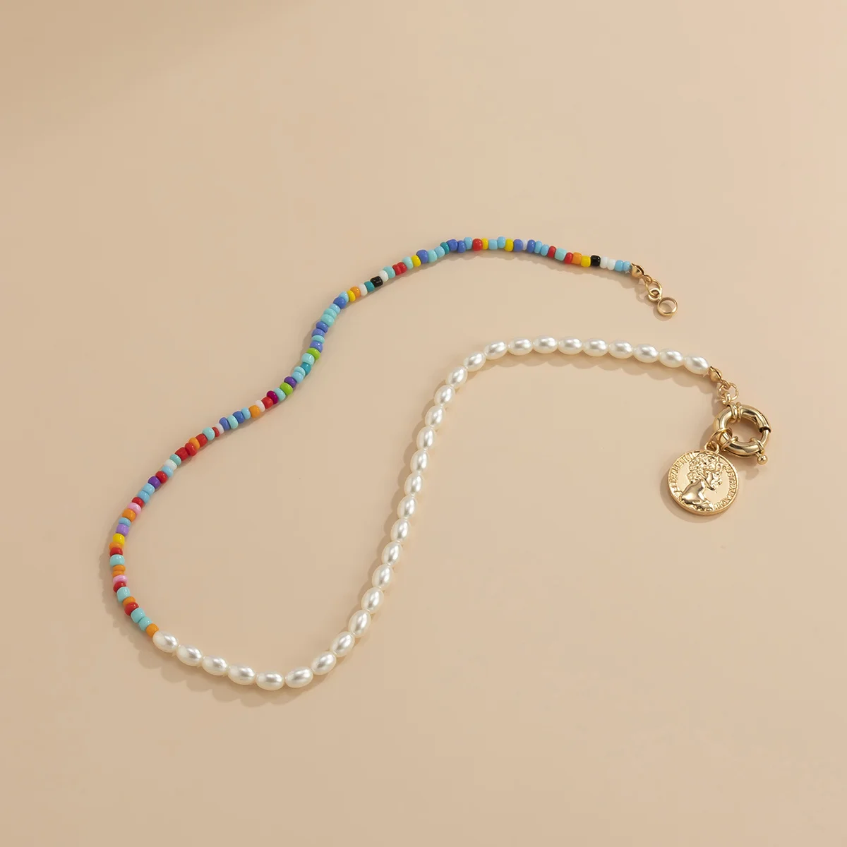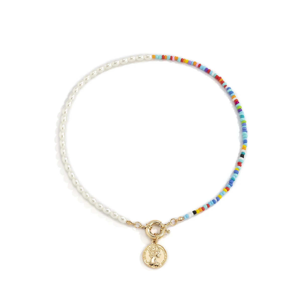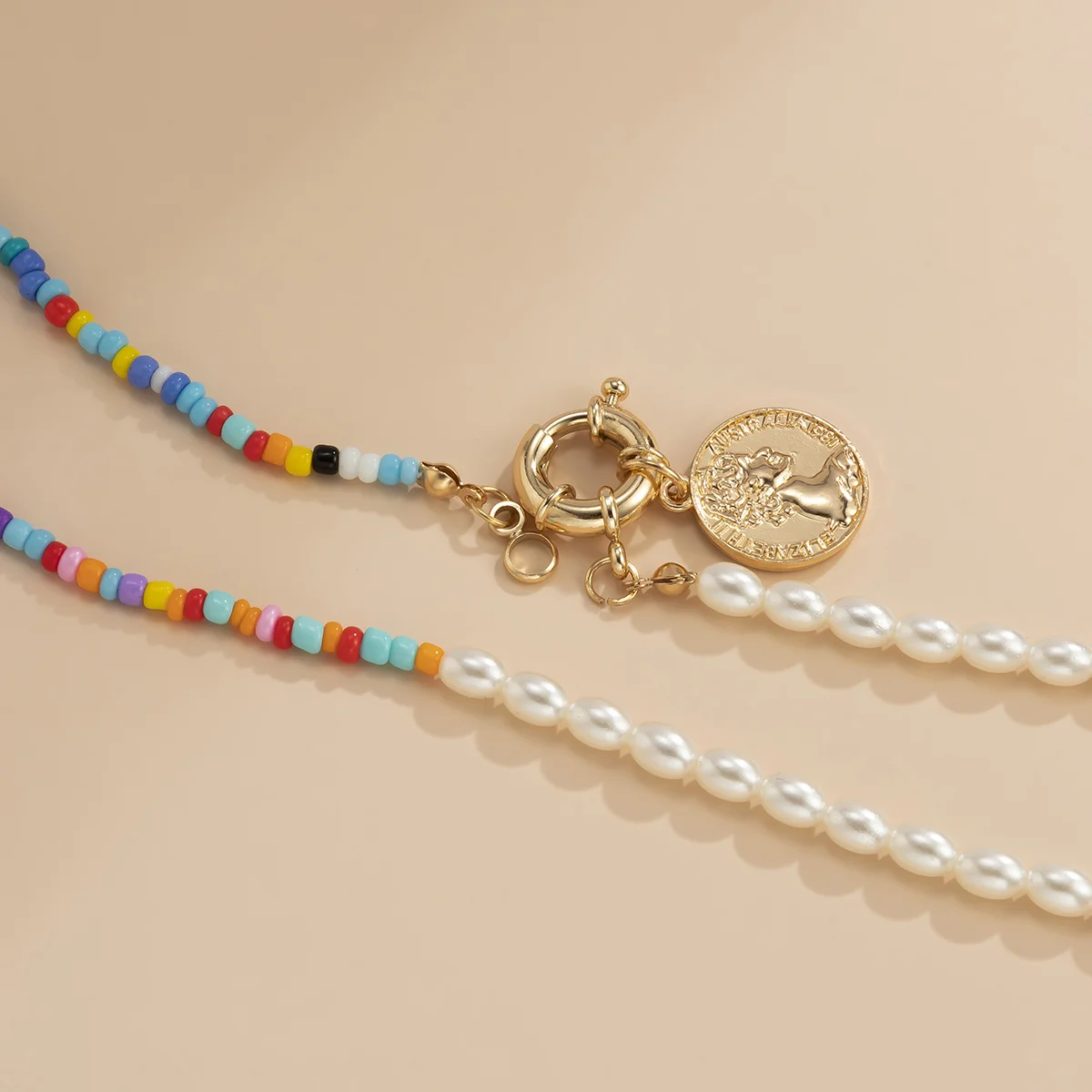 fleepmart Colorful Rainbow Seed Beaded Chain Imitation Pearl Choker Necklaces Carved Coin Portrait Pendant Necklaces Jewelry