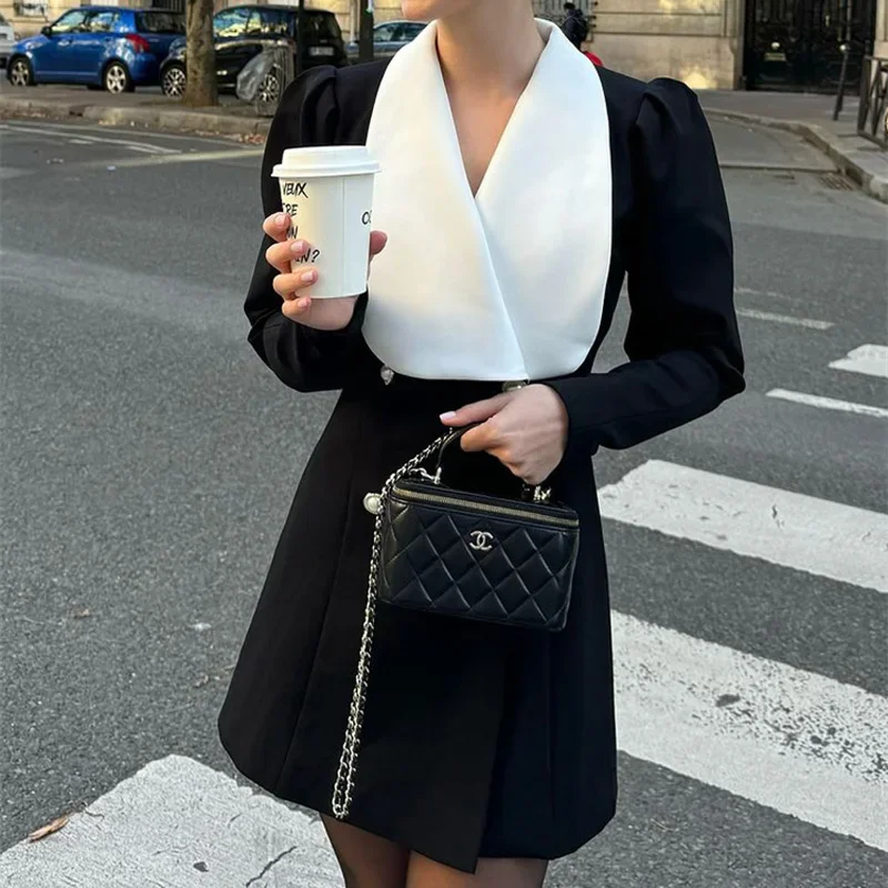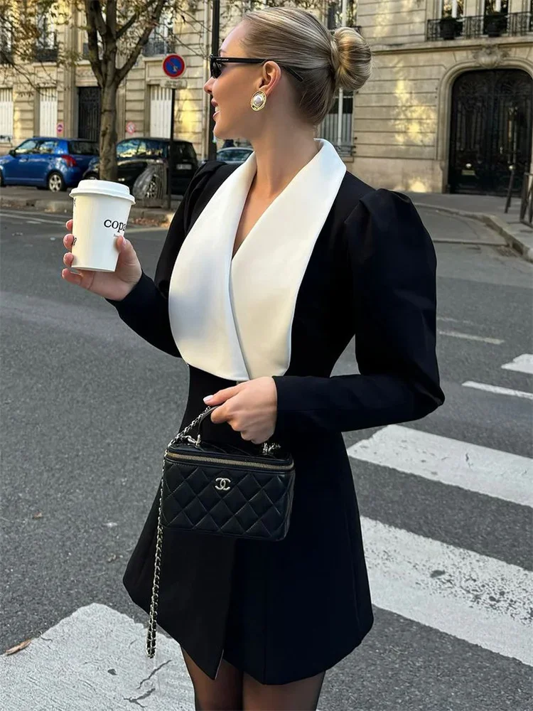 Fleepmart Contrast Color Lapel Suit Elegant Office Woman Outfits Pleated Splice High Waist Mini Dress