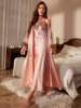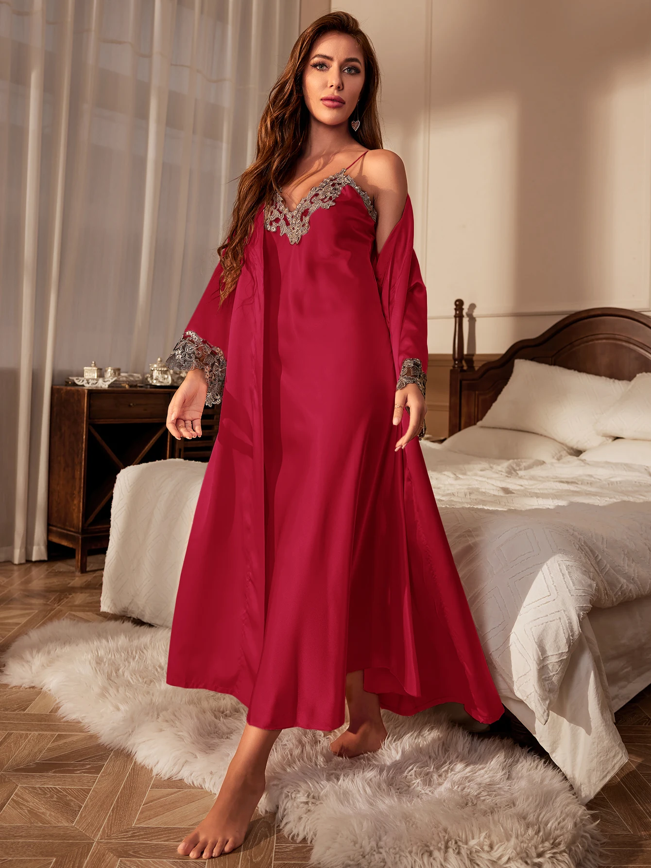 Fleepmart Contrast Lace Pajama Set Long Sleeve Robe With Belt V Neck Slip Dress Women’s Sleepwear Loungewear