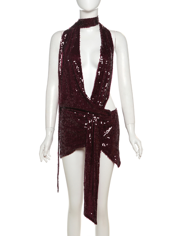 Fleepmart Coquettish Shiny Sequins Dress Women Halter Scarf+Sexy Deep V-Neck Backless Sleeveless Ruched Ribbon Club Hottie Outfits