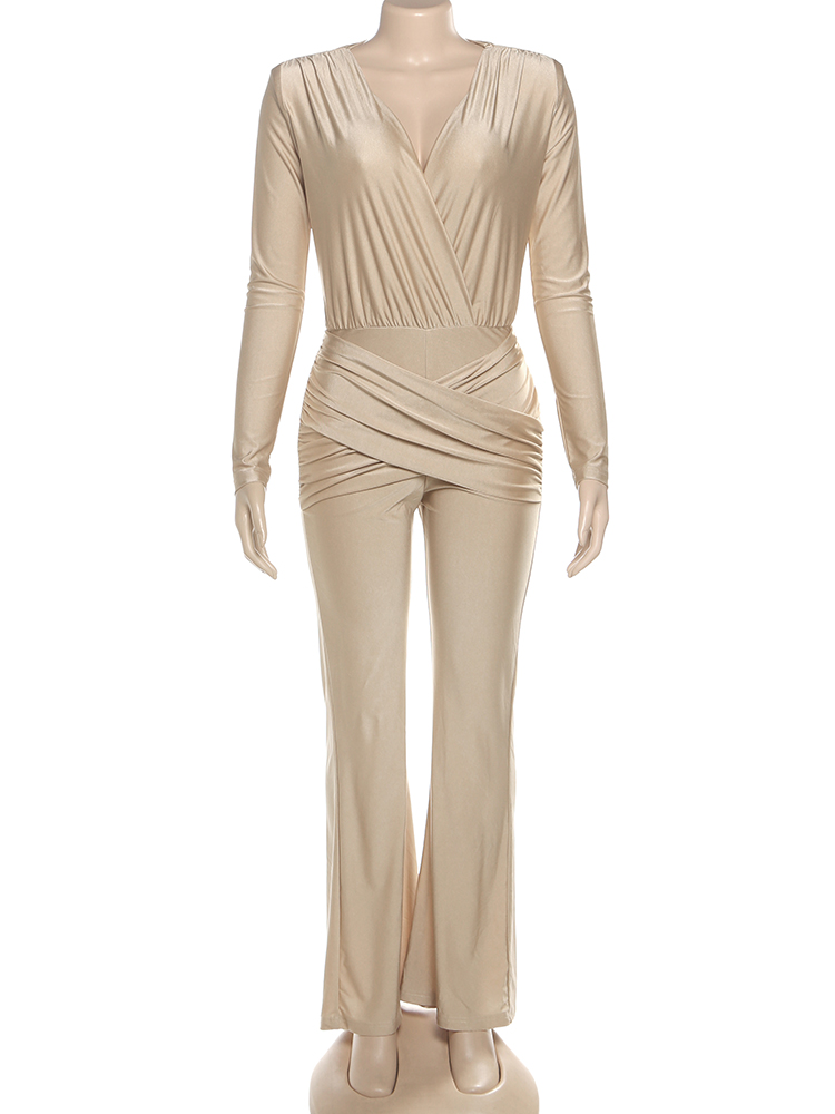 Fleepmart Cross Ruched Jumpsuit Women Patchwork Deep v-Neck Full Sleeve Elegant Skinny Stretch Workout Office Classic Overalls