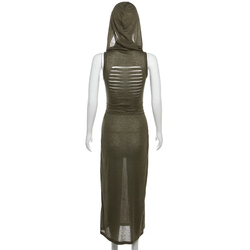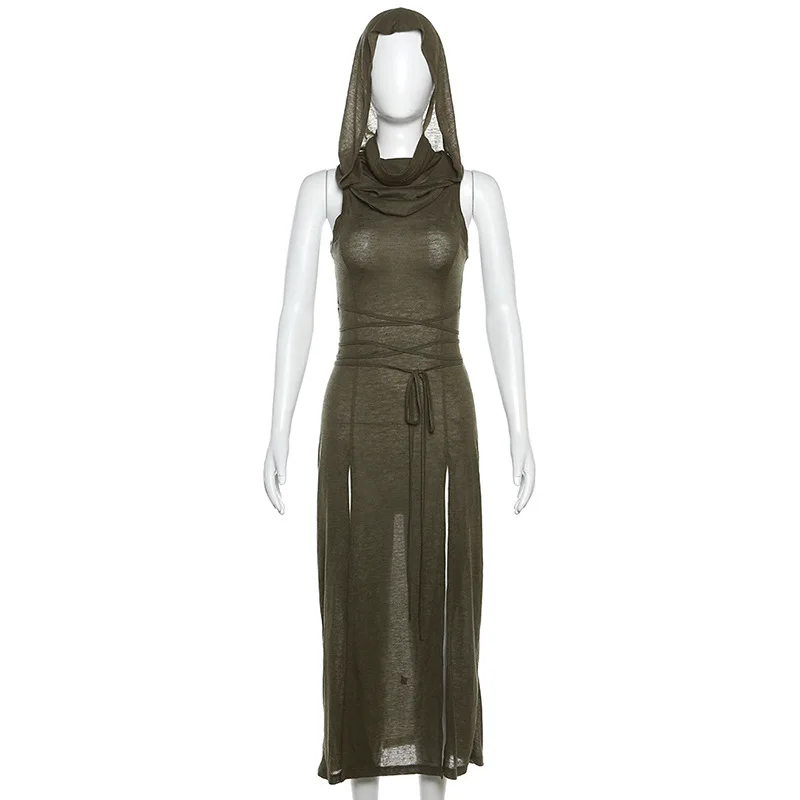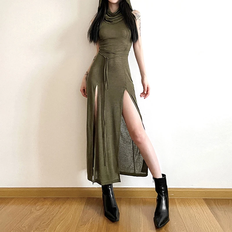 Fleepmart Cyber Gothic Desert Walker Hooded Dresses Y2k Punk Grunge Hollow Out Midi Dress Women Sexy Split Side Solid Streetwear