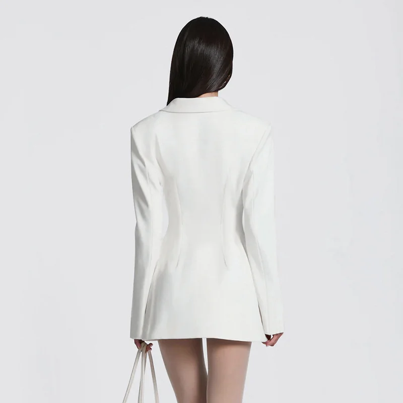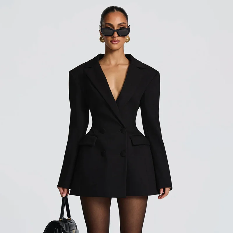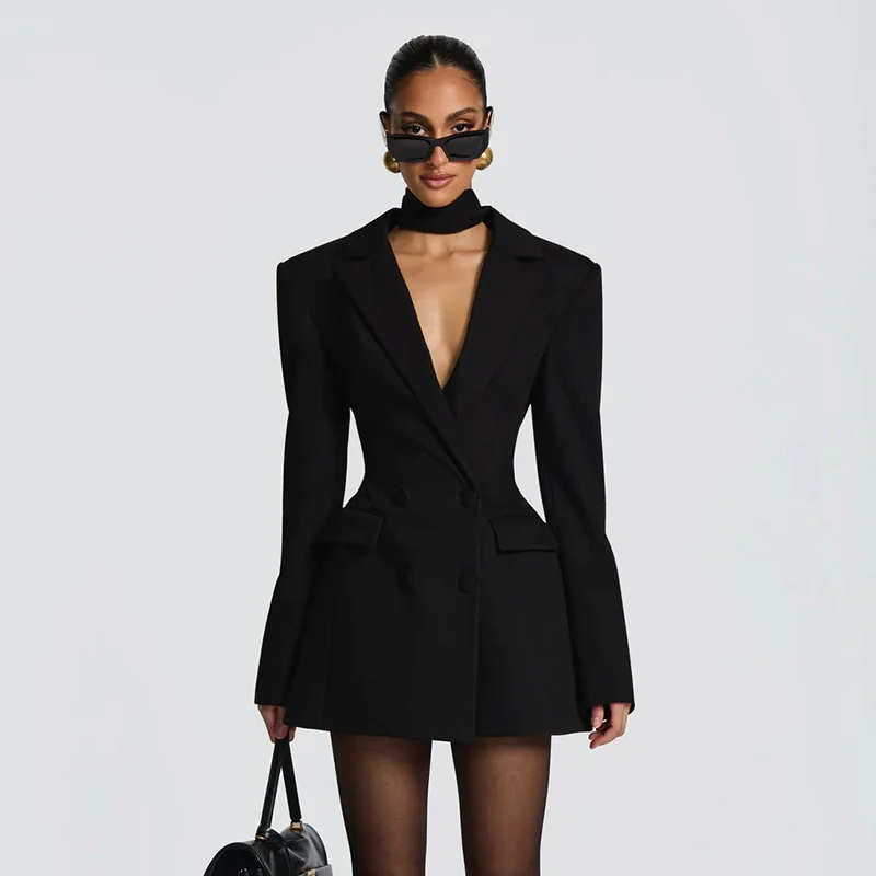 Fleepmart Deep V Neck Long Sleeve Sexy Mini Blazer Dress Women Elegant Double-breasted High Waist Club Party Blazers Dress