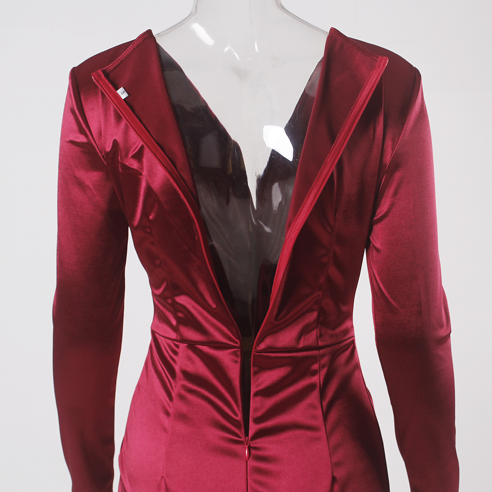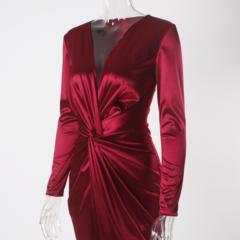 Fleepmart Deep V Neck Ruched Long Stretch Satin Plain Dress Full Sleeved Front Split Floor Length Sexy Evening Party Dress