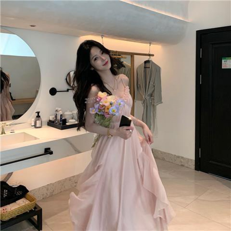 Fleepmart Design Sense Niche Lace Dress for Women Summer New Affordable Luxury Style Pink Fairy Long Slimming Suspender Dress