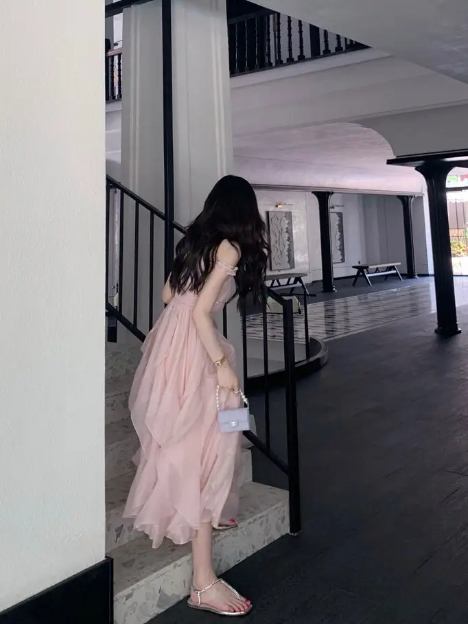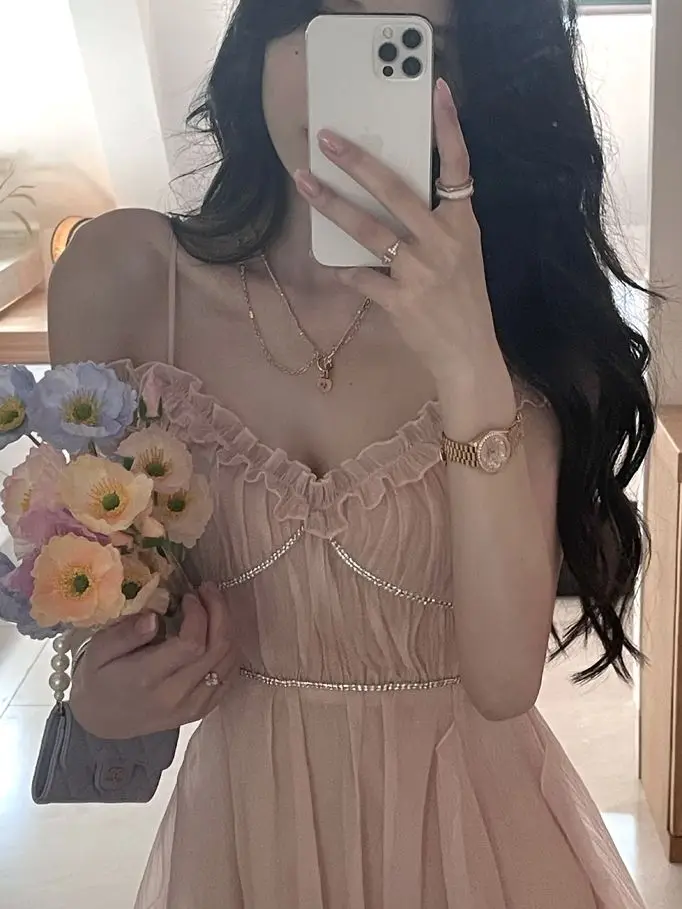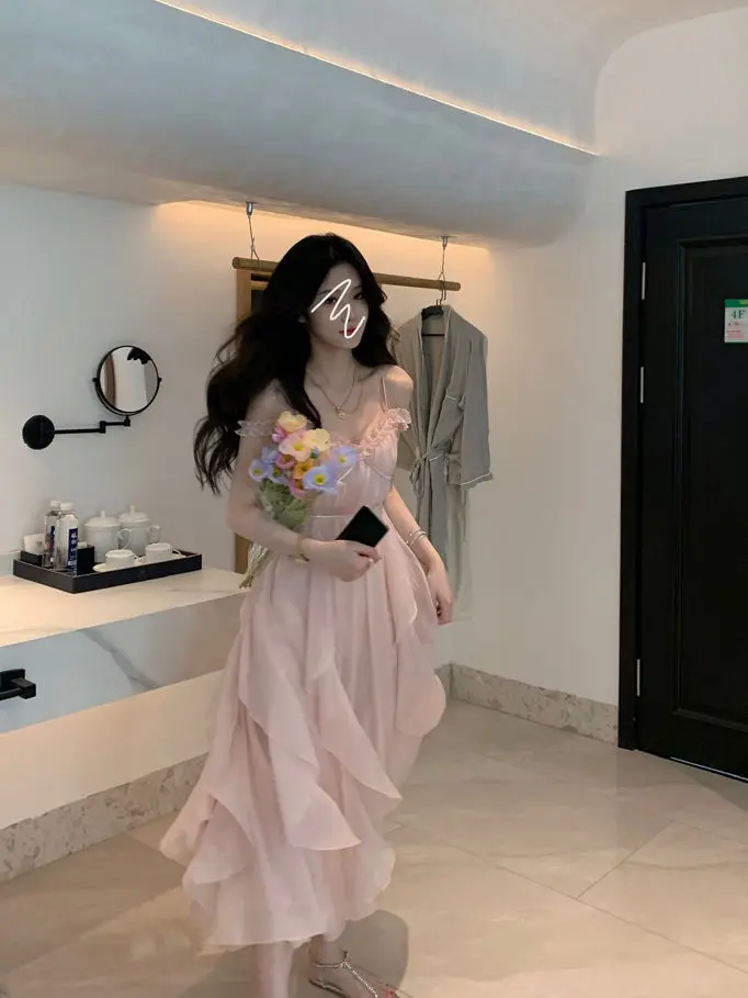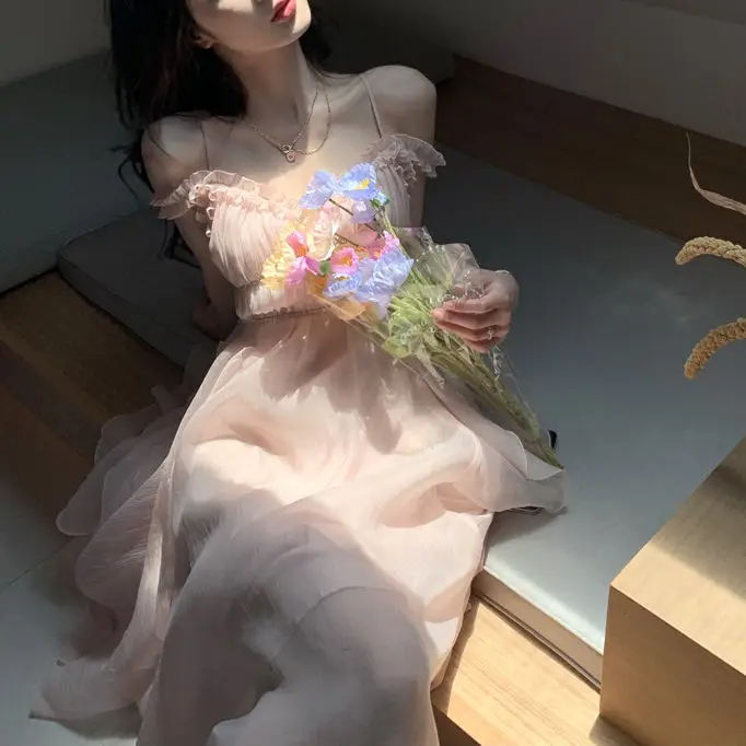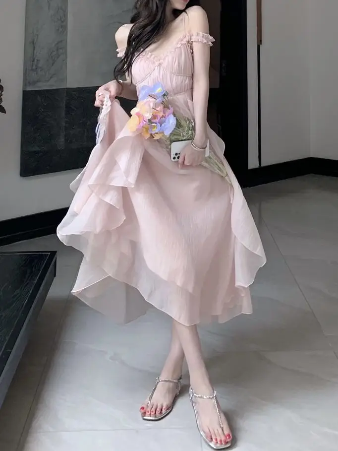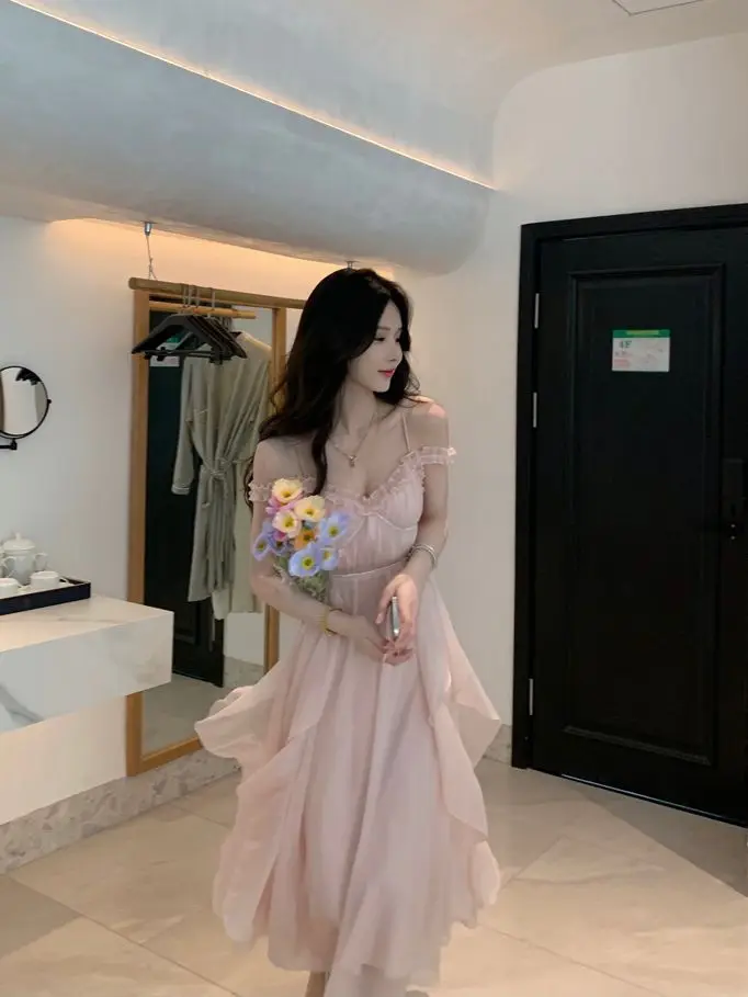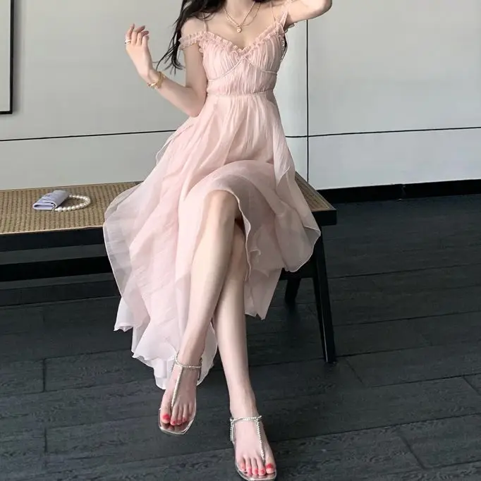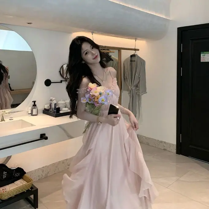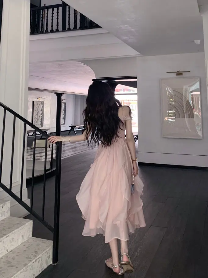 Fleepmart Design Sense Niche Lace Dress for Women Summer New Affordable Luxury Style Pink Fairy Long Slimming Suspender Dress