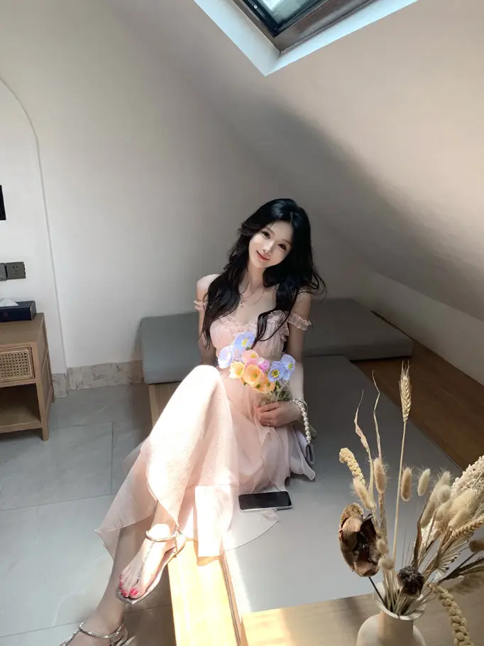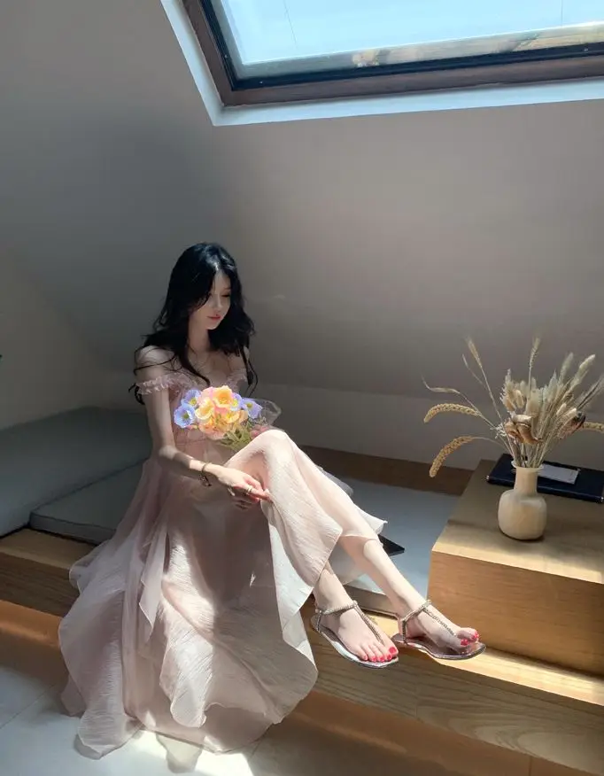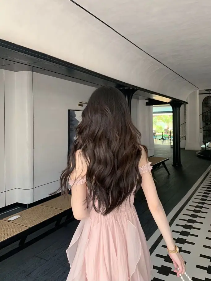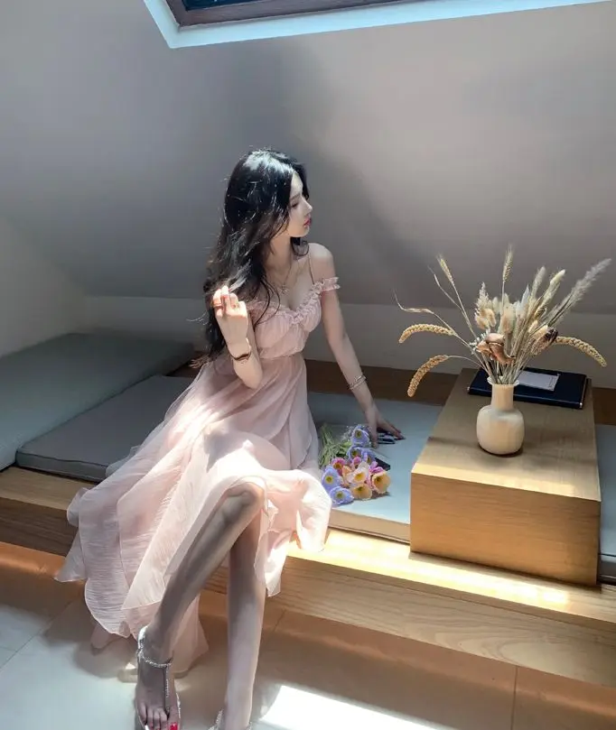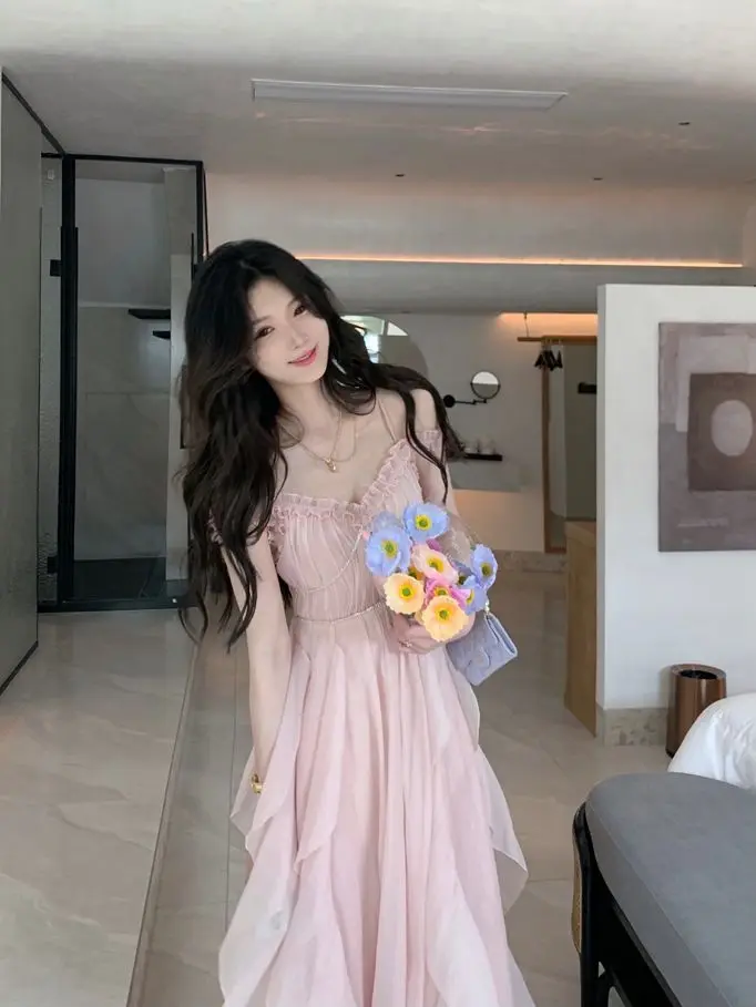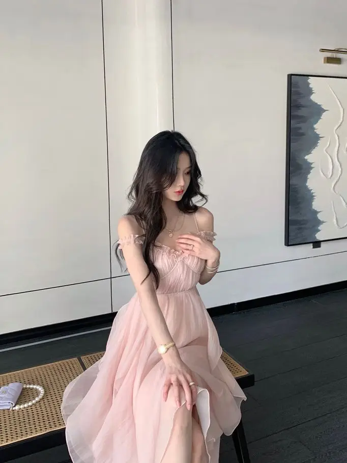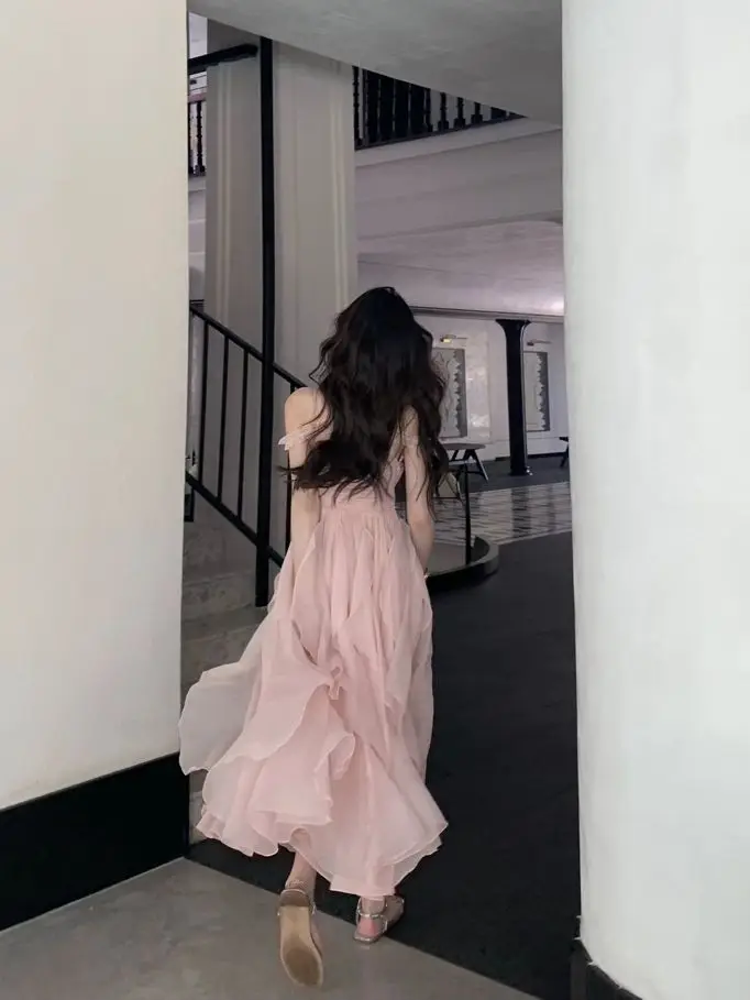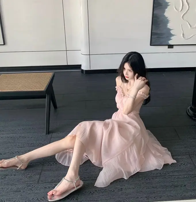 Fleepmart Design Sense Niche Lace Dress for Women Summer New Affordable Luxury Style Pink Fairy Long Slimming Suspender Dress