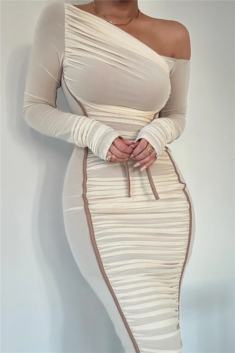 Fleepmart Diagonal Collar Long Sleeve Midi Dress For Women Two Layer Mesh Backless Ruched Bodycon Club Party Sexy Long Dress
