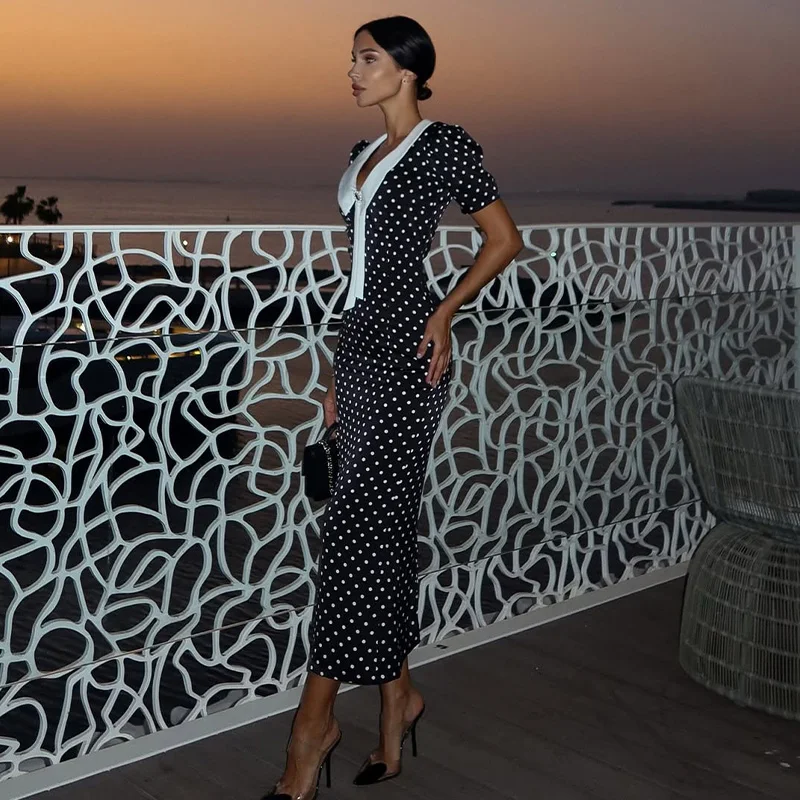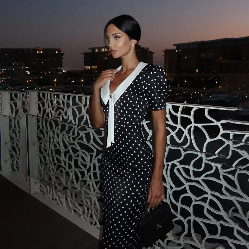 Fleepmart Dot Printed Dresses For Women Fashion Sexy Streetwear Short Sleeves Sheath Turn Down Collar V-Neck Long Vestidos Robes Female