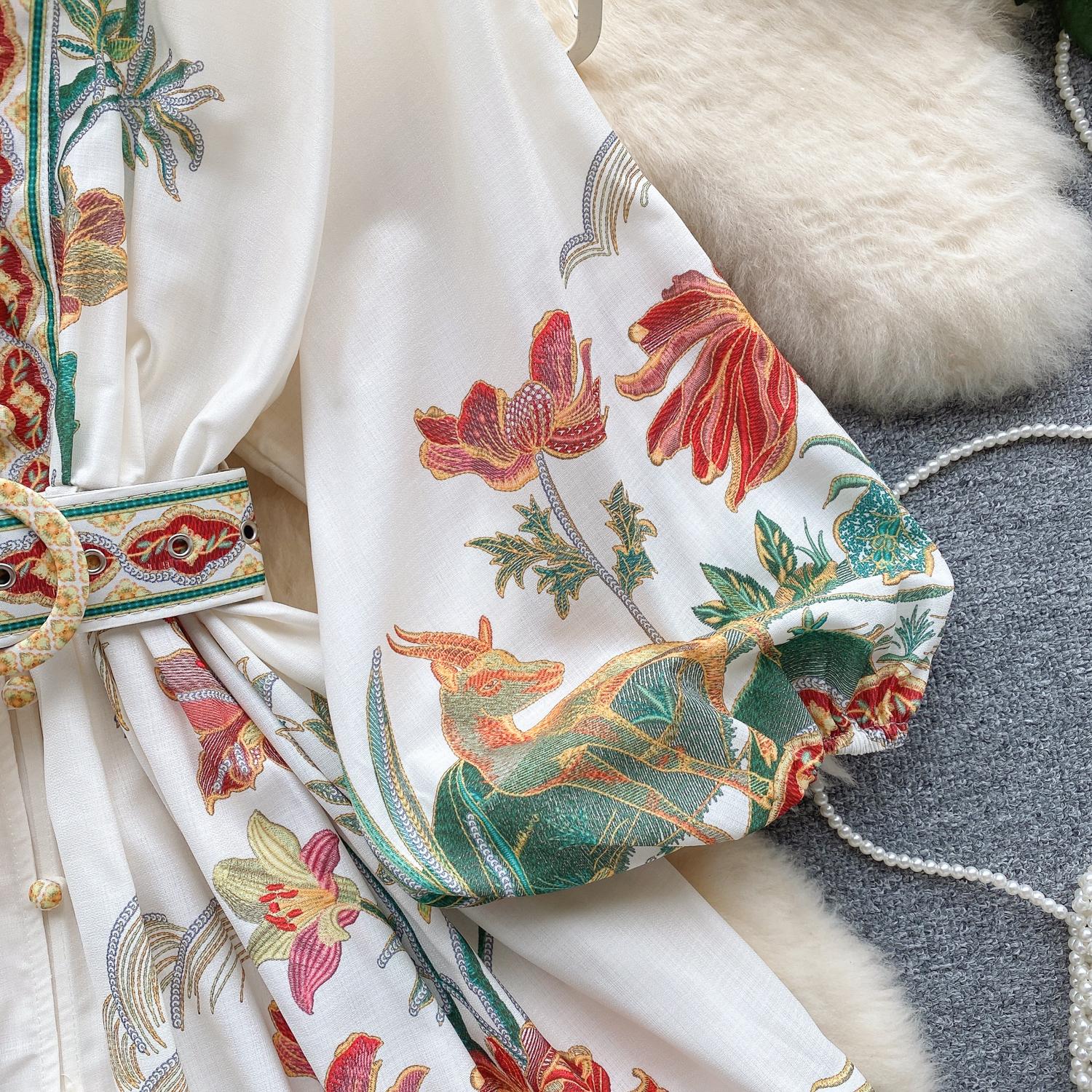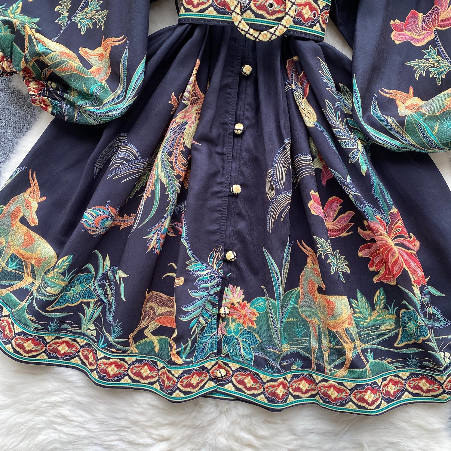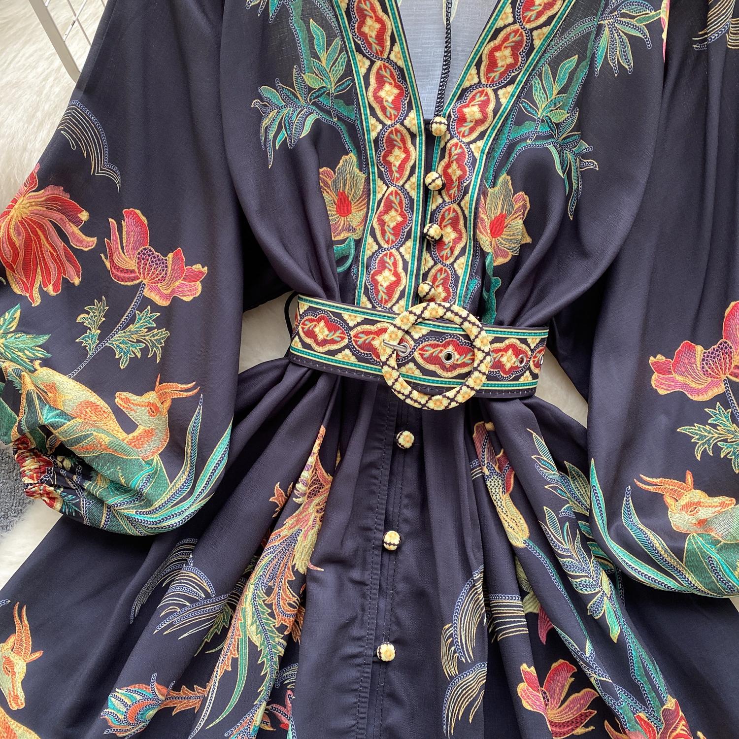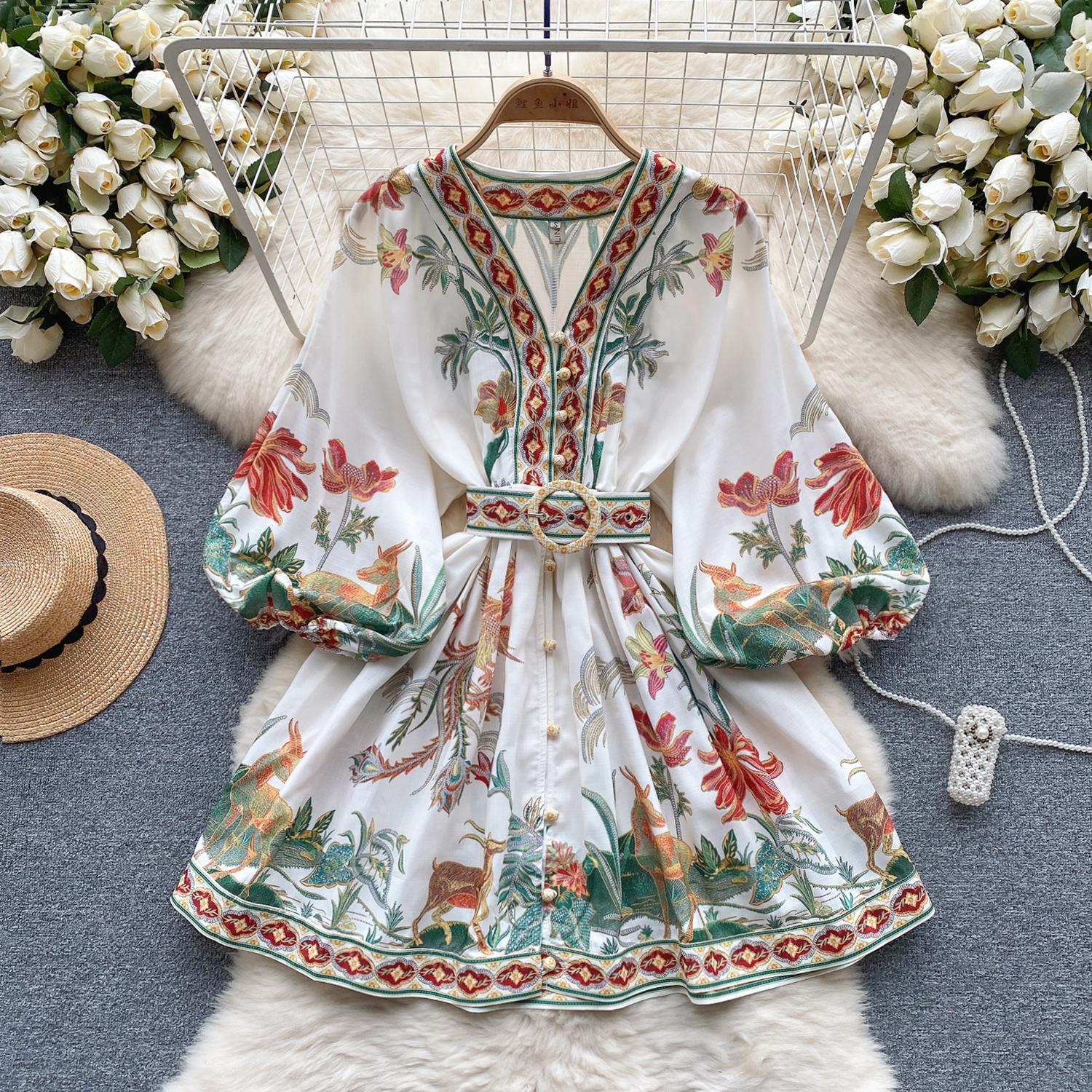Fleepmart Early Spring – Holiday Style V-Neck Pleated Lantern Sleeves Vintage Print Mini Dress