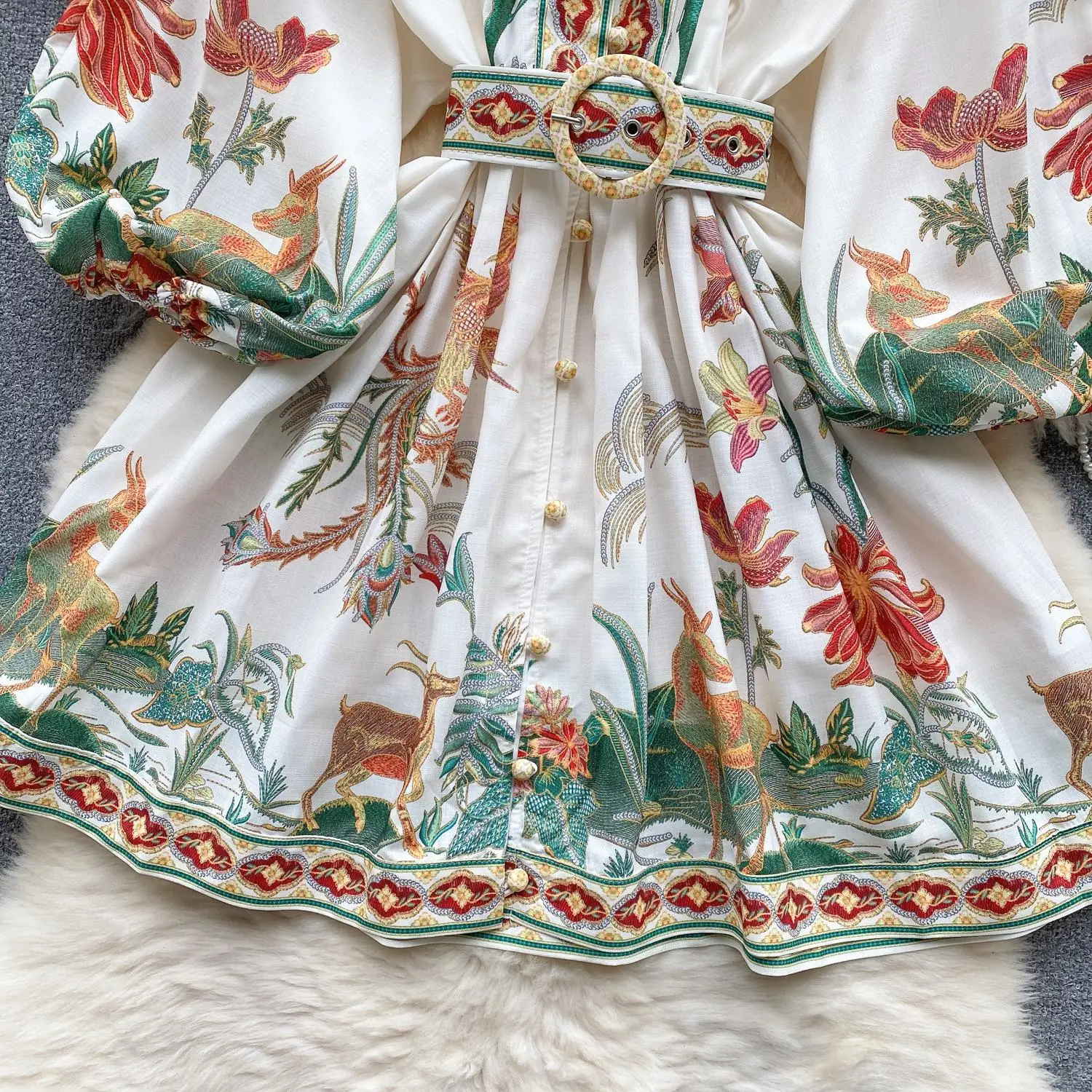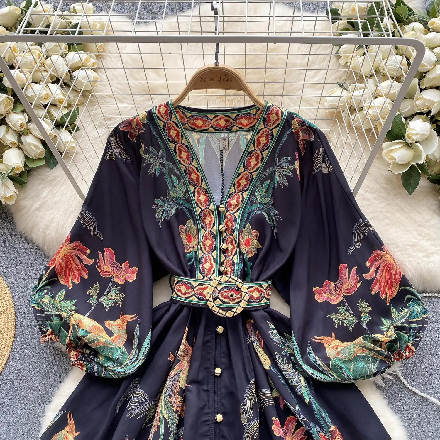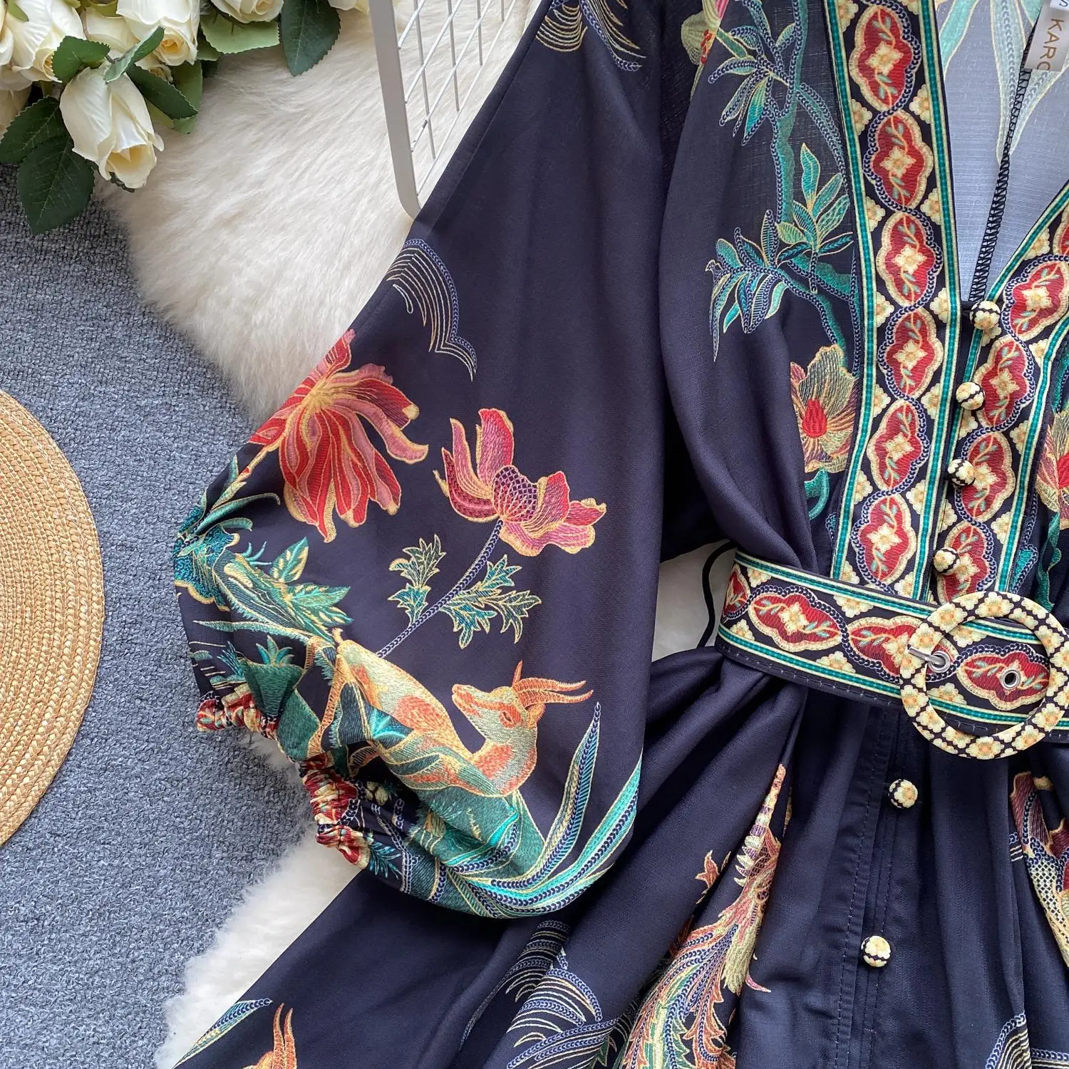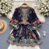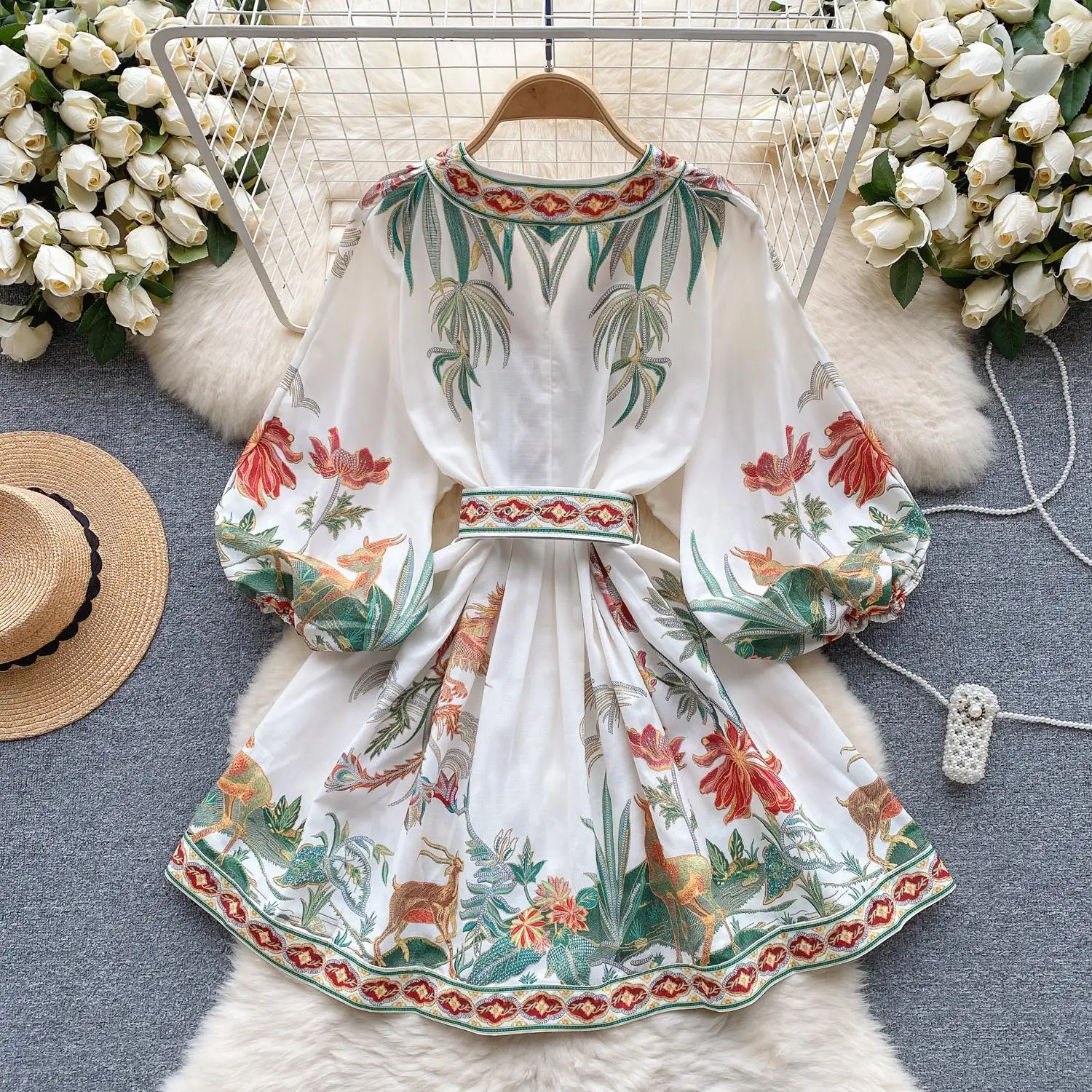 Fleepmart Early Spring – Holiday Style V-Neck Pleated Lantern Sleeves Vintage Print Mini Dress