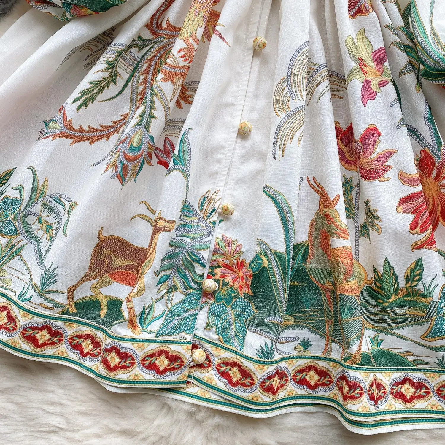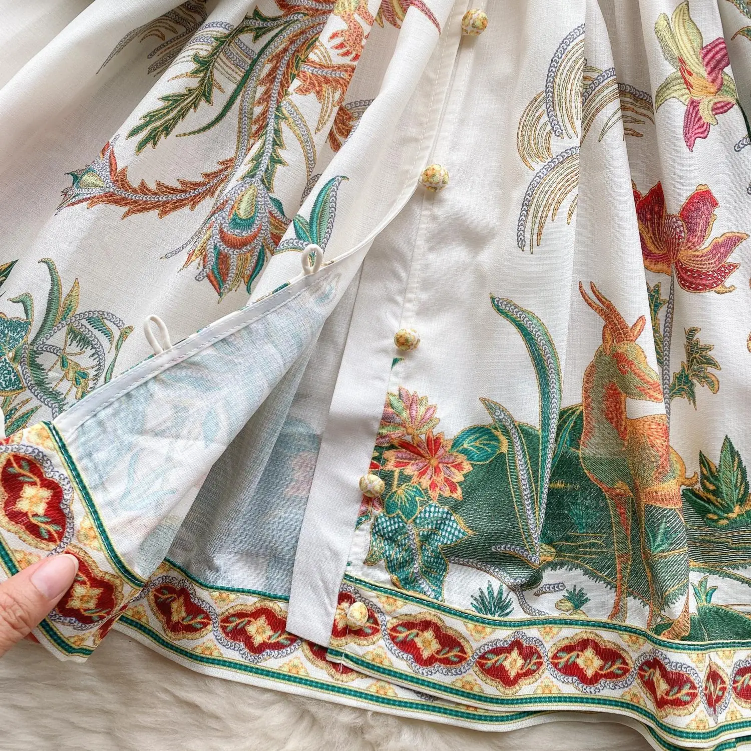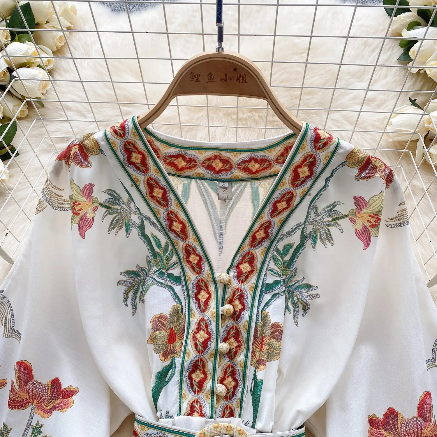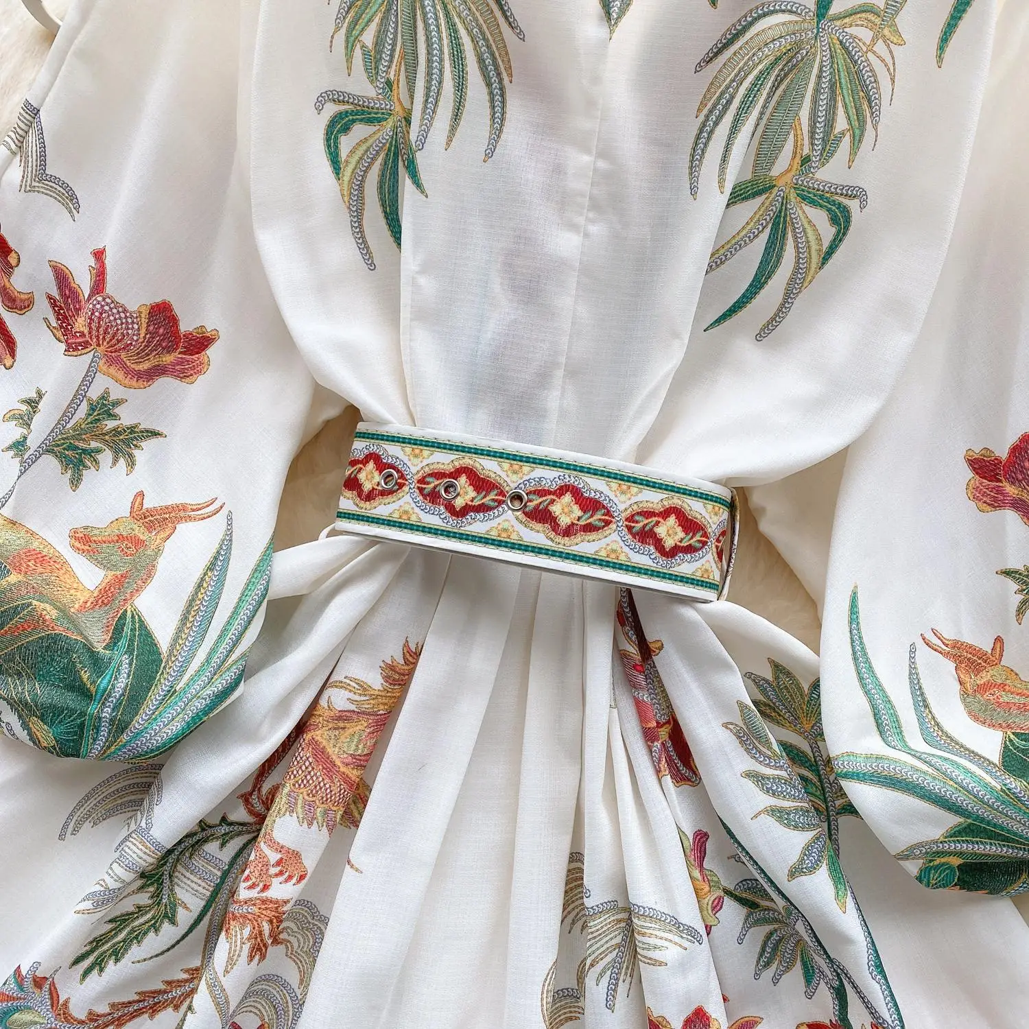 Fleepmart Early Spring – Holiday Style V-Neck Pleated Lantern Sleeves Vintage Print Mini Dress