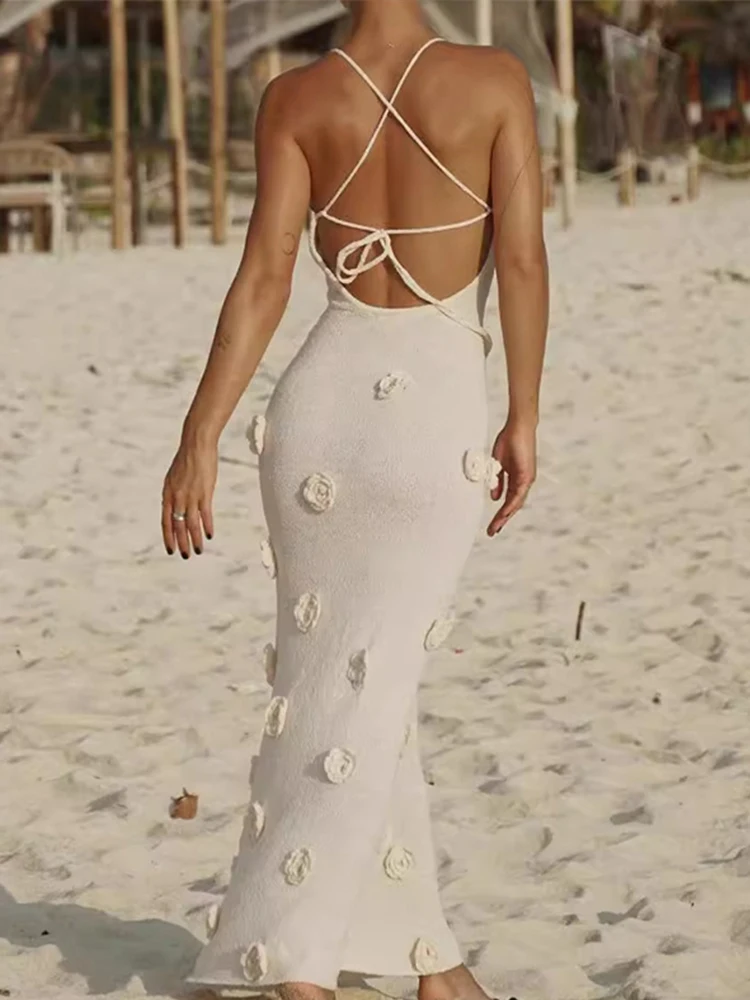 Fleepmart Elegant 3d Flower Sling Maxi Dress Women Deep V-neck Sleeveless Beach Dresses 2024 Summer New White Lady Chic High Street Robes