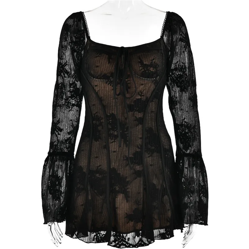 Fleepmart Elegant Backless Long Flare Sleeve Print Mini Dress Women Fashion square collar A-line Pleated Club Party Sexy Dress