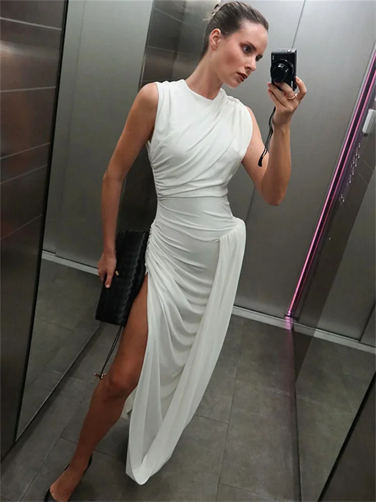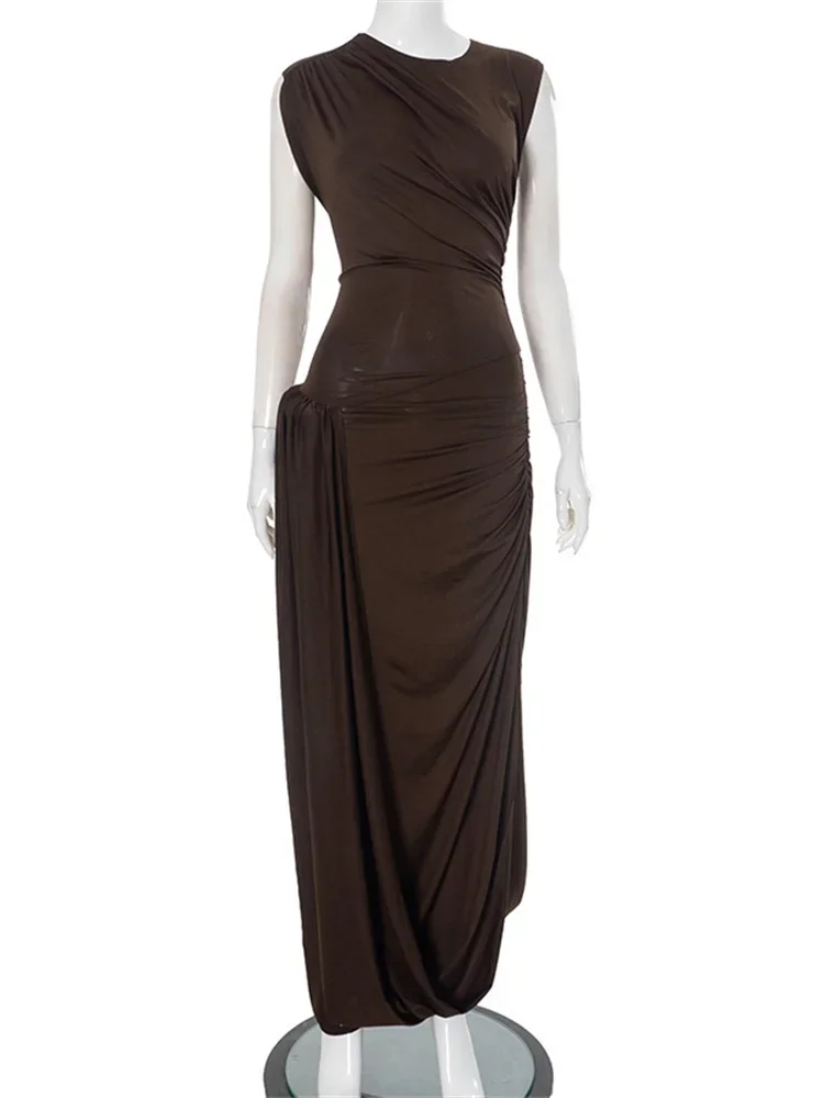 Fleepmart Elegant Backless Pleated Maxi Dress Female Sleeveless Slim See-Through Solid High Waist Party Dress Womens Summer Dress