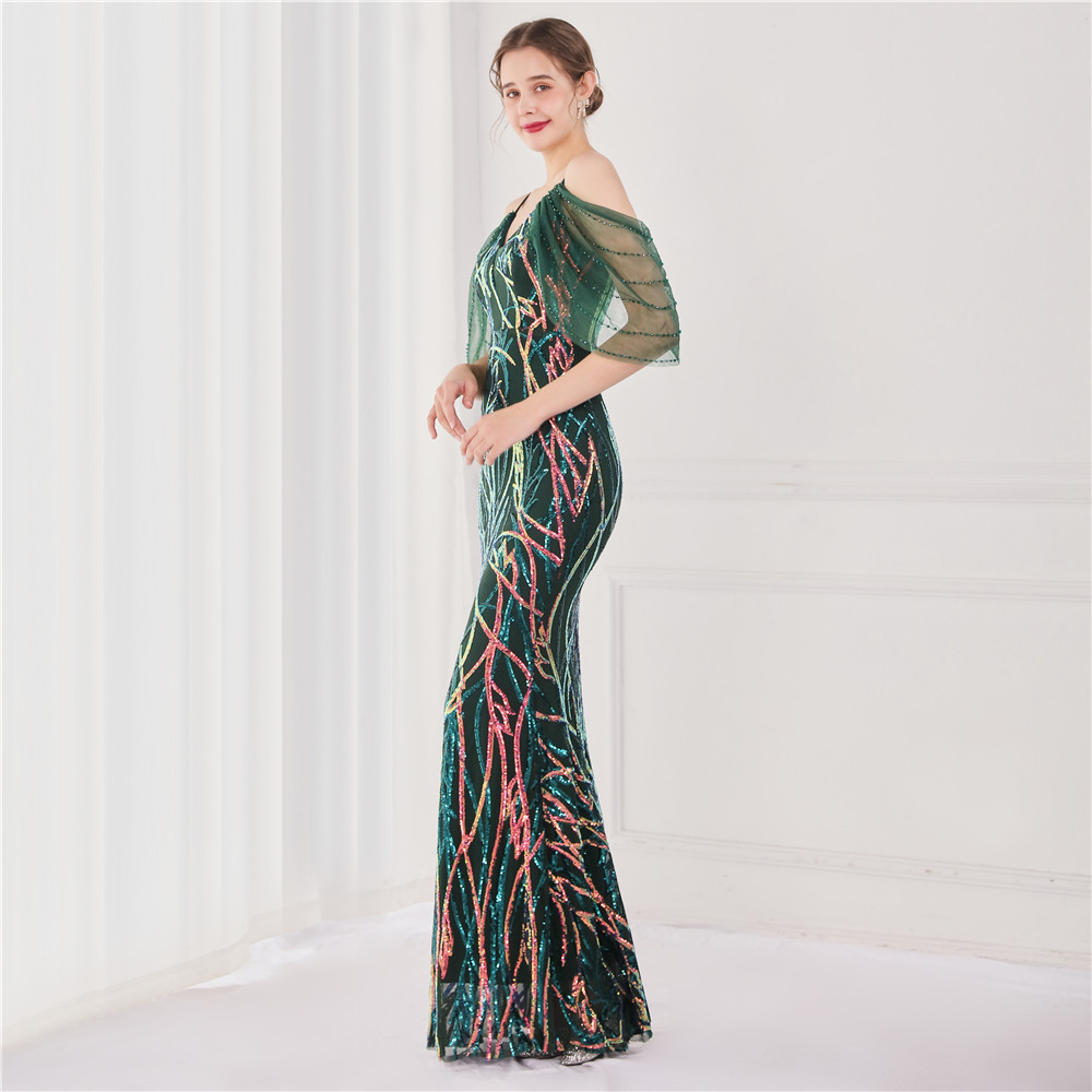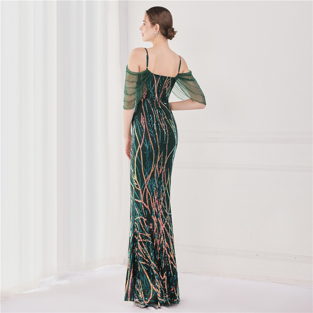 Fleepmart Elegant Beading Evening Dress Women Green Sequin Dress Party Strap Maxi Dress Long Prom Dress