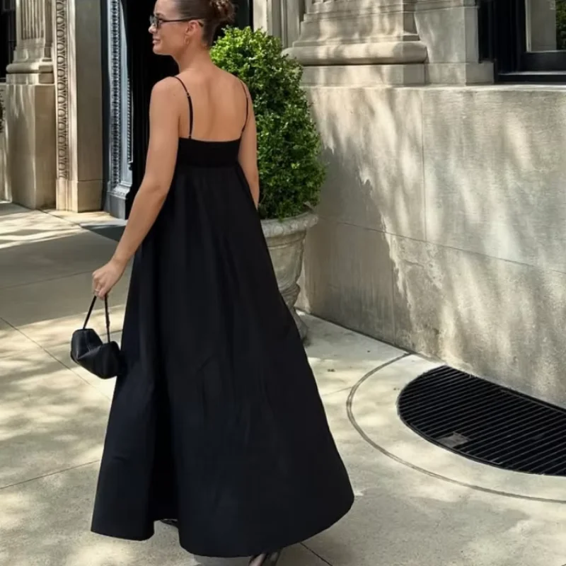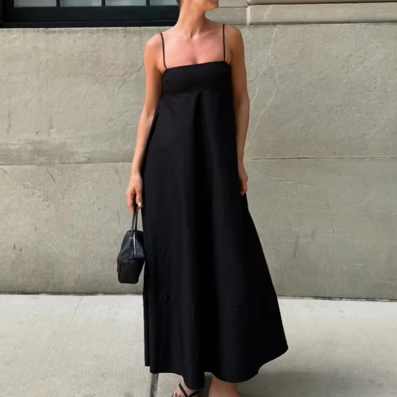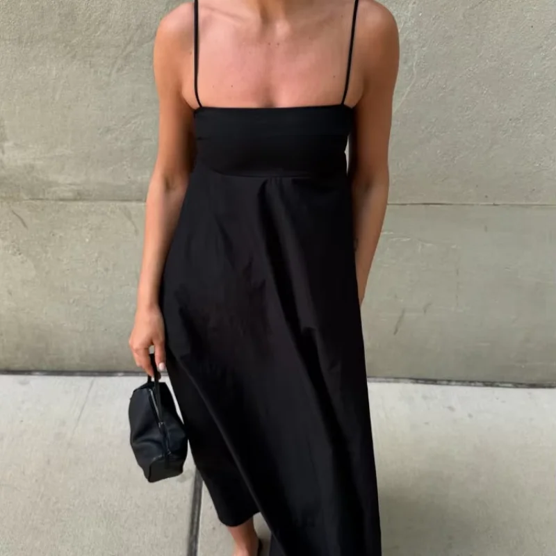 Fleepmart Elegant Black Backless Sling Long Dress Women Sexy Square Neck Sleeveless High Waisted Sling Robe 2025 Chic Lady High Streetwear