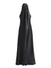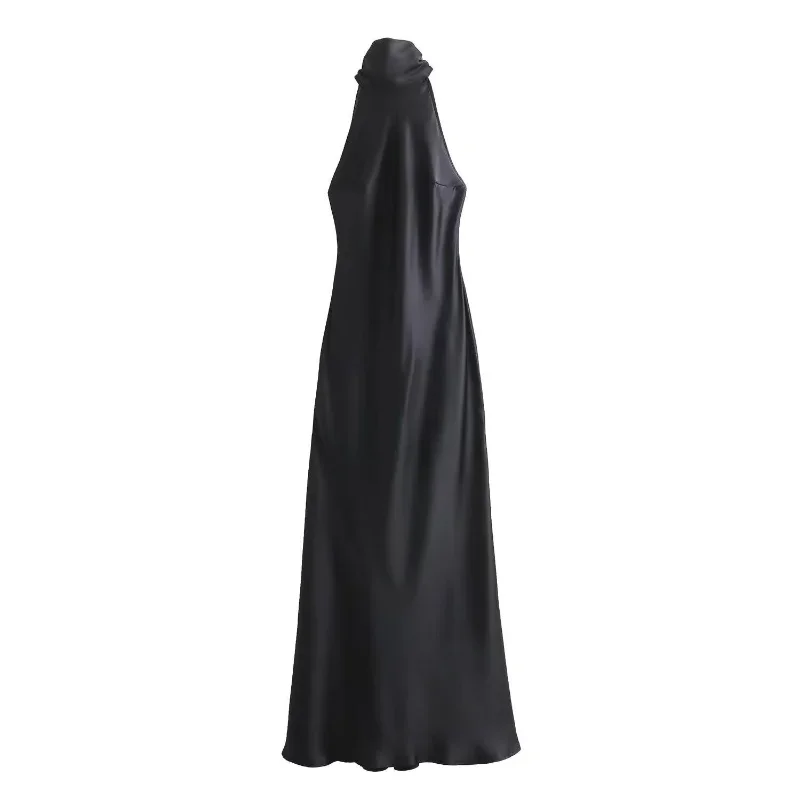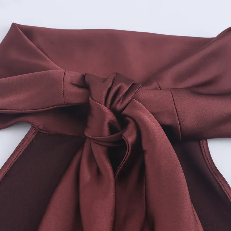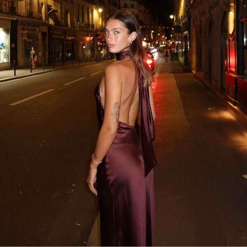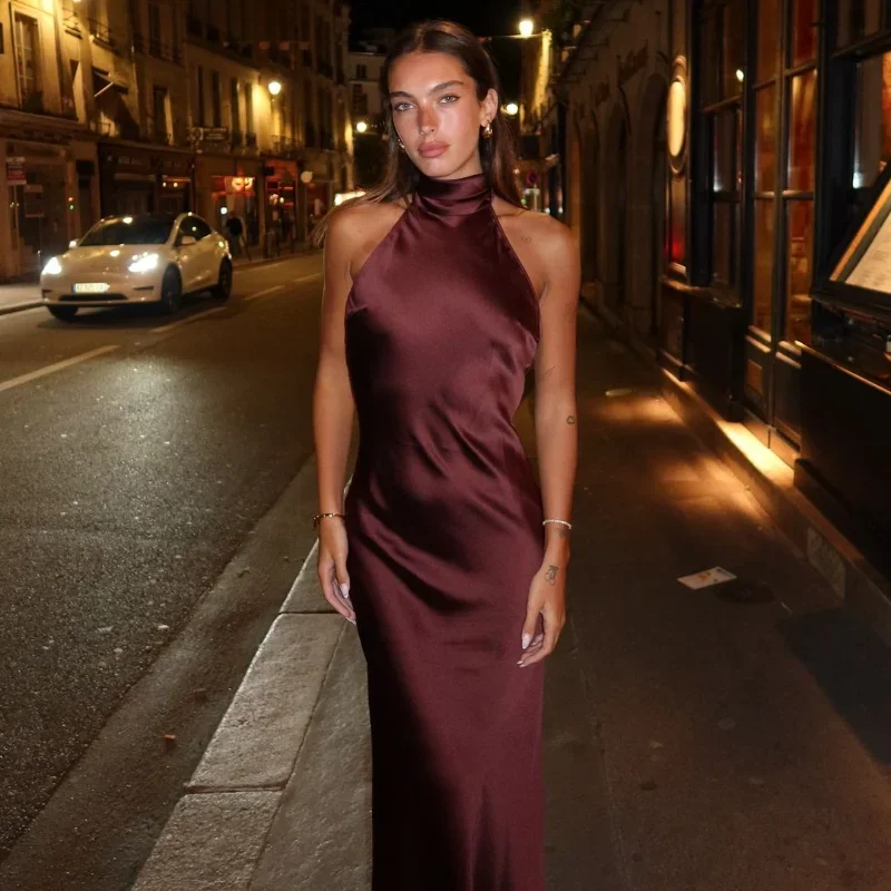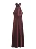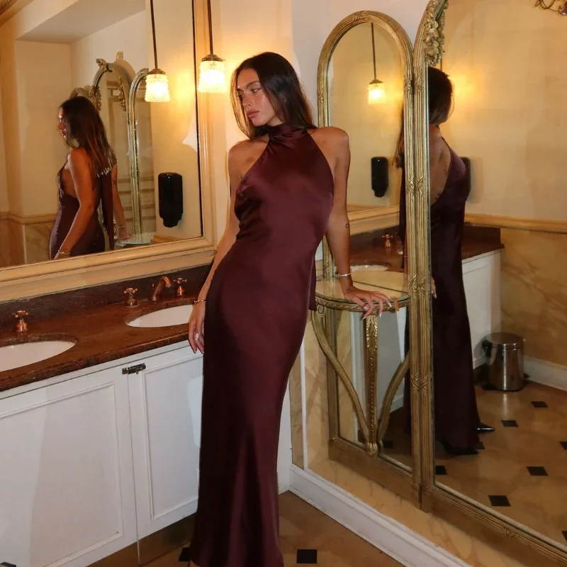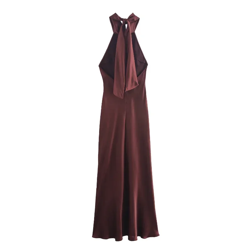 Fleepmart Elegant Brown Satin Halter Lace Up Long Dress Sexy Off Shoulder Backless Bodycon Autumn New Party Robe