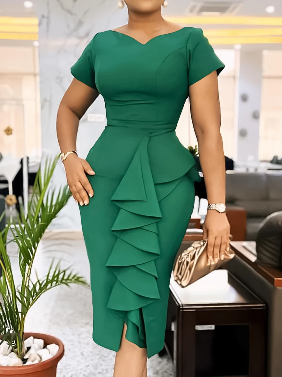 Fleepmart Elegant Church Dresses for Women Bodycon V Neck Ruffles Short Sleeves Slim Classy Office Ladies Work Wear Modest African Gowns