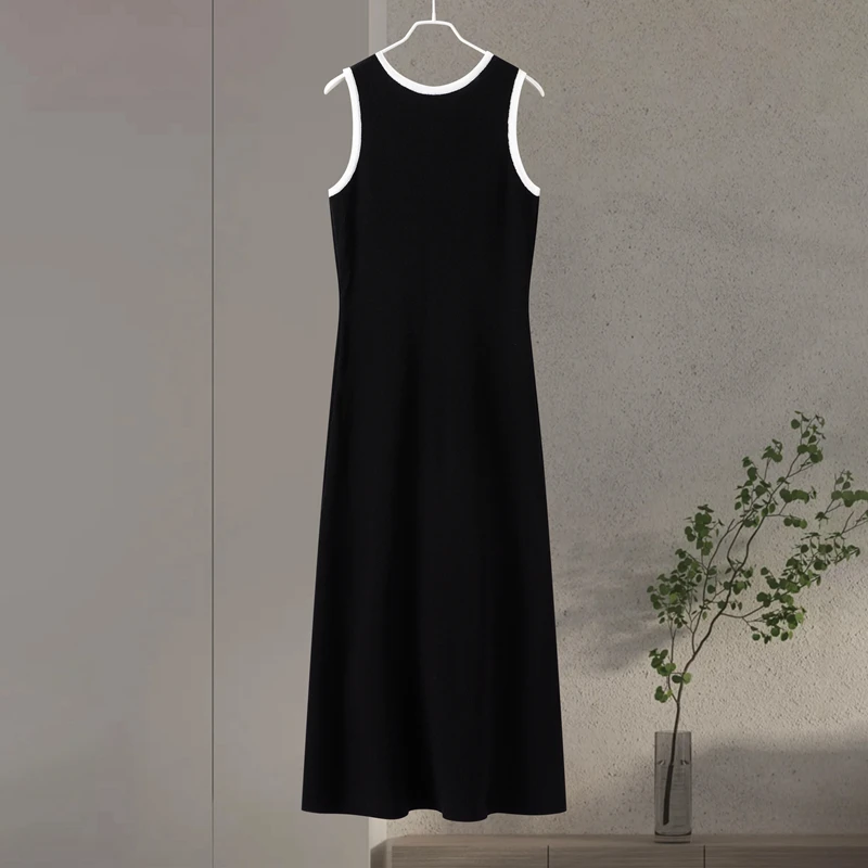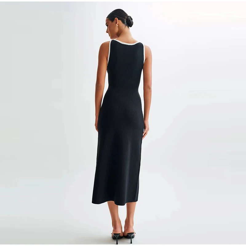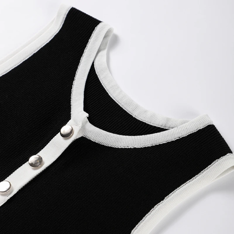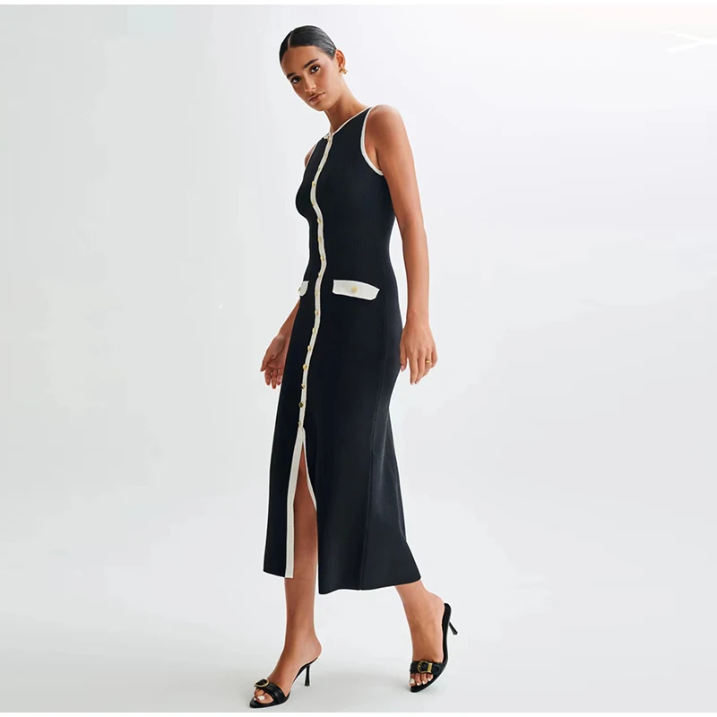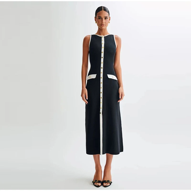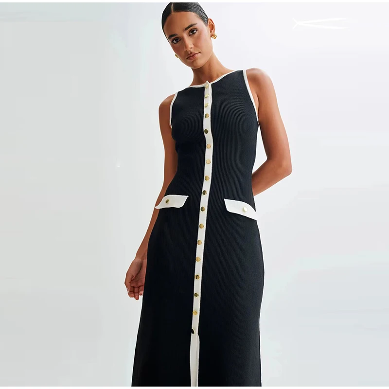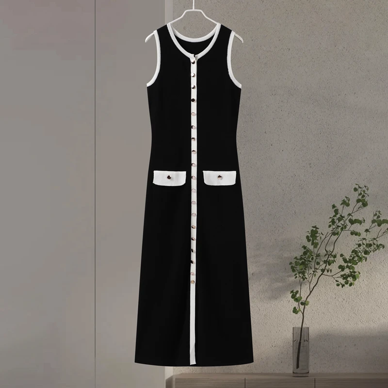 Fleepmart Elegant Contrast Knit Dress Women Slim Sleeveless Round Neck Robe Female 2024 Autumn Single Breasted Soft Vent Dresses Lady
