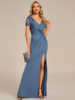 This Evening dress is the perfect choice for a special occasion. The dress features a deep V-neckline with a side split detail and beautiful appliques ruching along the waistline.