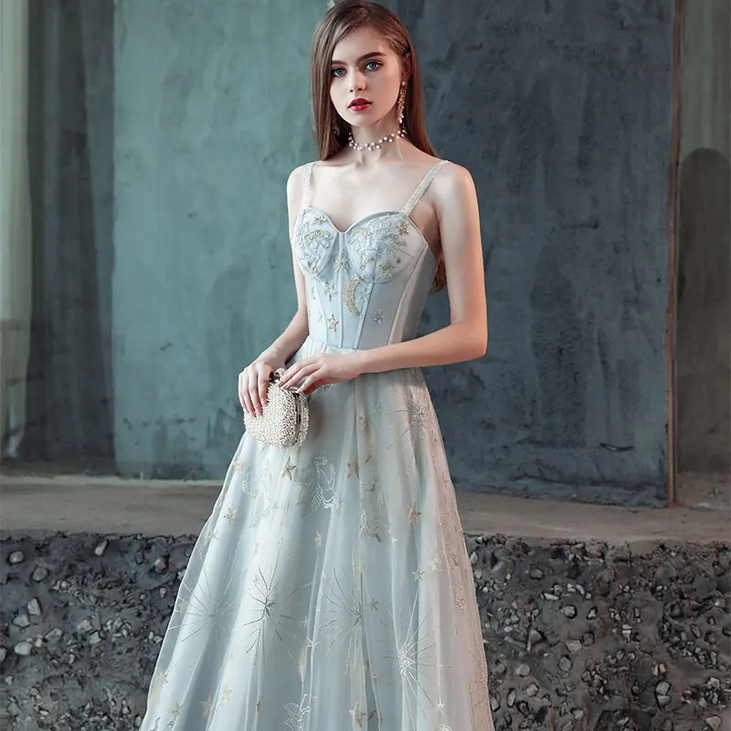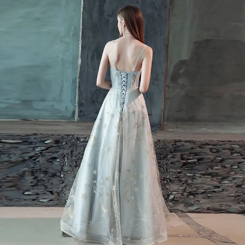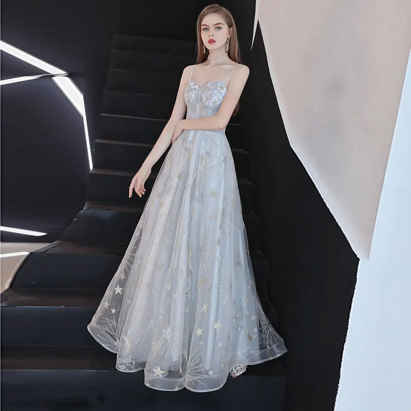 Fleepmart Elegant Evening Dress Gray Lace Long Formal Gown A Line Lace Applique Scoop Neck Sleeveless Robe De Soiree