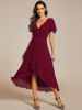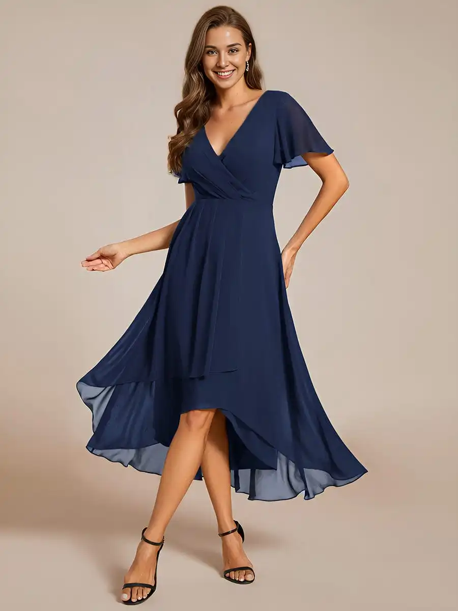 Fleepmart Elegant Evening Dresses Ruffles Sleeve Pleated V-Neck Midi 2024 A-Line Navy Blue Chiffon Wedding Guest Dress