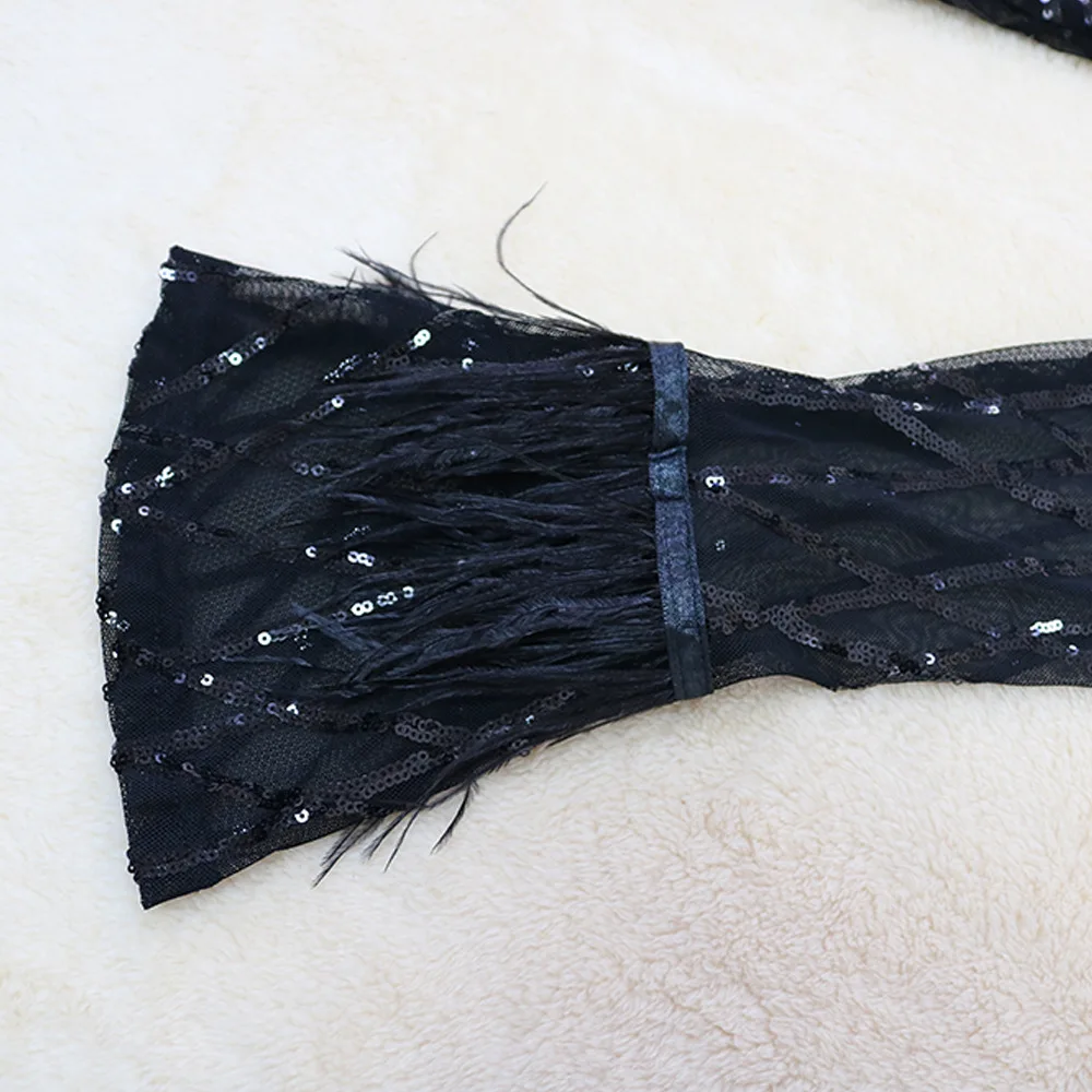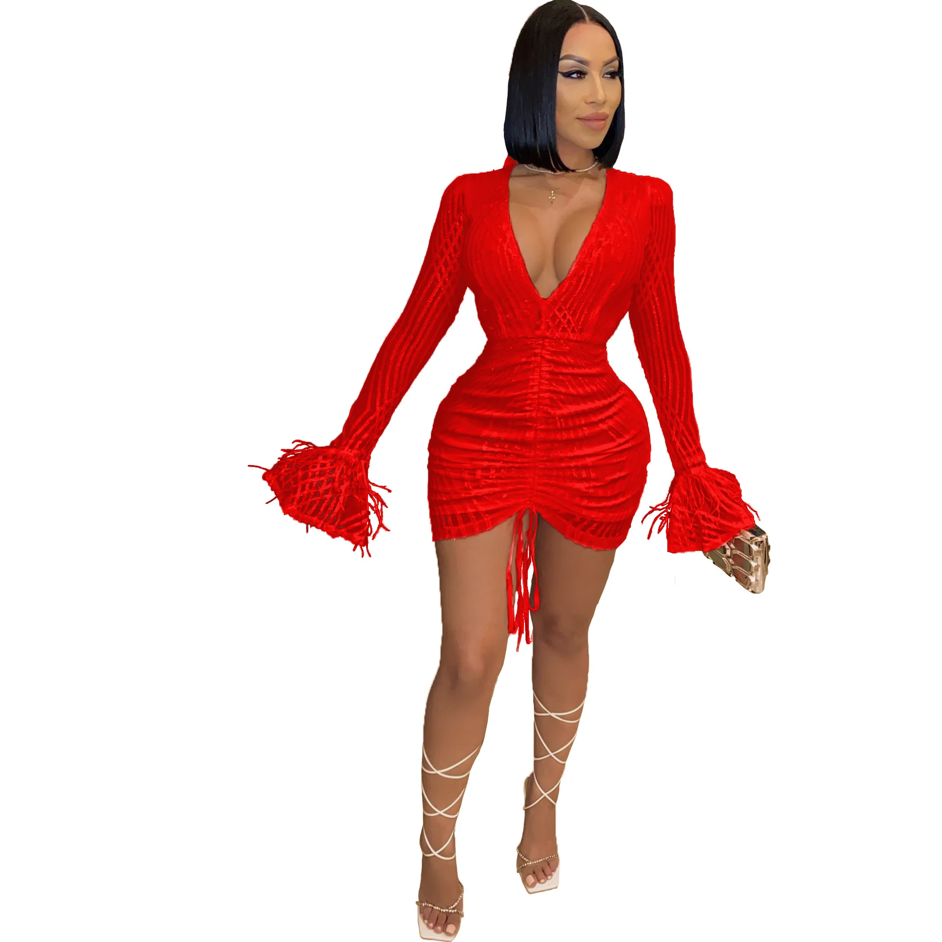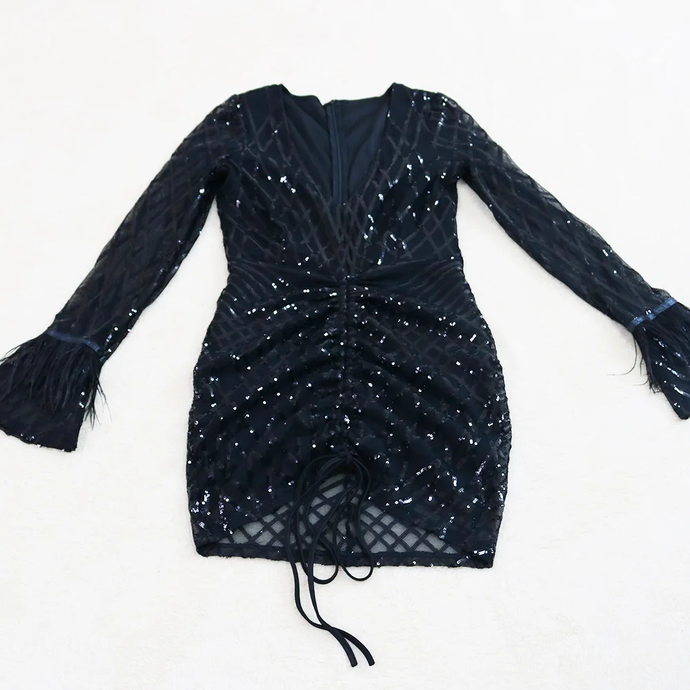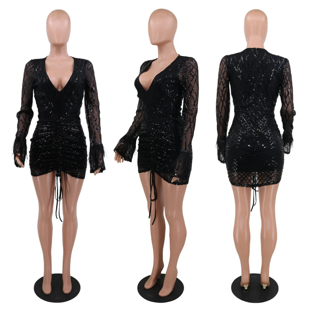 Fleepmart Elegant Feather Sequin Mini Women Dress Sexy Deep V Neck Flare Sleeve Ruched Lace Up Bandage Bodycon Club Party Dress Women Robe