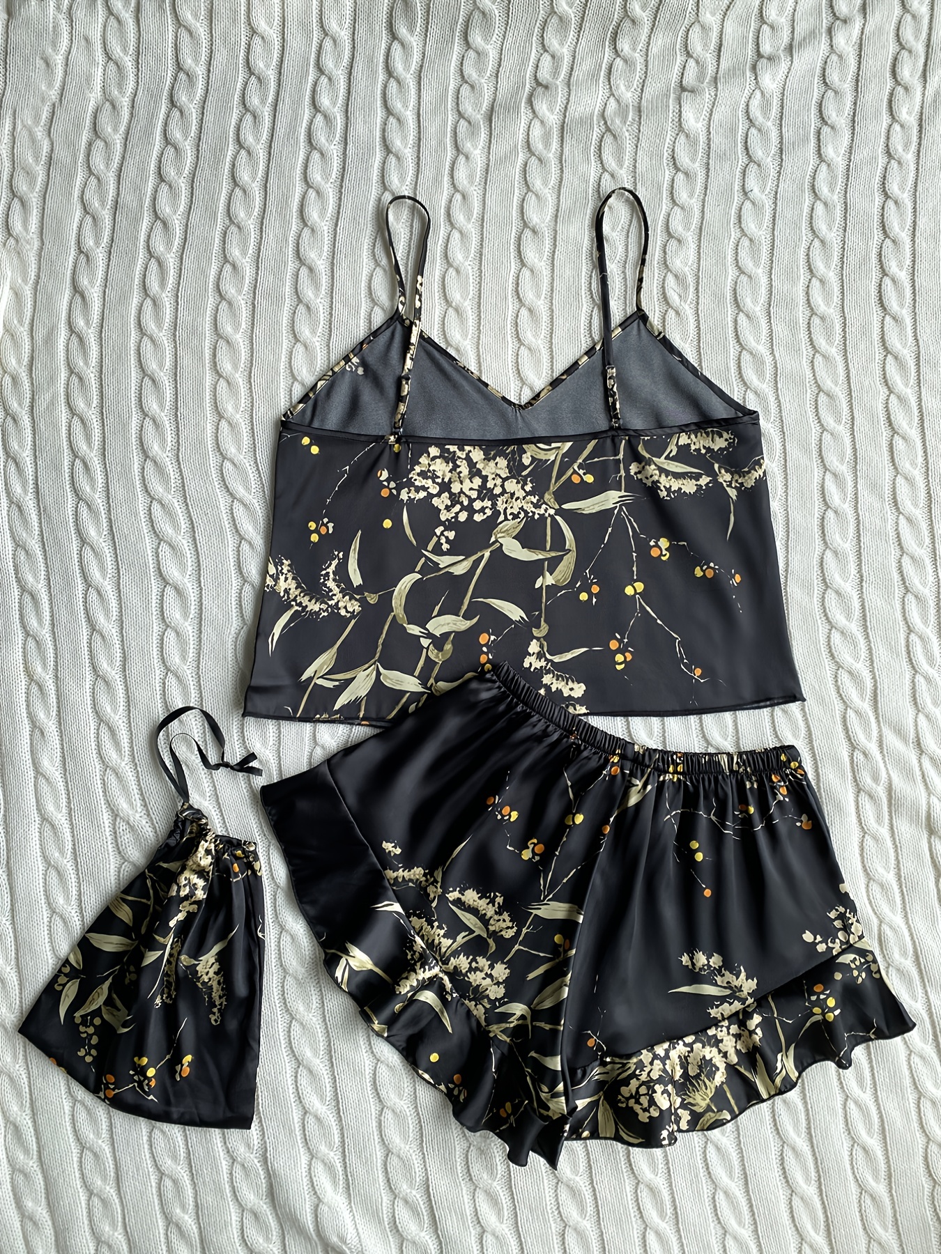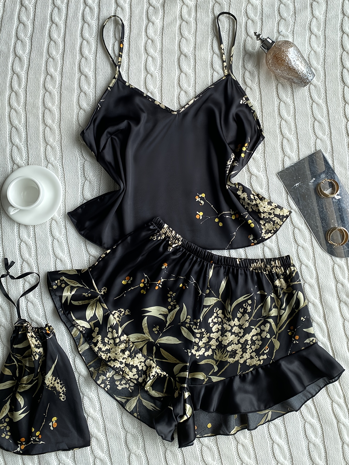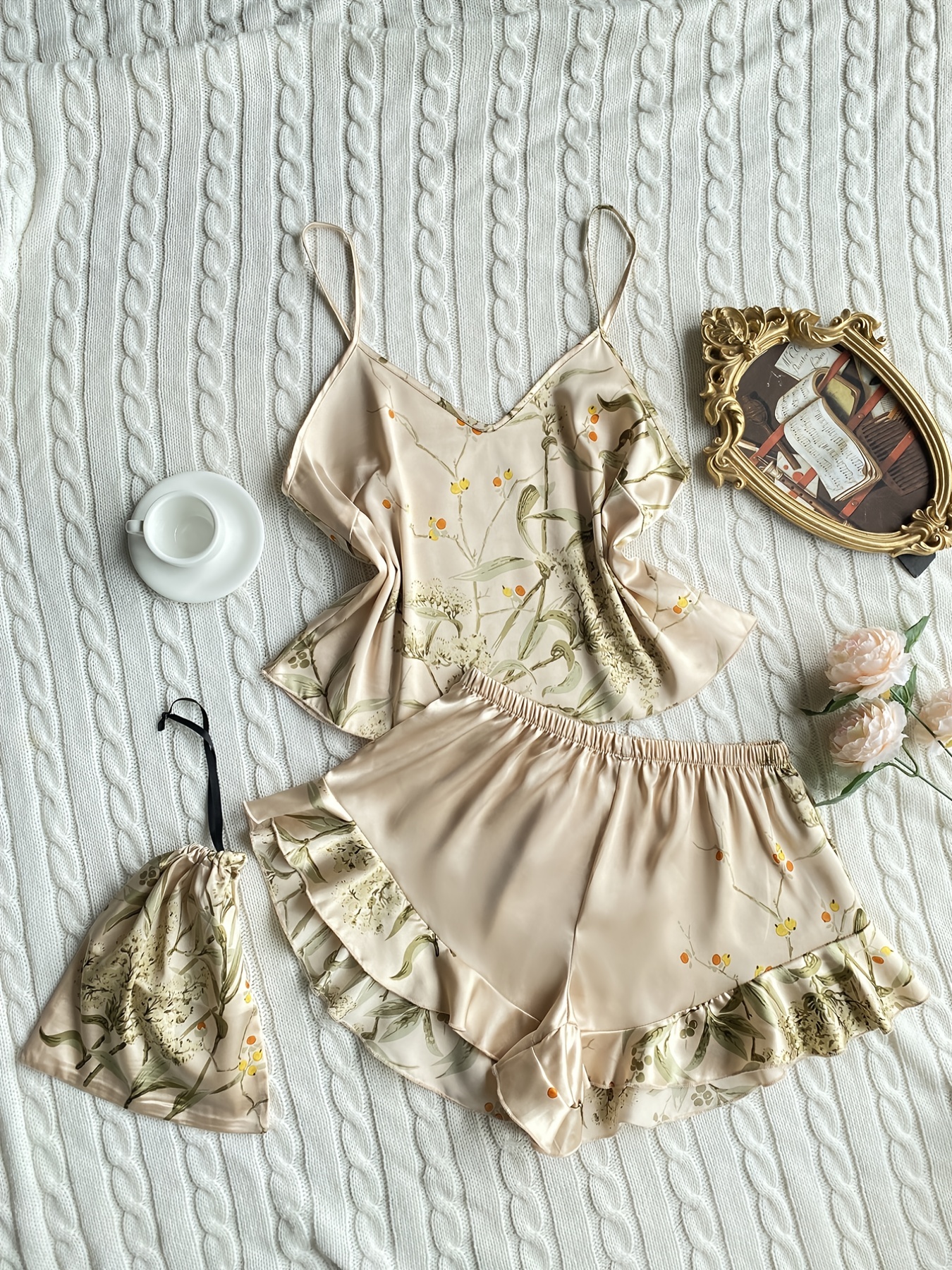 Fleepmart Elegant Floral Print Cami Tops Ruffle Hem Shorts Pajama Set Women’s Sleepwear Loungewear