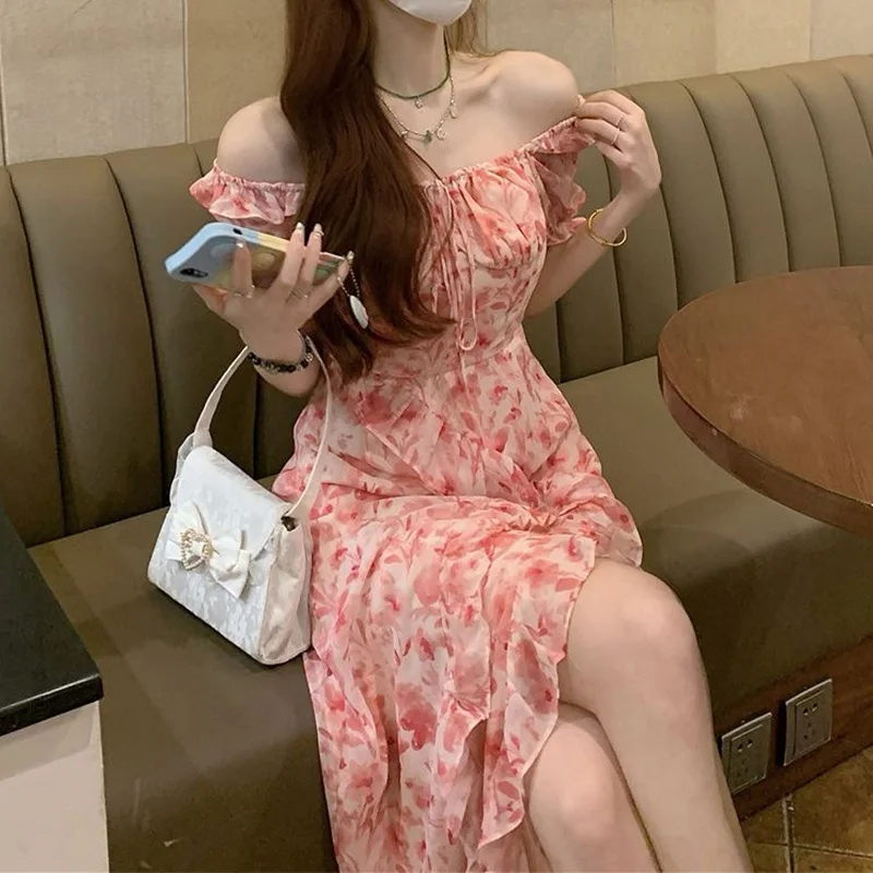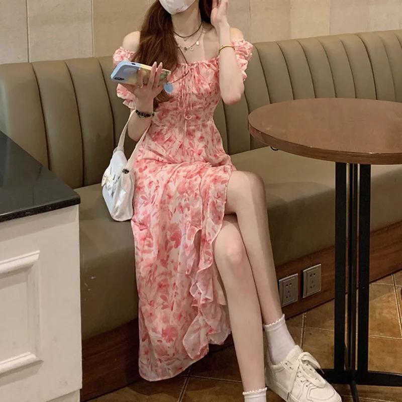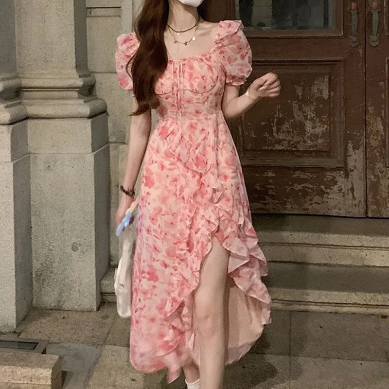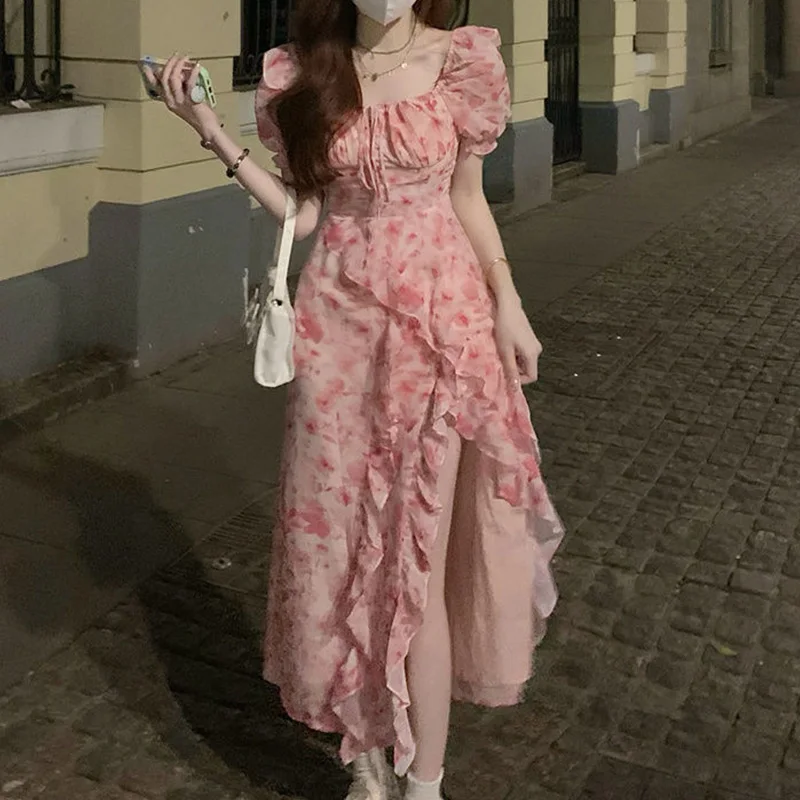 Fleepmart Elegant Floral Printed Long Dress Women Summer Fashion Chiffon Short Sleeve Skirts Sexy Square Neck Side Split Ruffle Dresses