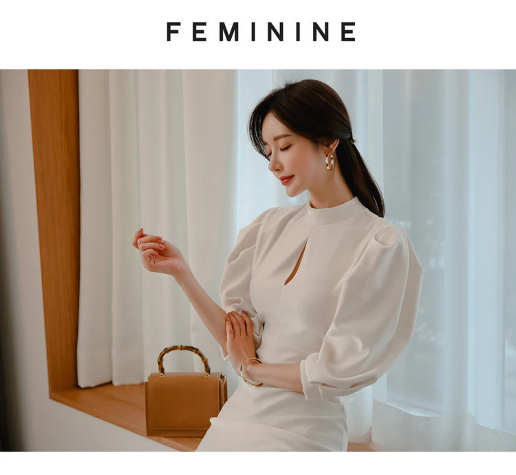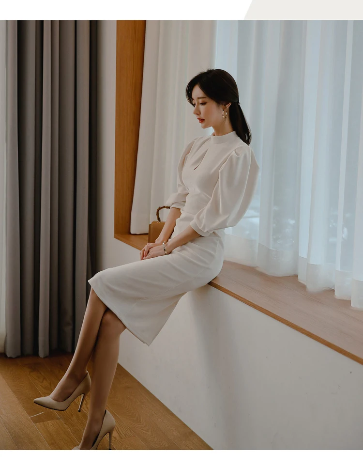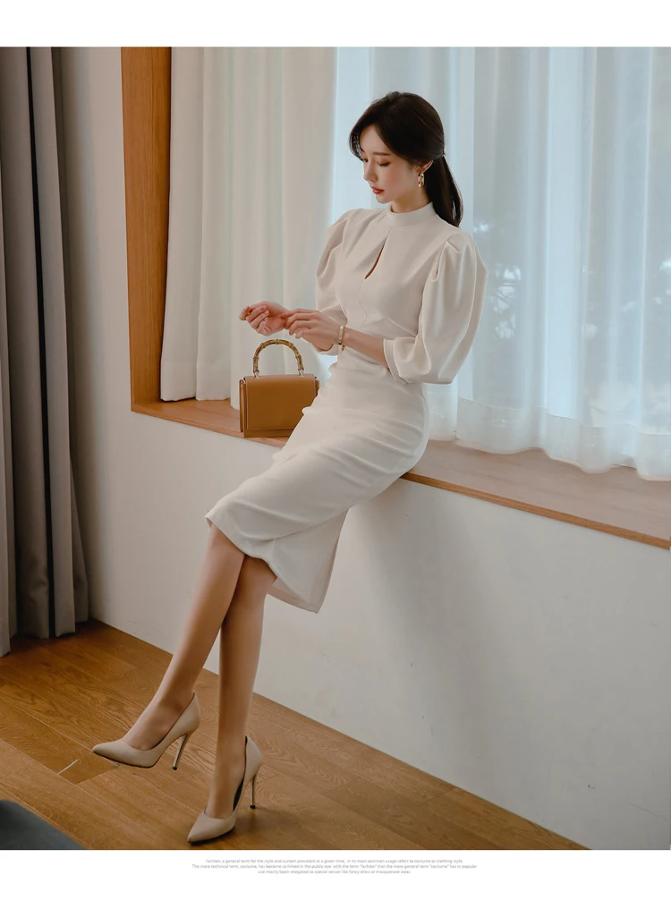 Fleepmart Elegant Formal Dress Simple Style White Puff Sleeve Pencil Dress 2023 Spring Summer Slim Bodycon Office Lady Dress