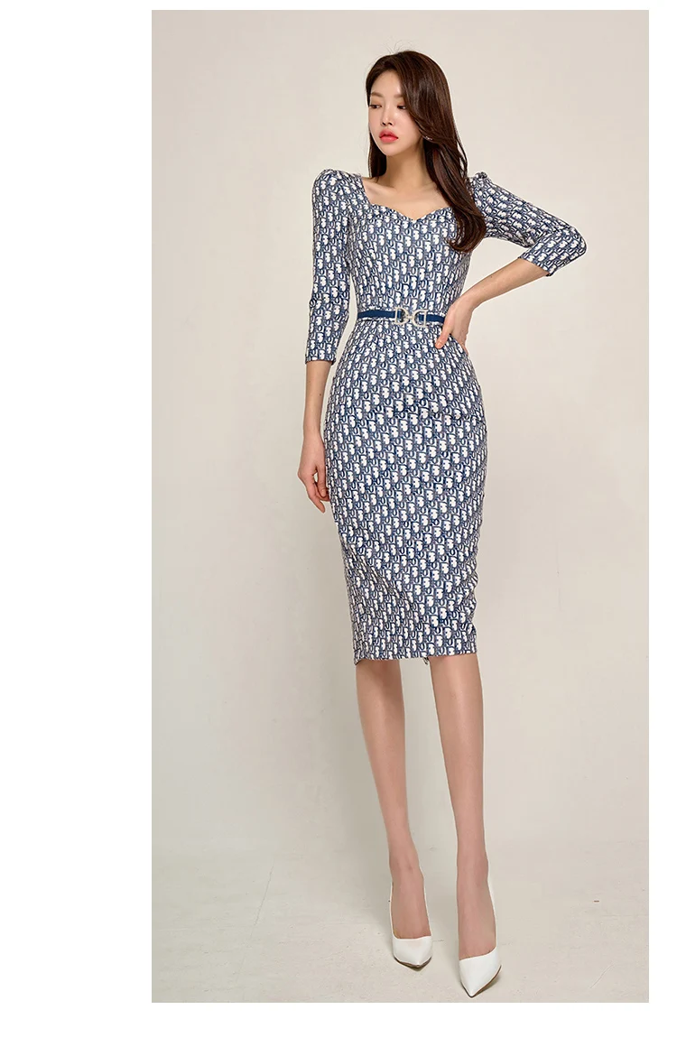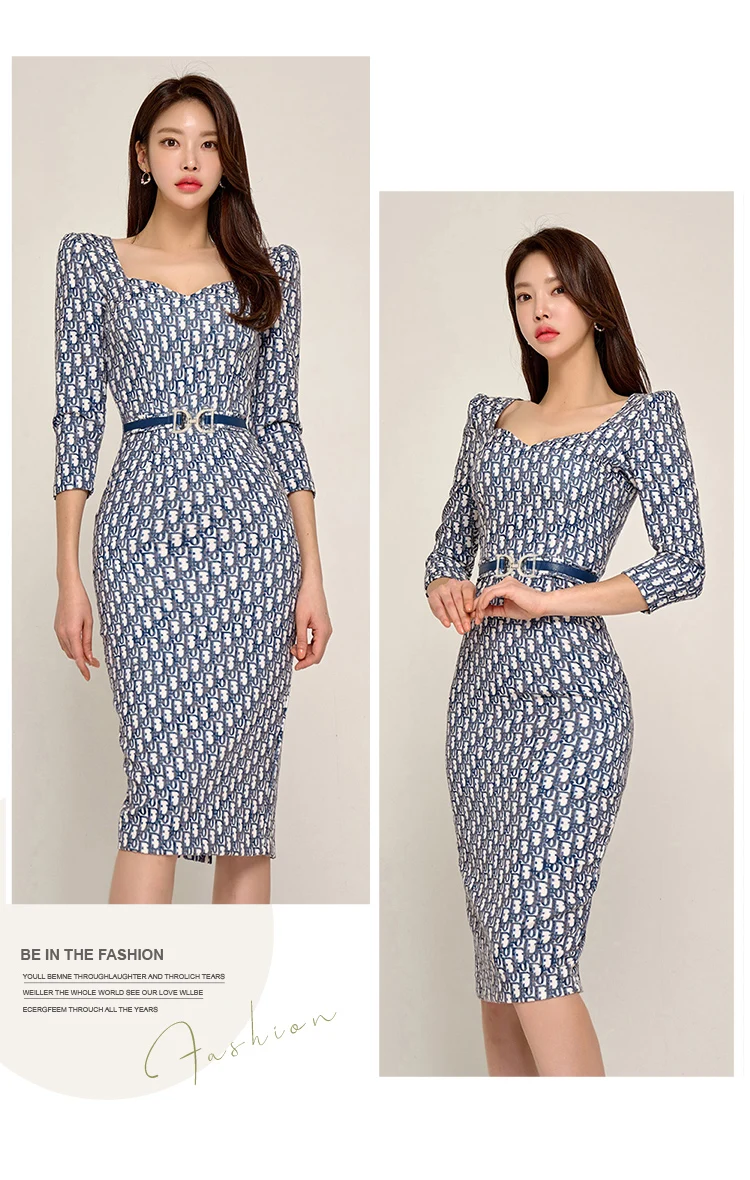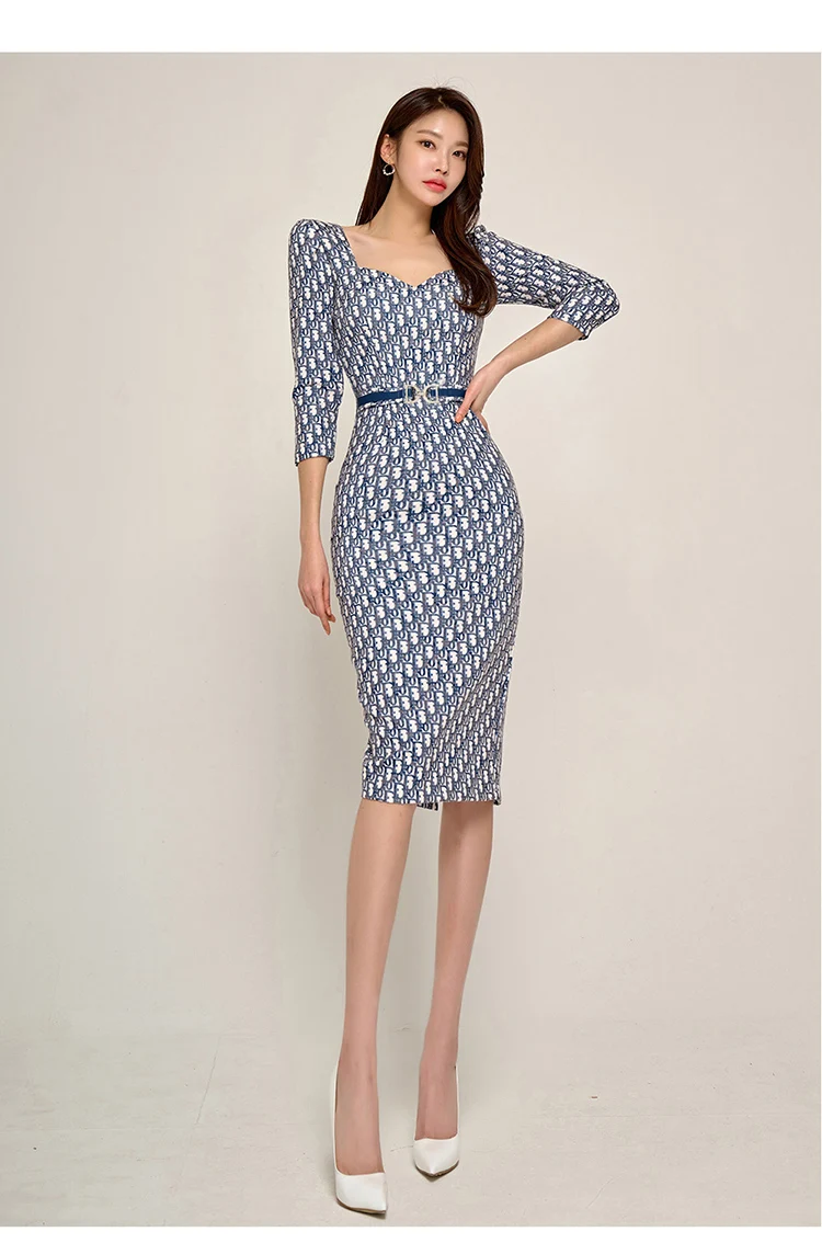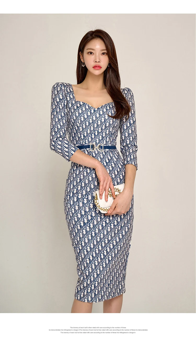 Fleepmart Elegant Formal Dress Vintag Print Square Collar Belt Pencil Dress 2023 Fashion Spring Autumn Slim Bodycon Office Lady Dress