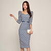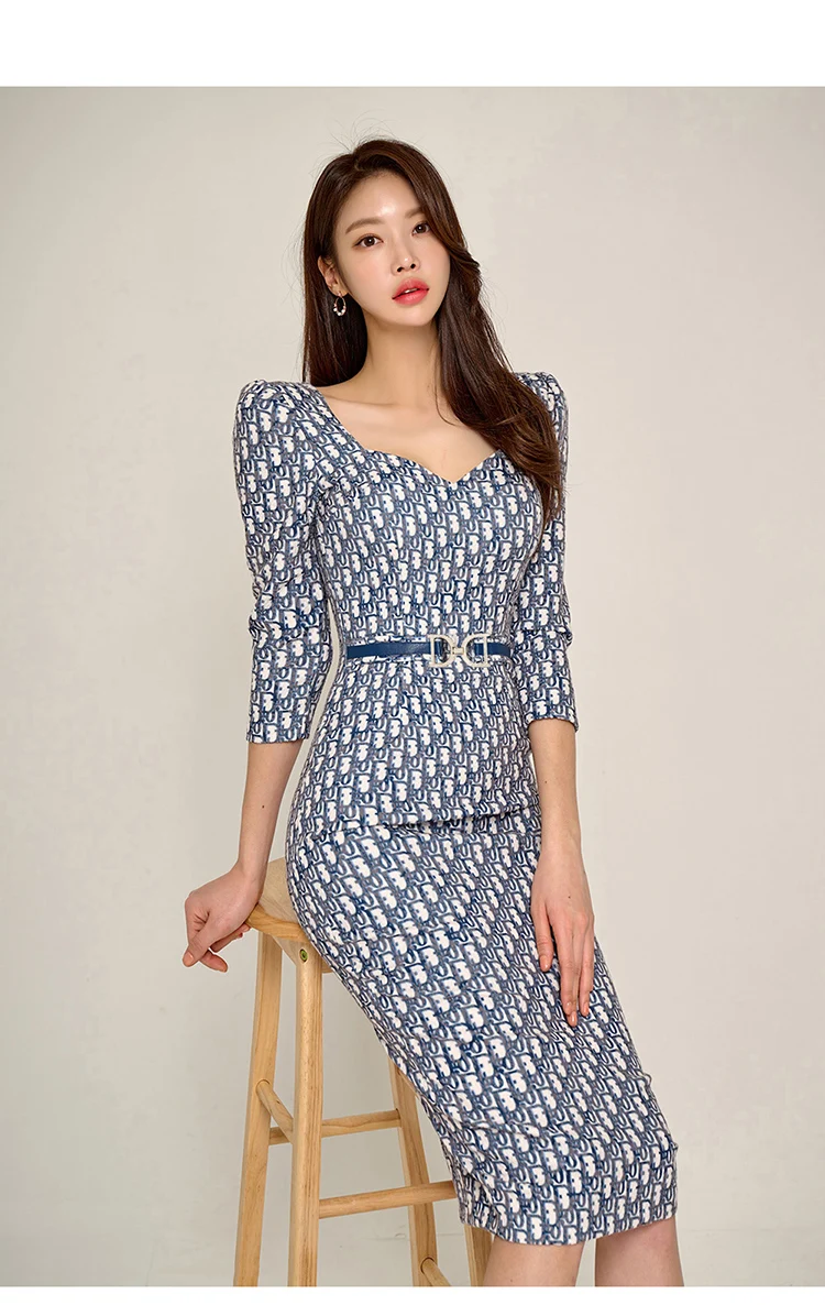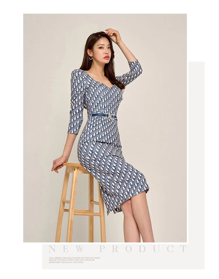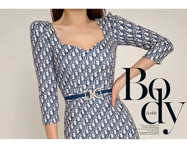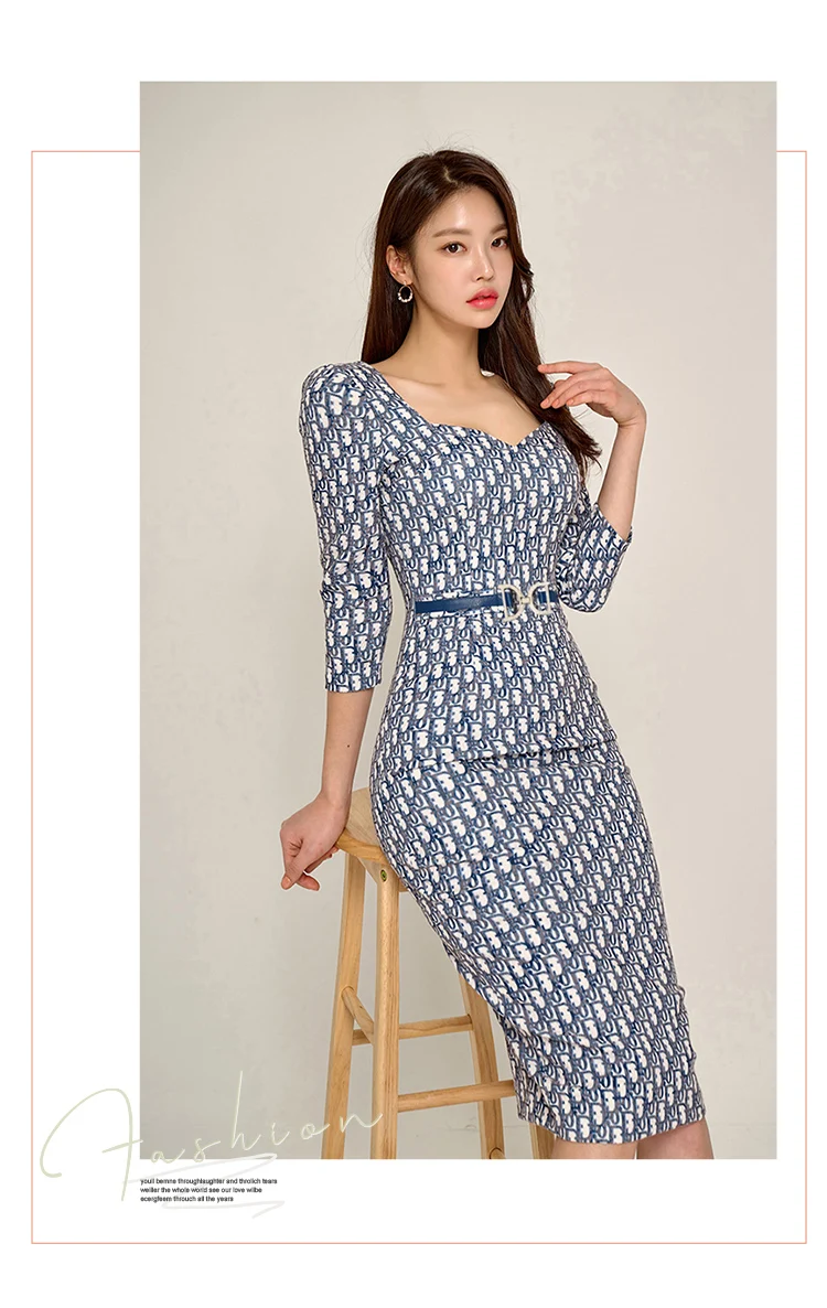 Fleepmart Elegant Formal Dress Vintag Print Square Collar Belt Pencil Dress 2023 Fashion Spring Autumn Slim Bodycon Office Lady Dress