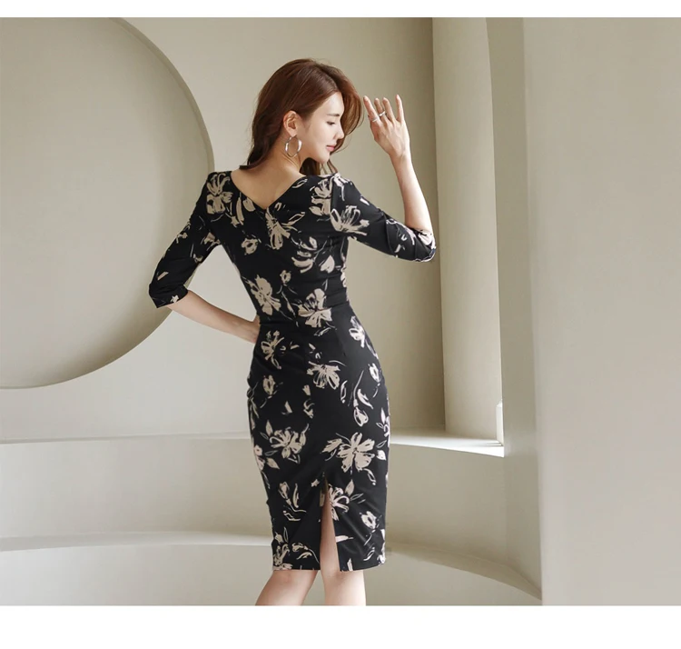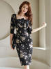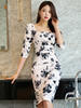 Fleepmart Elegant Formal Party Dress Floral Printed Vintage Square Neck Pencil Dress 2023 Spring Winter Slim Bodycon Office Lady Dress