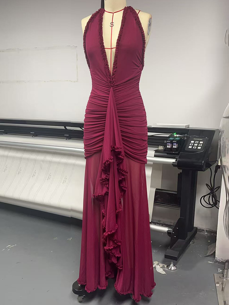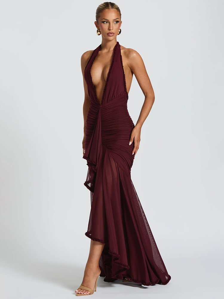 Fleepmart Elegant Halter Deep V Neck Sexy Maxi Dress Women Fashion Sleeveless Backless Ruched Evening Club Party Long Dress