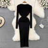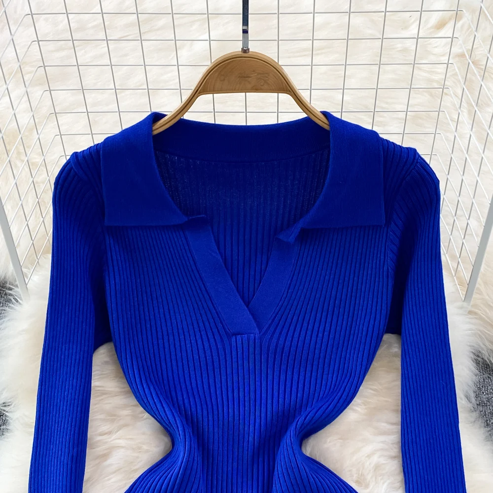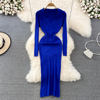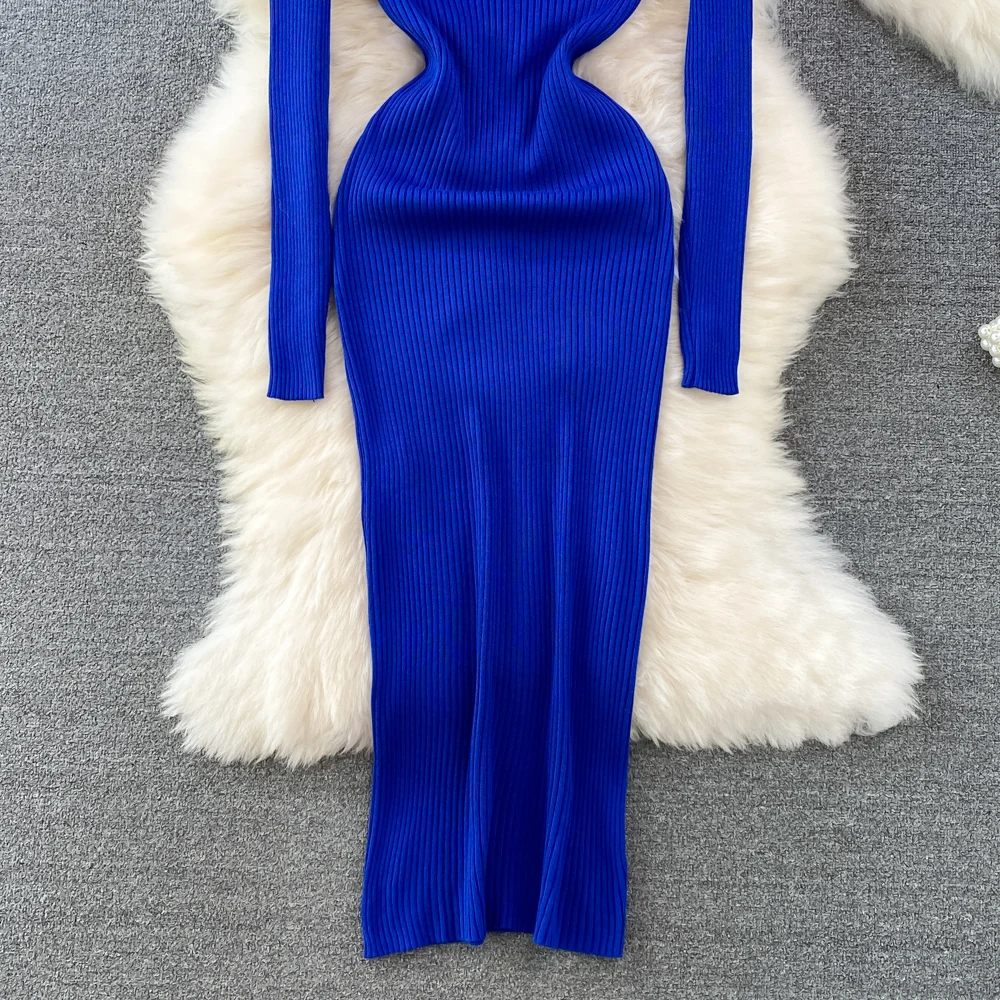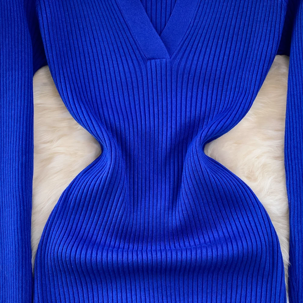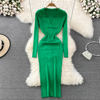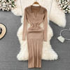 Fleepmart Elegant High Waist V-neck Women’s Knitted Wrap Dresses 2025 New Solid Bottom Long Sleeve Sheath A-line Long Dress Female