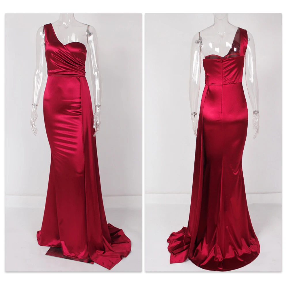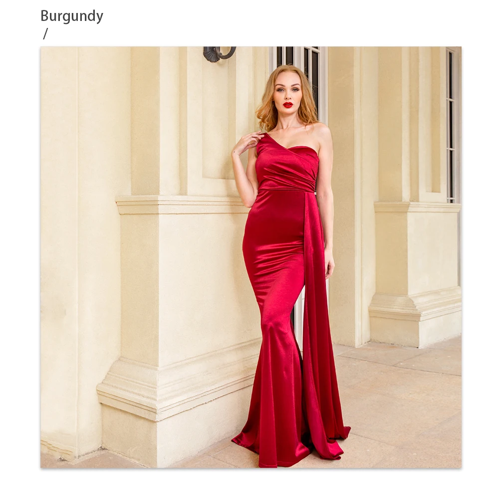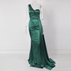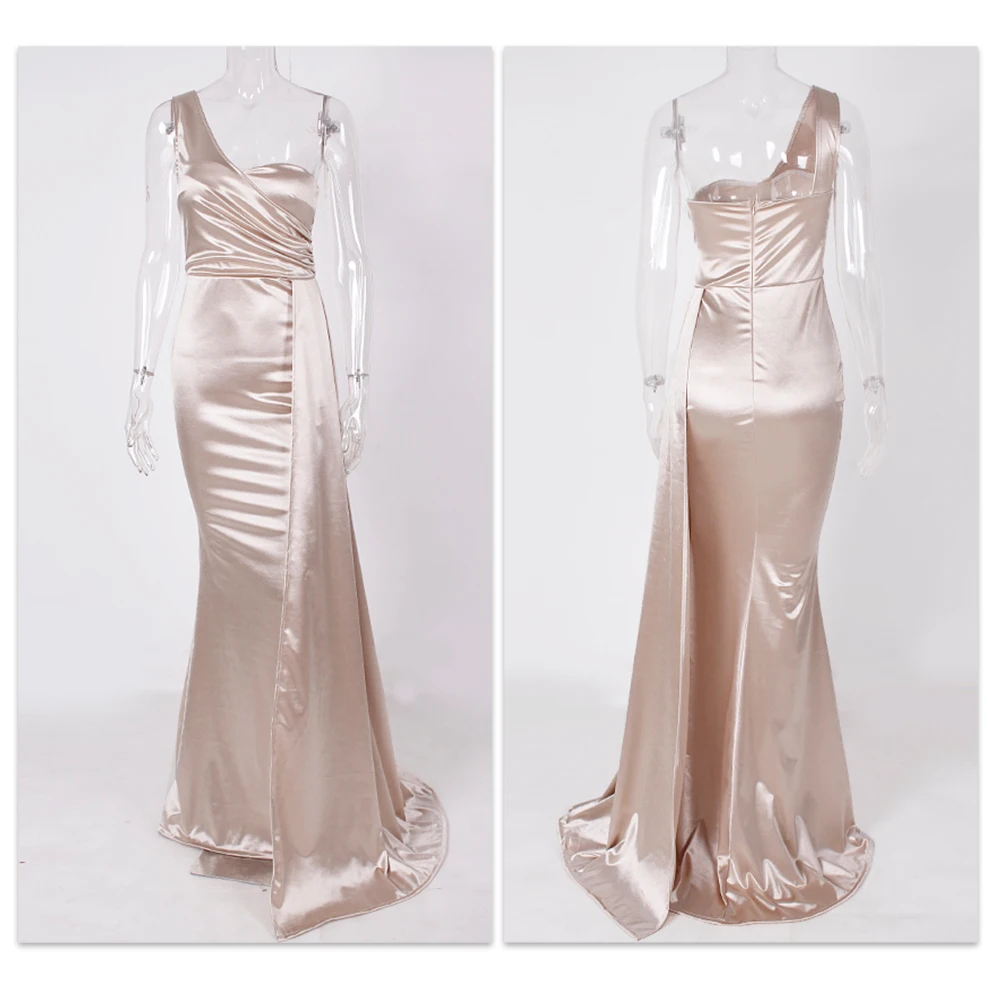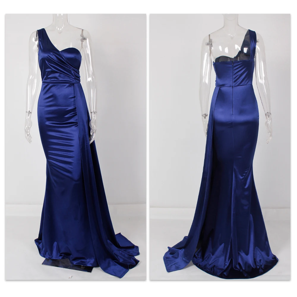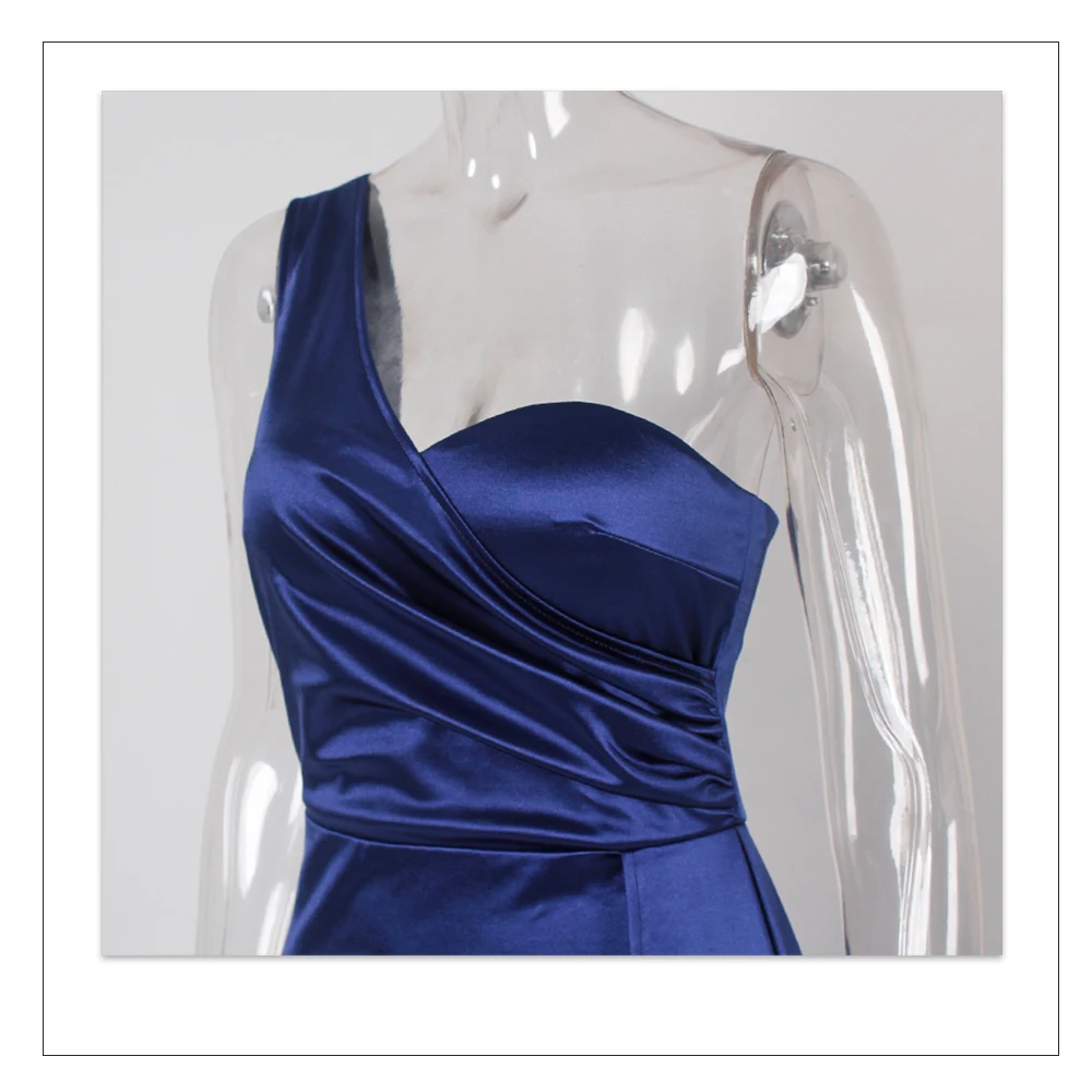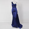 Fleepmart Elegant Ivory One Shoulder Ribbon Summer Dress Padded Pleated Sleeveless Stretchy Satin Women Party Long Tight Blue Dresses 2022