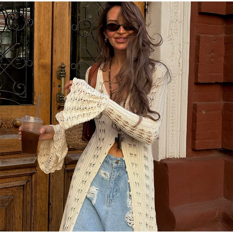 Fleepmart Elegant Knitted Hollow Out Long Dress Women Beach Ruffle Single-breasted Flare Sleeve Cardigan Robe Female Fashion Solid Dresses