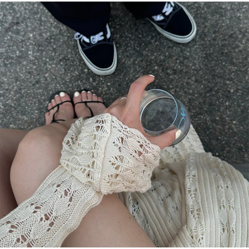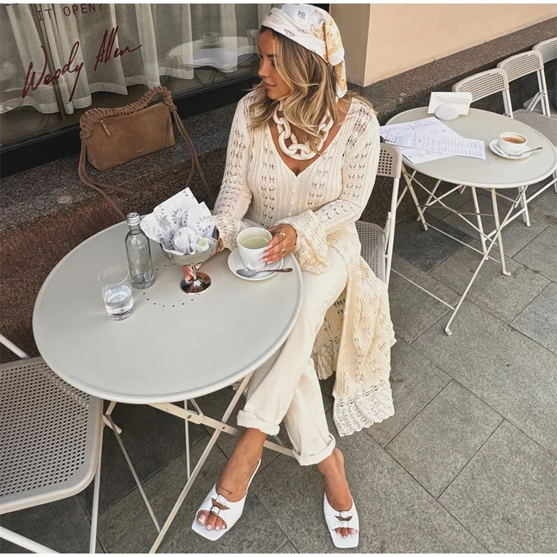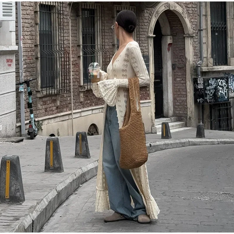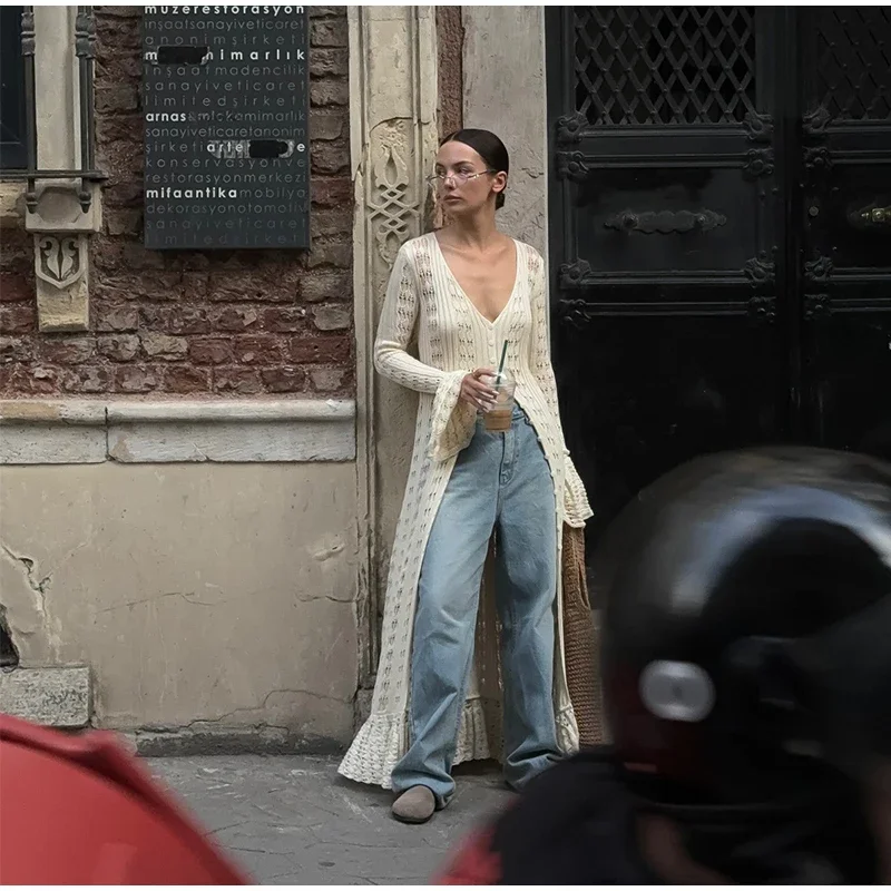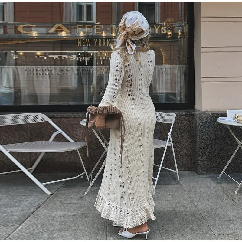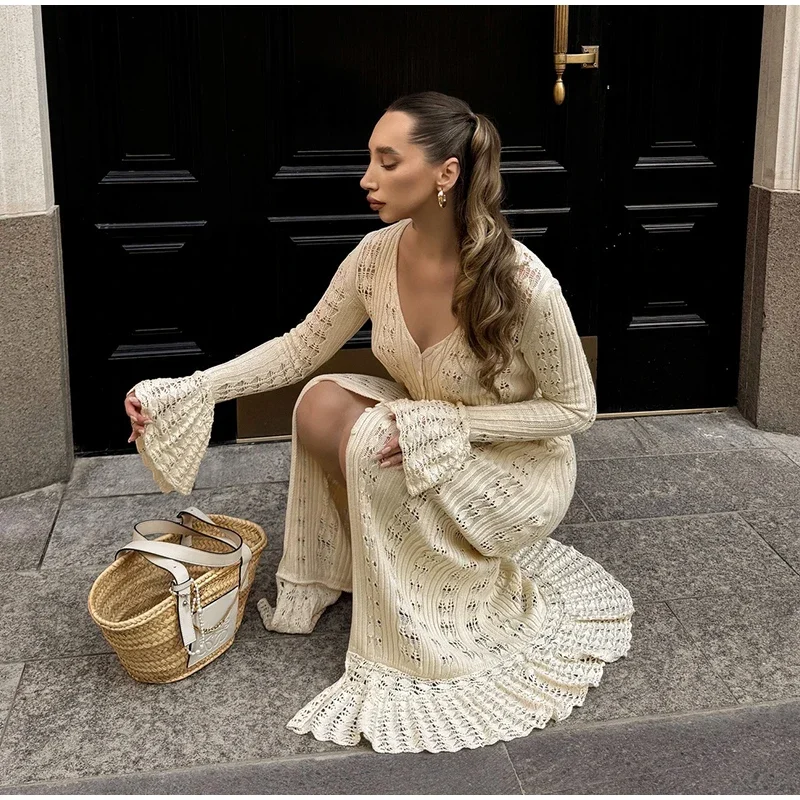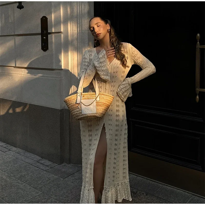 Fleepmart Elegant Knitted Hollow Out Long Dress Women Beach Ruffle Single-breasted Flare Sleeve Cardigan Robe Female Fashion Solid Dresses