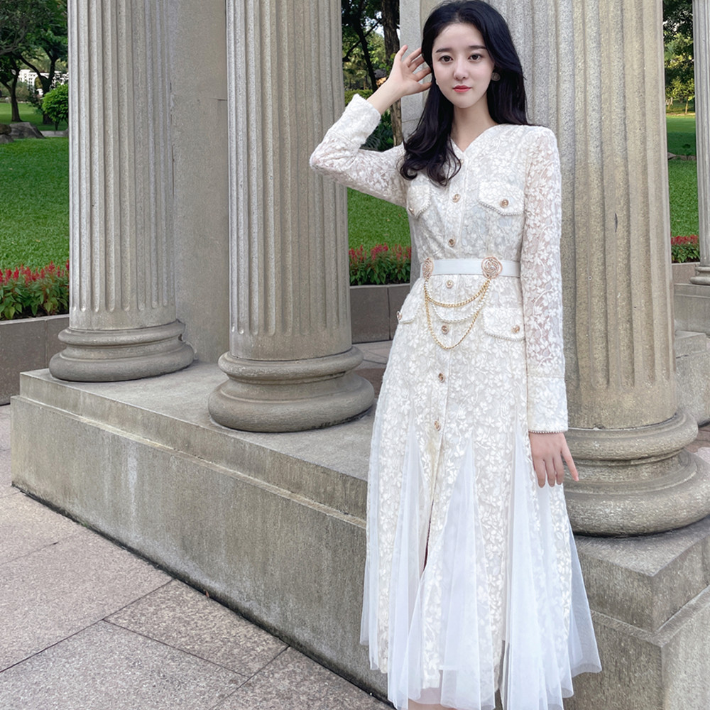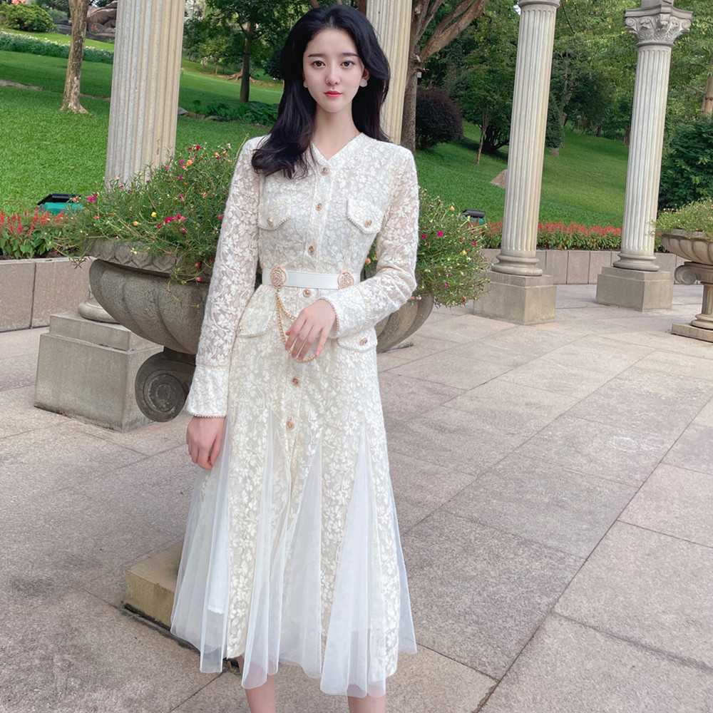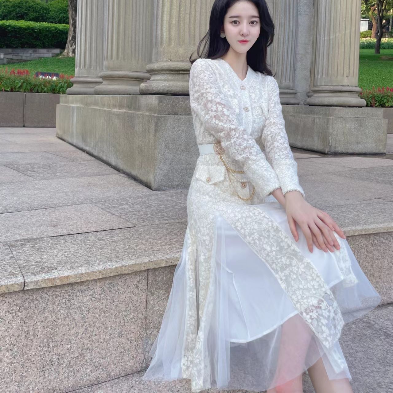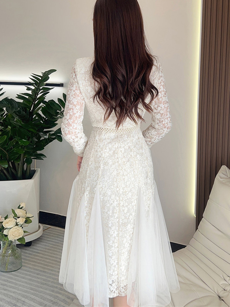 Fleepmart Elegant Ladies V-Neck Lace Dress Women Chic Mesh Stitching Mermaid Dress Women Belt Single Breasted Vestidos Midi