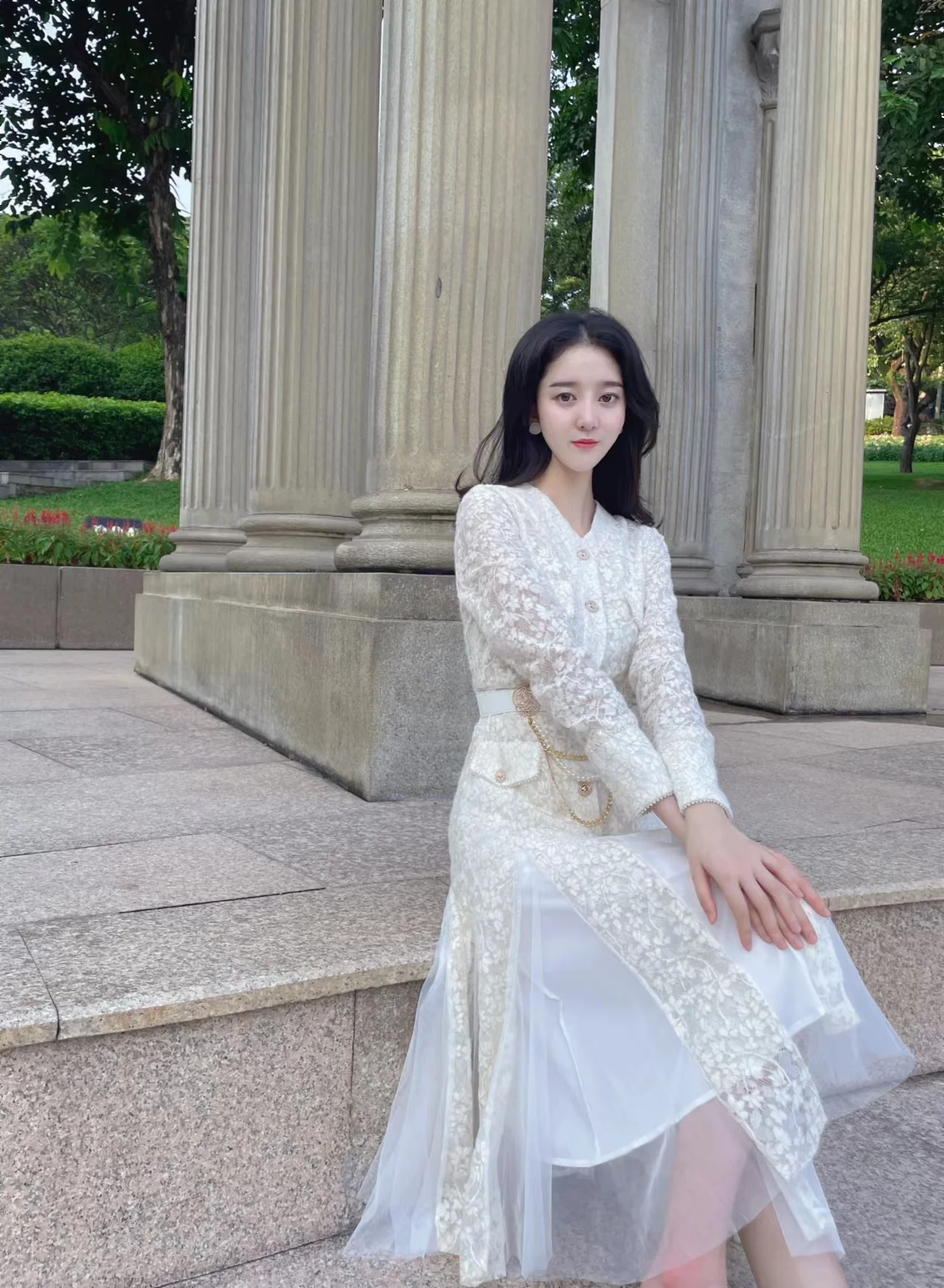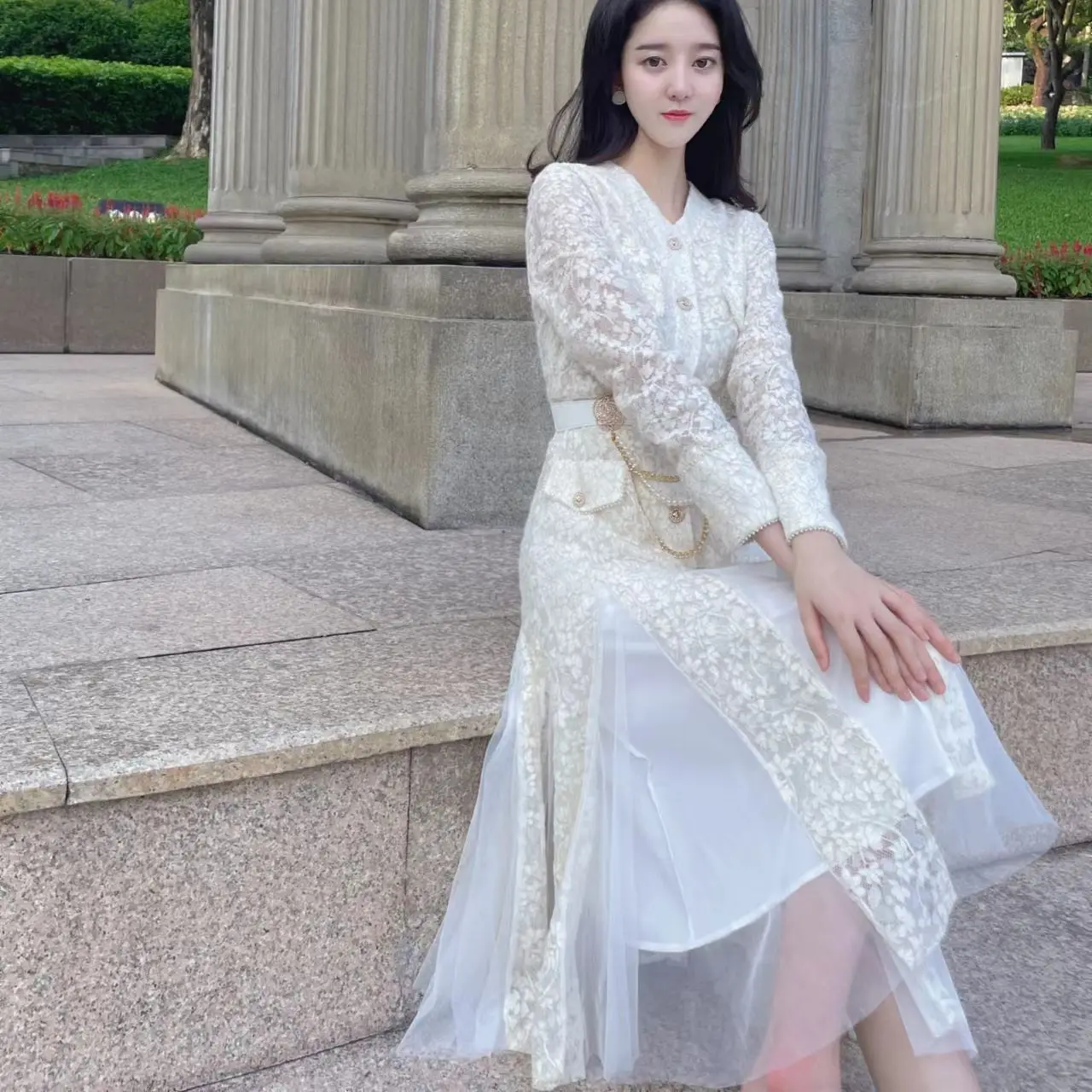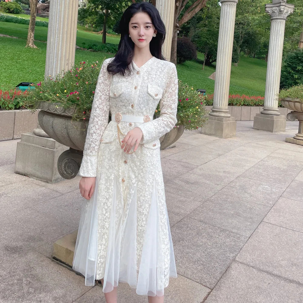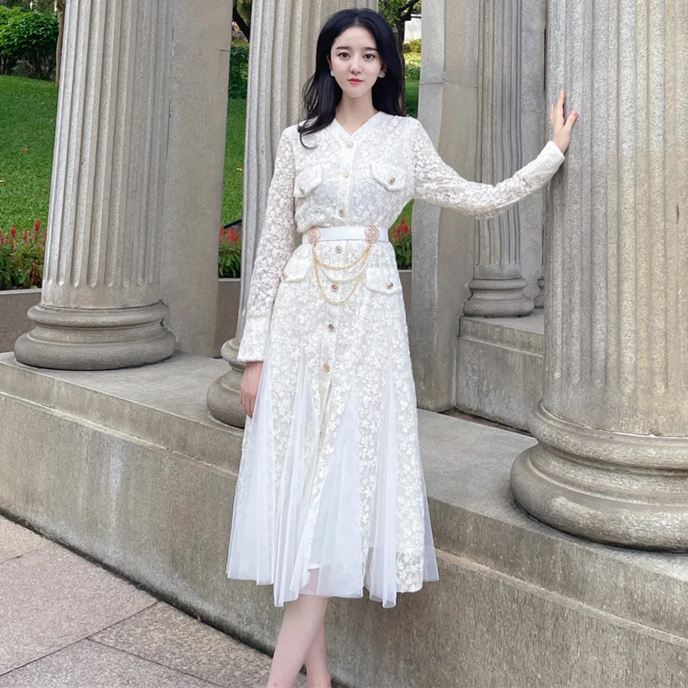 Fleepmart Elegant Ladies V-Neck Lace Dress Women Chic Mesh Stitching Mermaid Dress Women Belt Single Breasted Vestidos Midi
