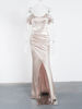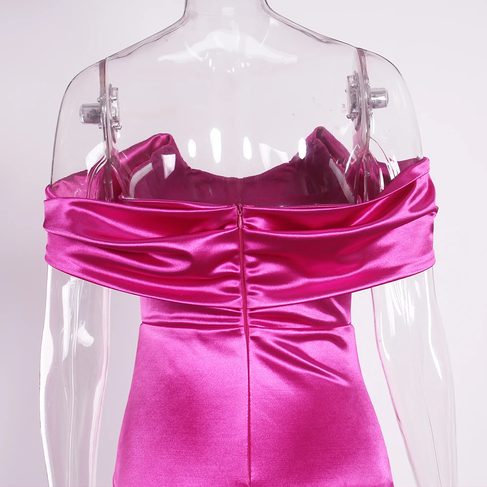 Fleepmart Elegant Off Shouder Fuchsia Stretch Satin Party Dress Boning Pleated Split Dress Long Backless Formal