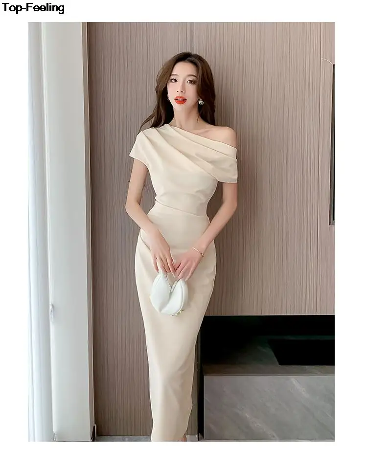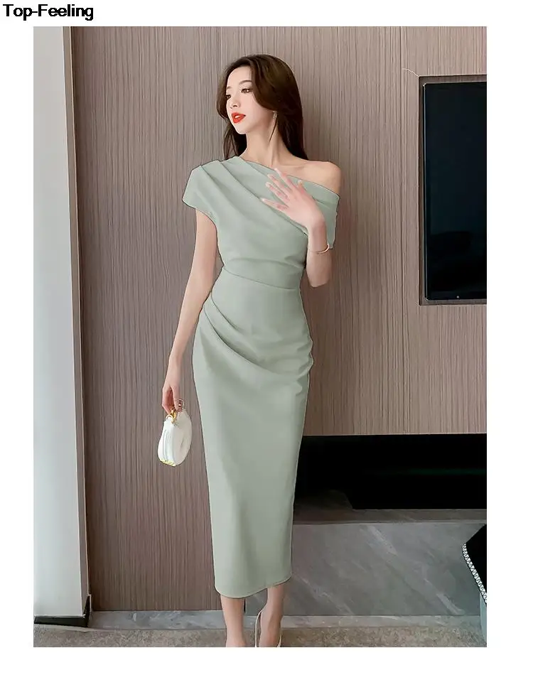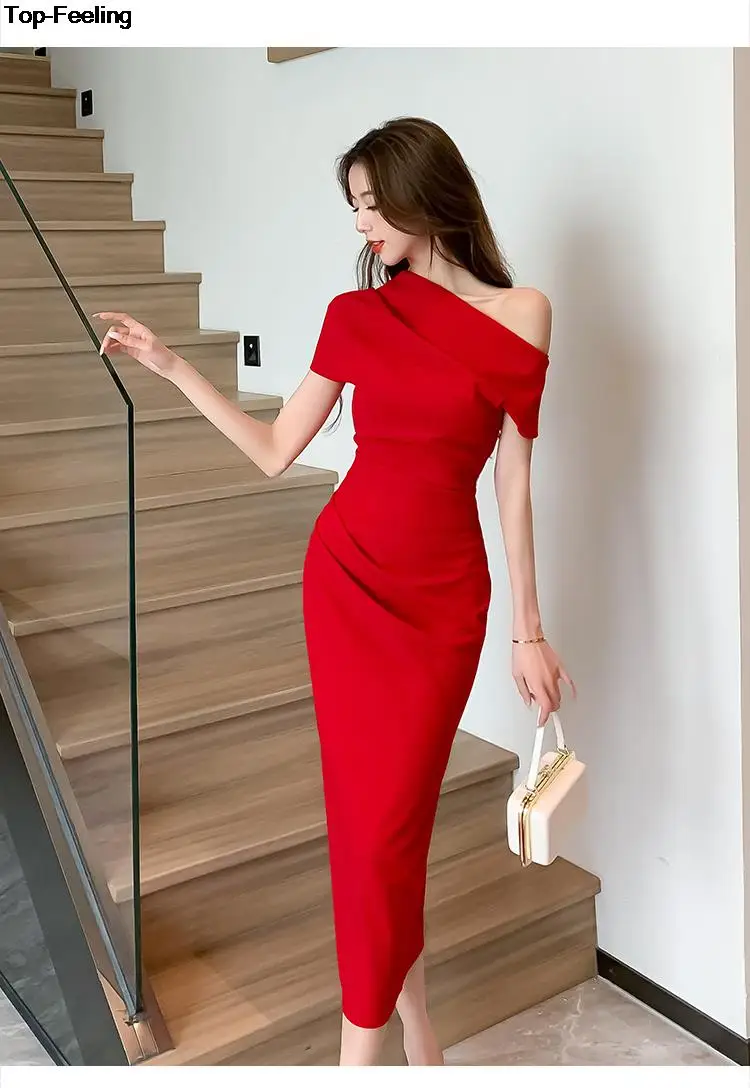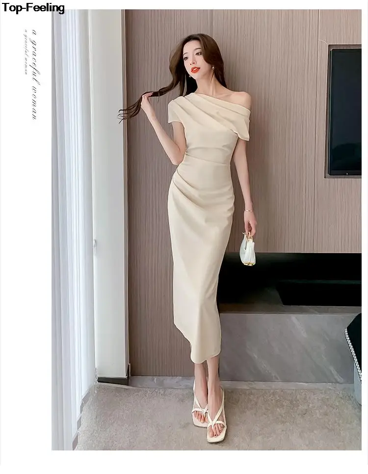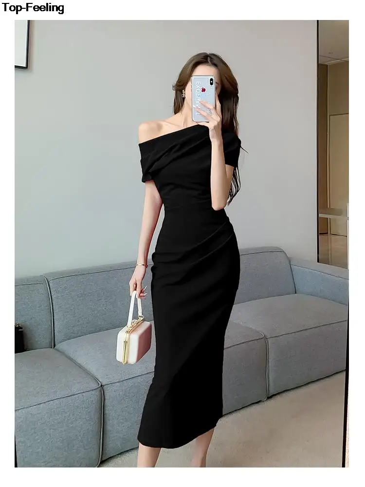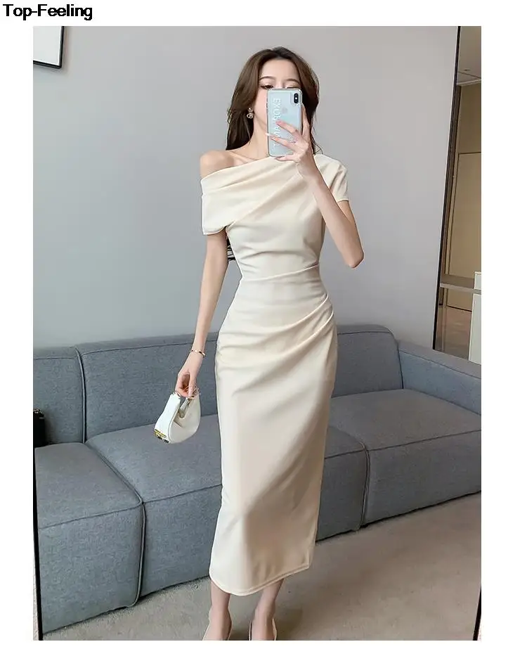 Fleepmart Elegant Off Shoulder Evening Party Dresses Women Summer Fashion Slim One Piece Solid Vestidos Korean Graduation Robe Clothing