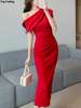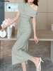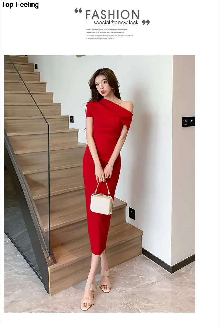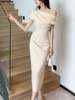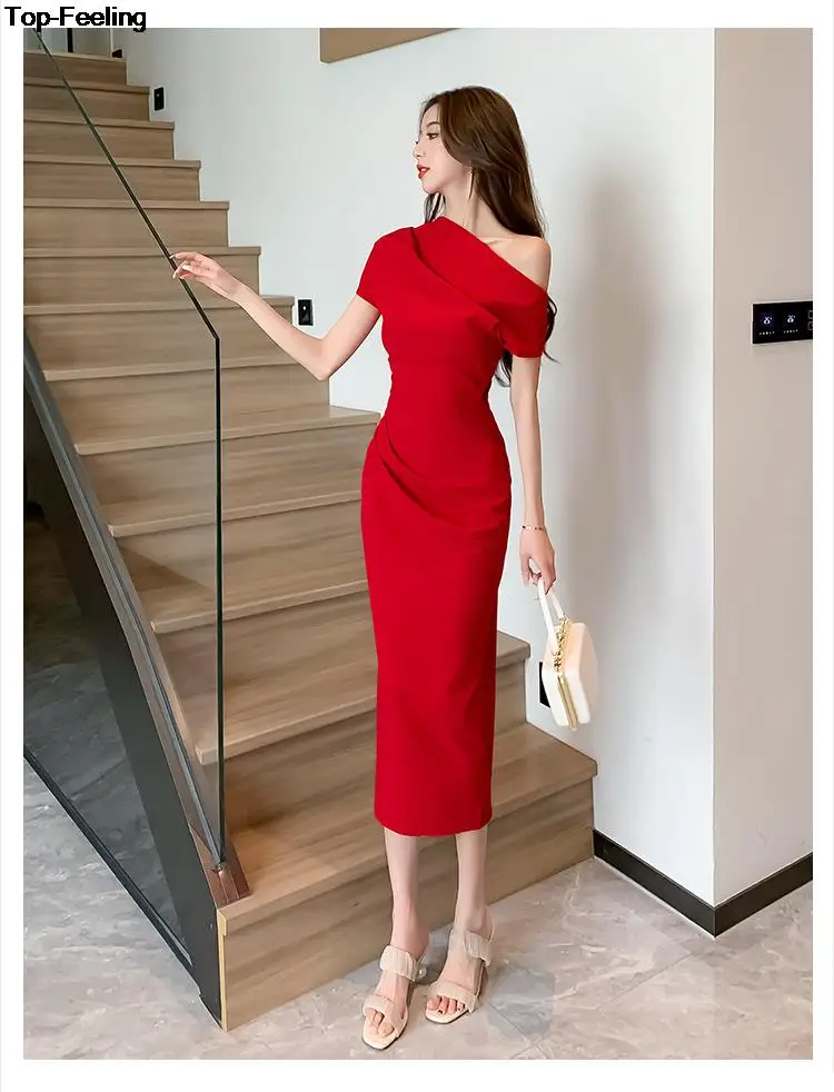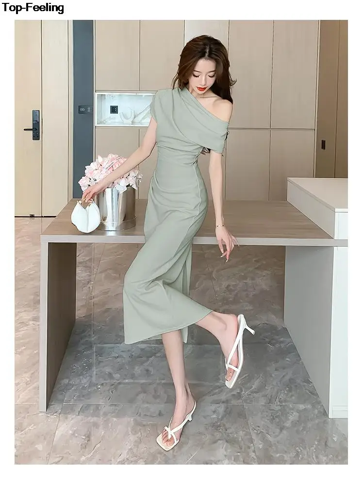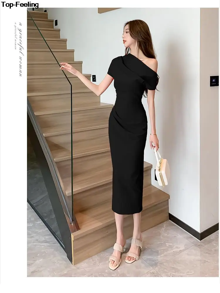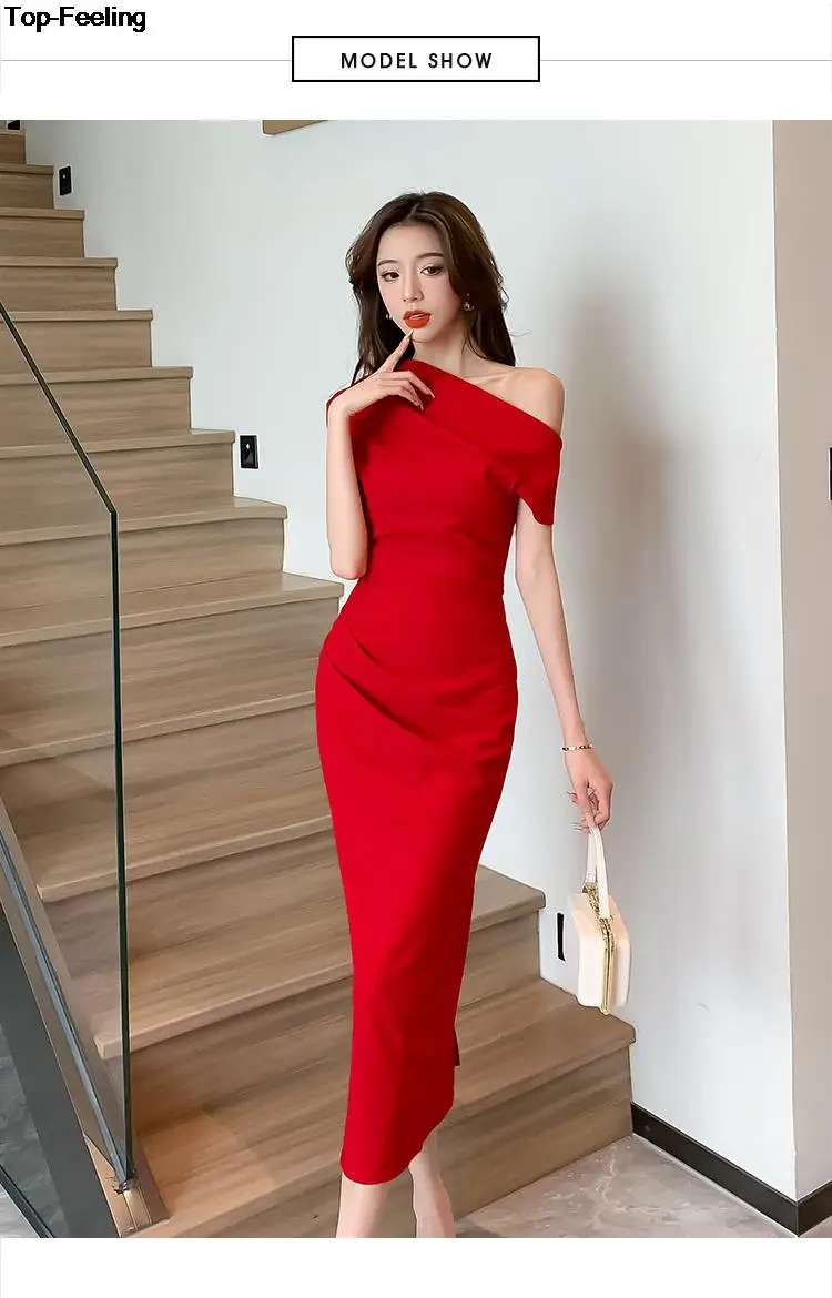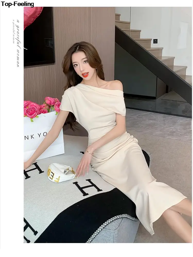 Fleepmart Elegant Off Shoulder Evening Party Dresses Women Summer Fashion Slim One Piece Solid Vestidos Korean Graduation Robe Clothing